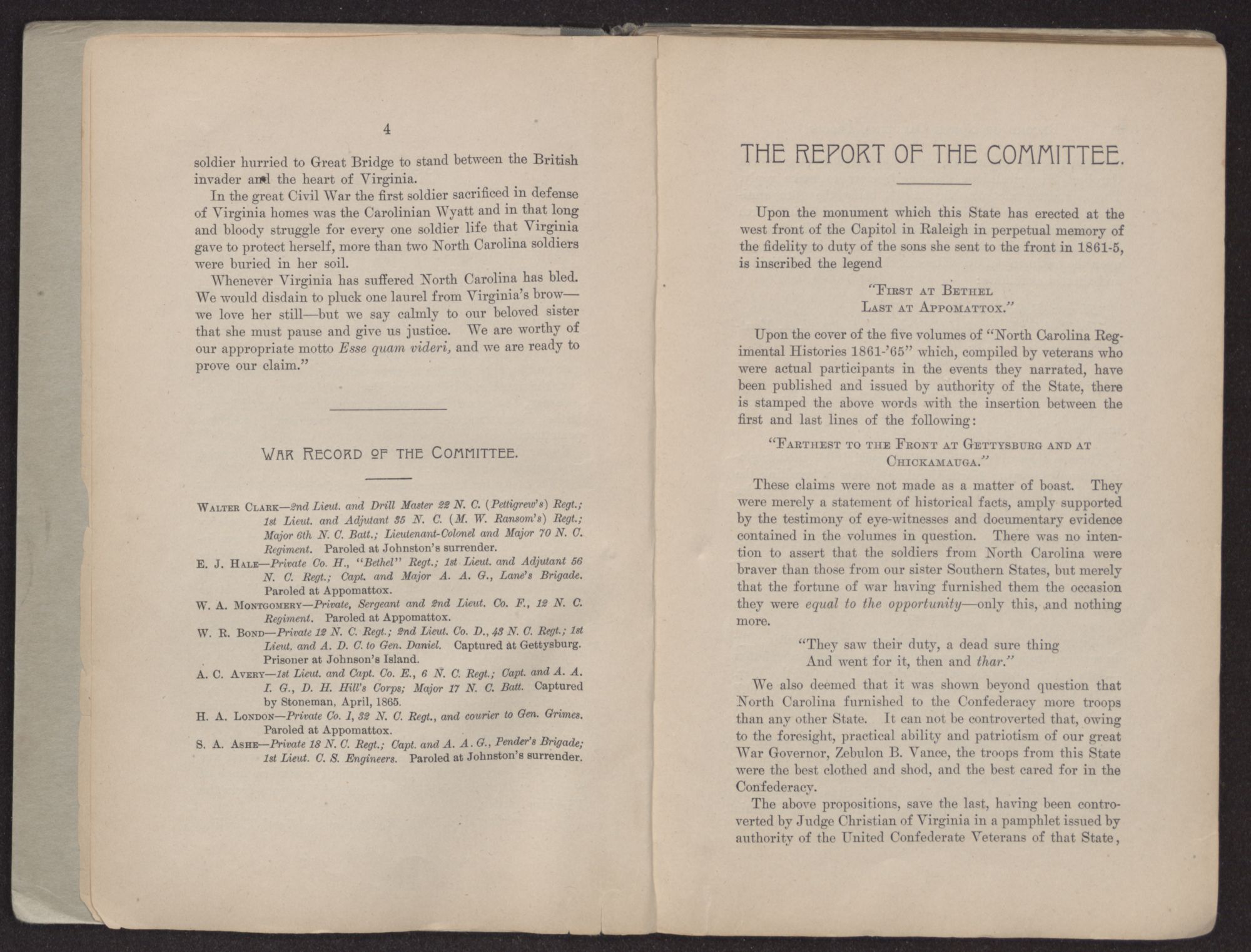 War Record of the Committee.Walter Clark—2nd Lieut. and Drill Master 22 N. C. (Pettigrew's) Regt.; 1st Lieut. and Adjutant 35 N. C. (M. W. Ransom's) Regt.; Major 6th N. C. Batt.; Lieutenant-Colonel and Major 70 N. C. Regiment. Paroled at Johnston's surrender.