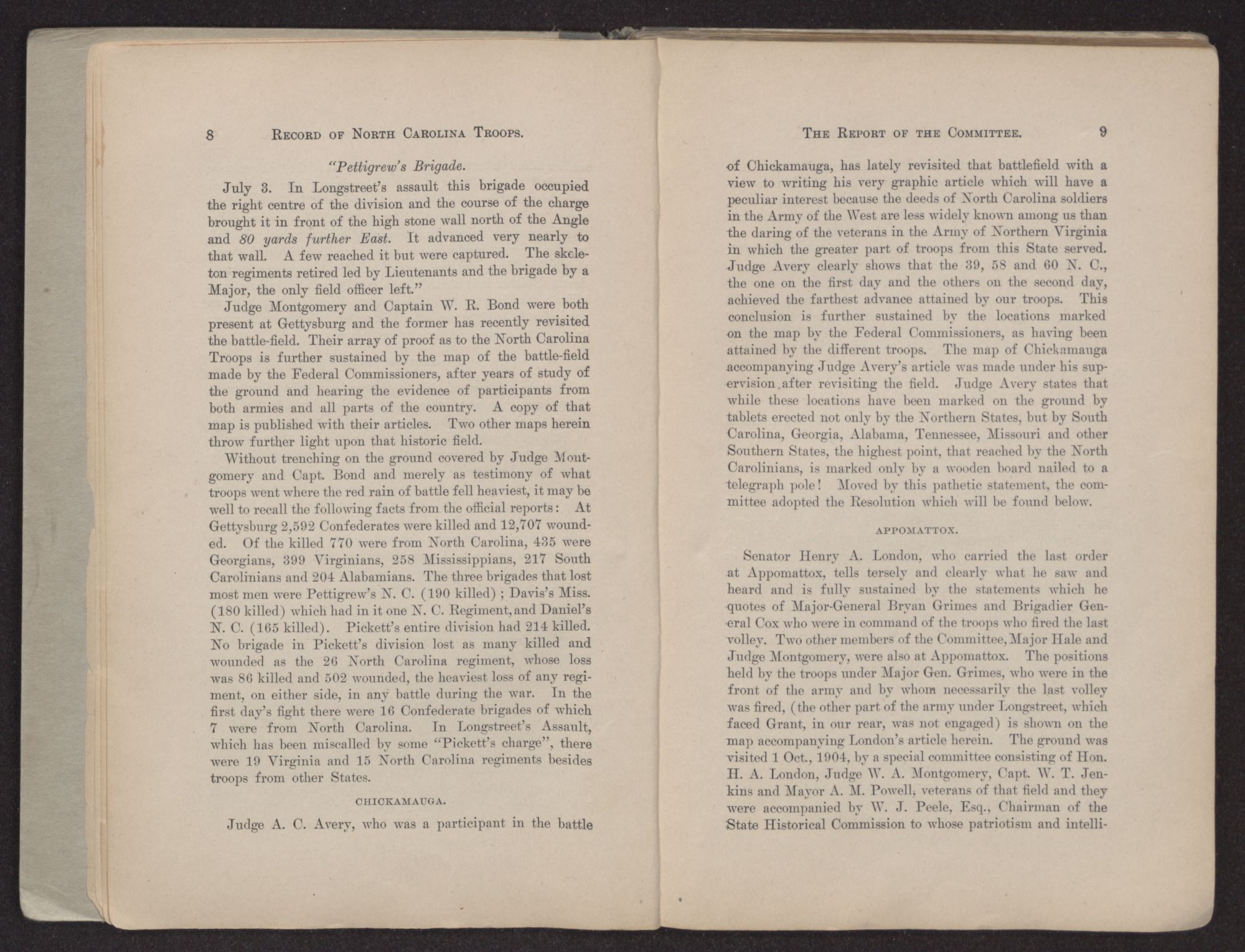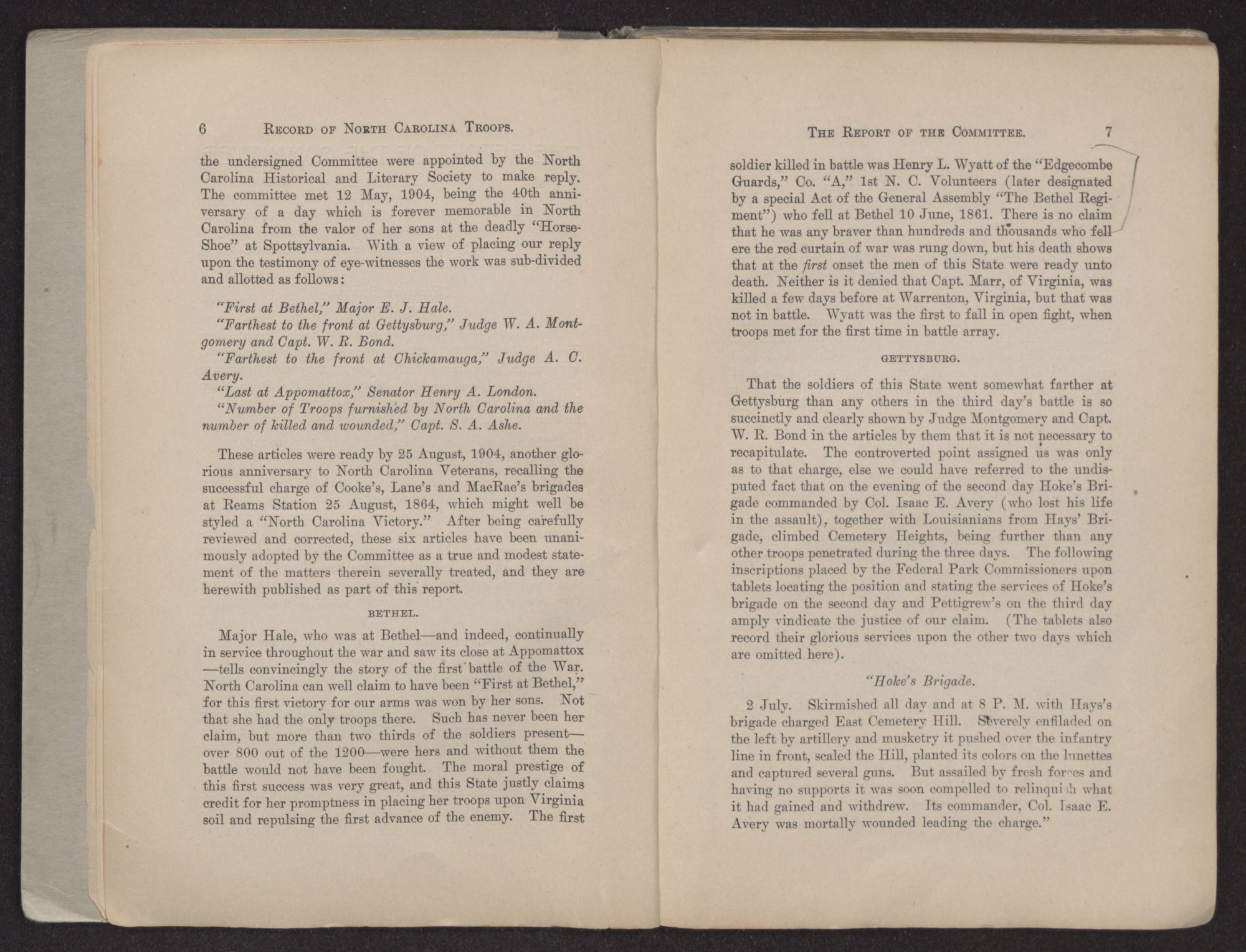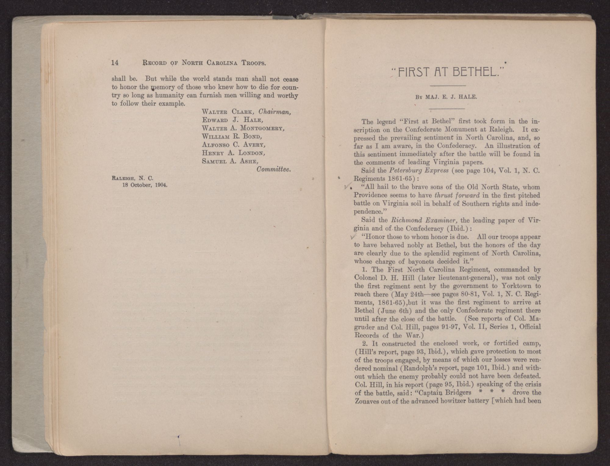 Resolved, That the North Carolina Literary and Historical Association ask the following gentlemen, Chief Justice Walter Clark, Chairman, Capt. S. A. Ashe, Senator H. A. London, Hon. A. C. Avery, Hon. W. A. Montgomery, Major E. J. Hale and Capt. W. R. Bond, to act as a Committee to investigate and report upon the accuracy of North Carolina's claim as to the number of troops furnished by this State to the Confederacy, and upon the merits of our claim as to “First at Bethel, Farthest at Gettysburg and Chickamauga, Last at Appomattox.”