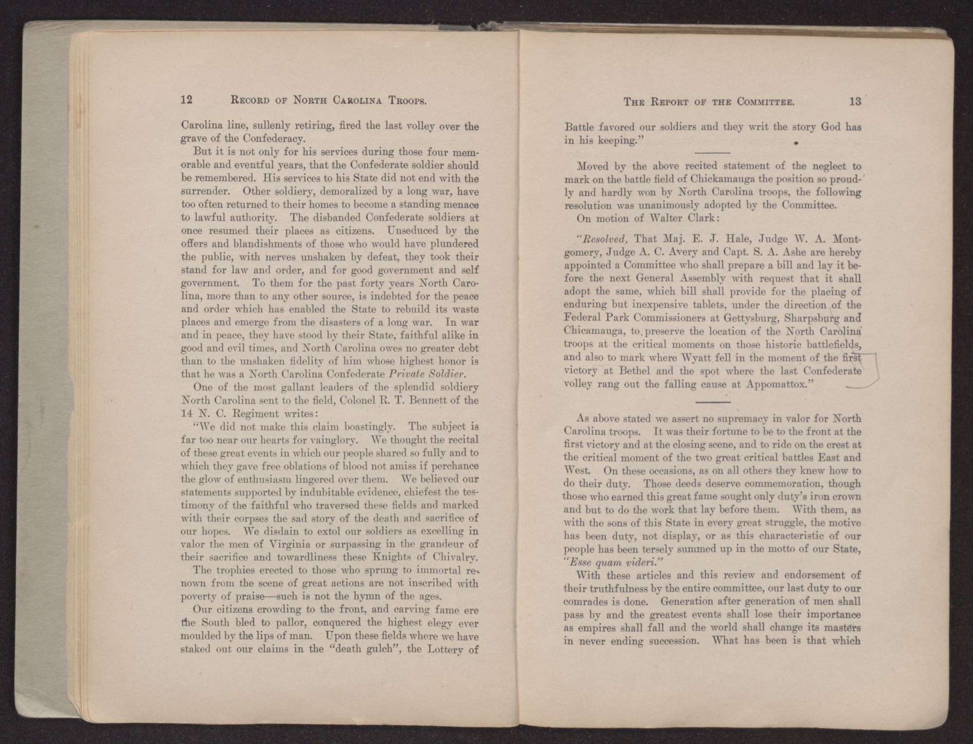 “Resolved, That Maj. E. J. Hale, Judge W. A. Montgomery, Judge A. C. Avery and Capt. S. A. Ashe are hereby appointed a Committee who shall prepare a bill and lay it before the next General Assembly with request that it shall adopt the same, which bill shall provide for the placing of enduring but inexpensive tablets, under the direction of the Federal Park Commissioners at Gettysburg, Sharpsburg and Chicamauga, to preserve the location of the North Carolina troops at the critical moments on those historic battlefields, and also to mark where Wyatt fell in the moment of the first victory at Bethel and the spot where the last Confederate volley rang out the falling cause at Appomattox.”