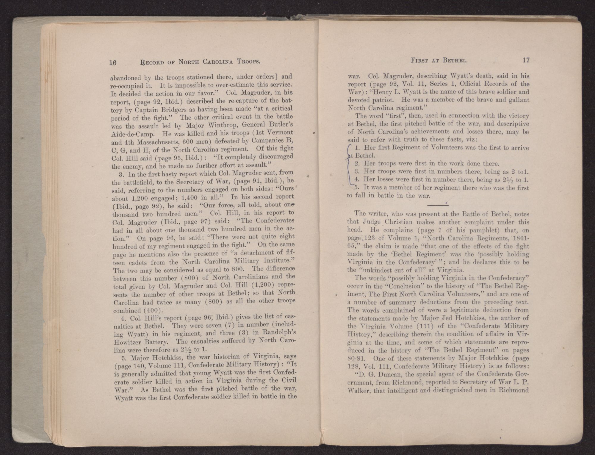 1. The First North Carolina Regiment, commanded by Colonel D. H. Hill (later lieutenant-general), was not only the first regiment sent by the government to Yorktown to reach there (May 24th—see pages 80-81, Vol. 1, N. C. Regiments, 1861-65), but it was the first regiment to arrive at Bethel (June 6th) and the only Confederate regiment there until after the close of the battle. (See reports of Col. Magruder and Col. Hill, pages 91-97, Vol. II, Series 1, Official Records of the War.)