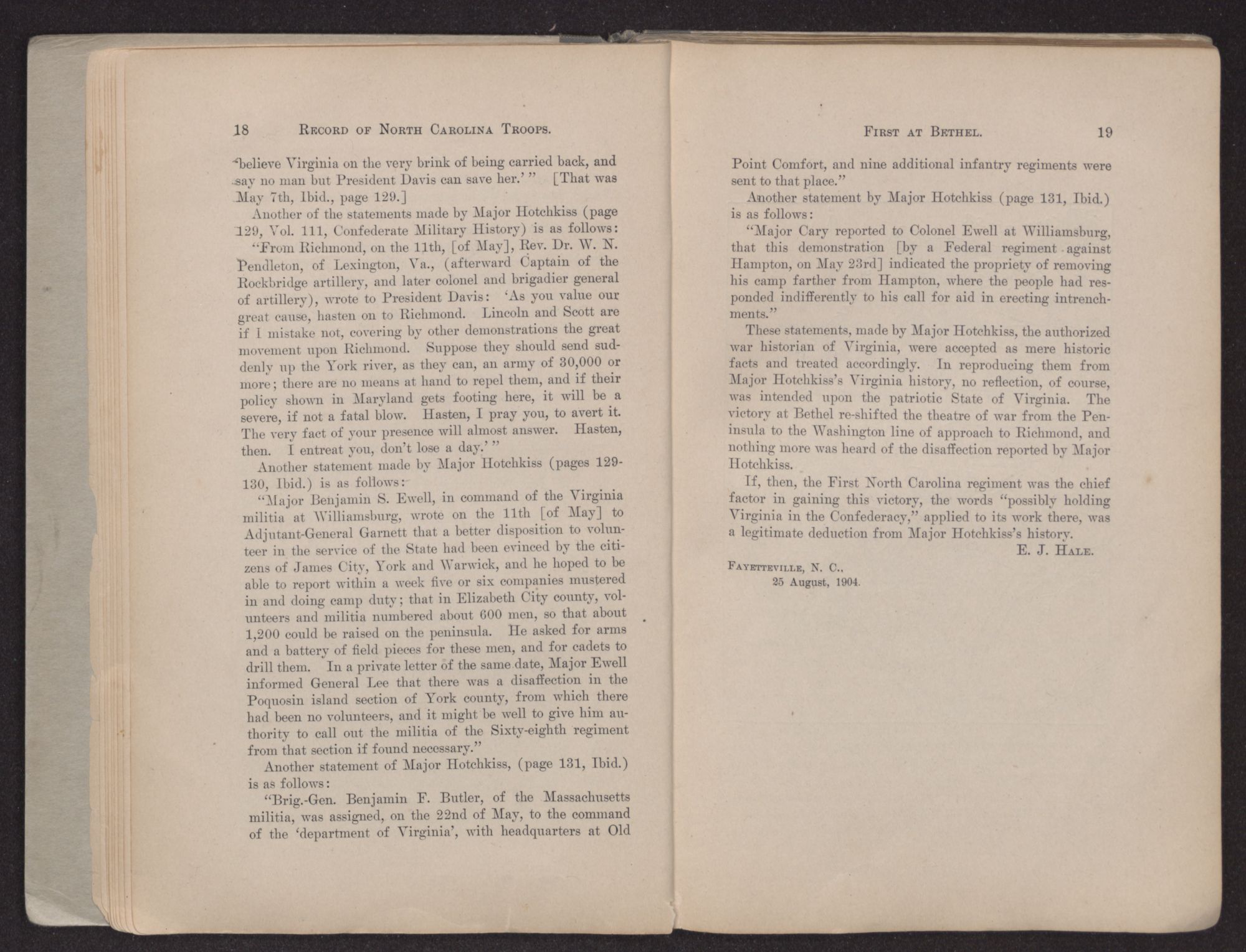 BETHEL.Major Hale, who was at Bethel—and indeed, continually in service throughout the war and saw its close at Appomattox—tells convincingly the story of the first battle of the War. North Carolina can well claim to have been “First at Bethel,” for this first victory for our arms was won by her sons. Not that she had the only troops there. Such has never been her claim, but more than two thirds of the soldiers present—over 800 out of the 1200—were hers and without them the battle would not have been fought. The moral prestige of this first success was very great, and this State justly claims credit for her promptness in placing her troops upon Virginia soil and repulsing the first advance of the enemy. The first
