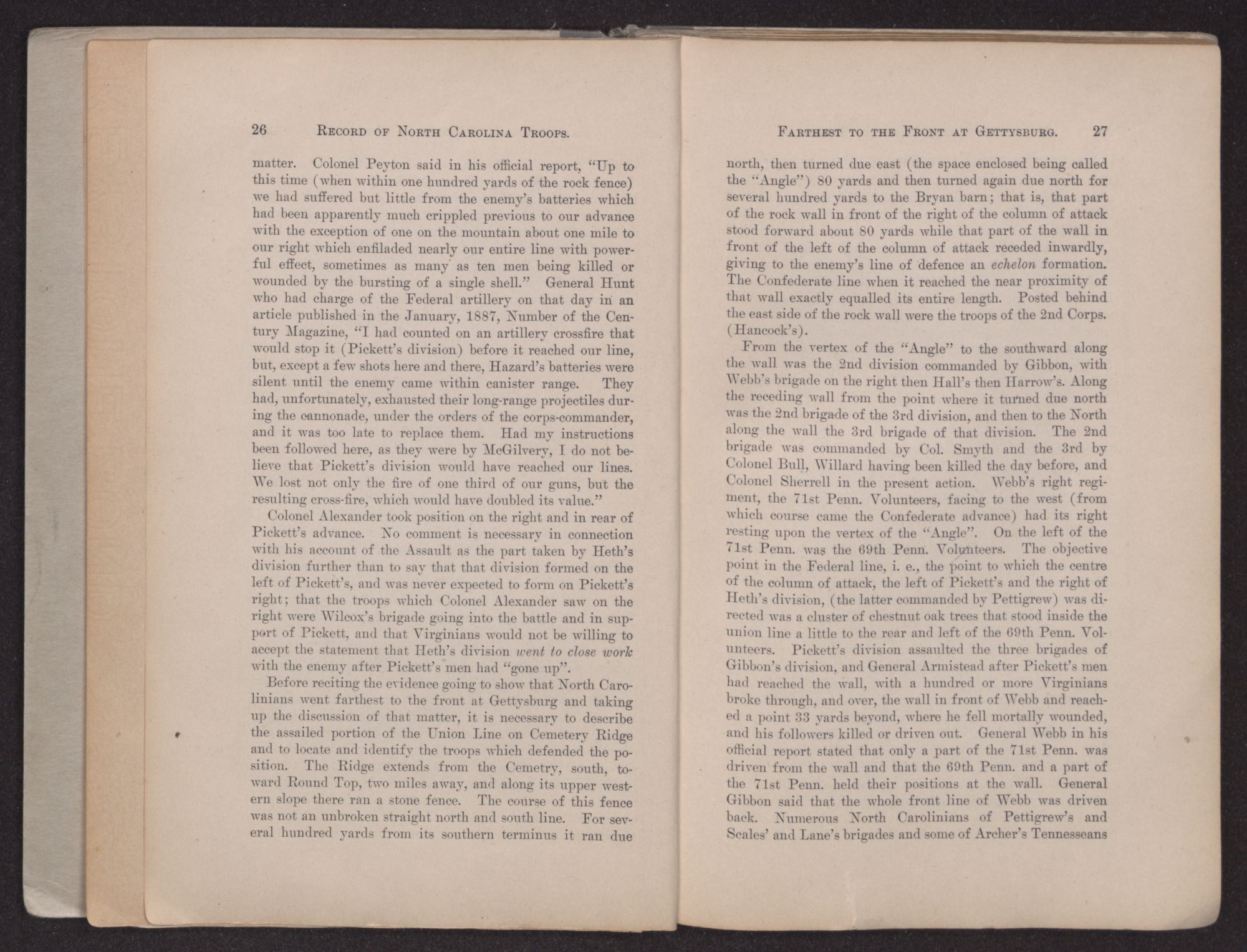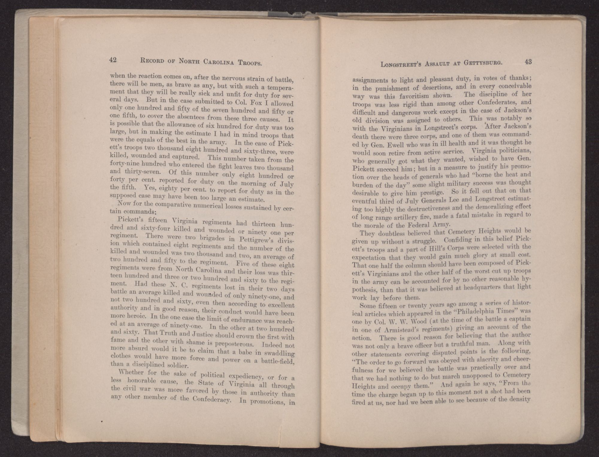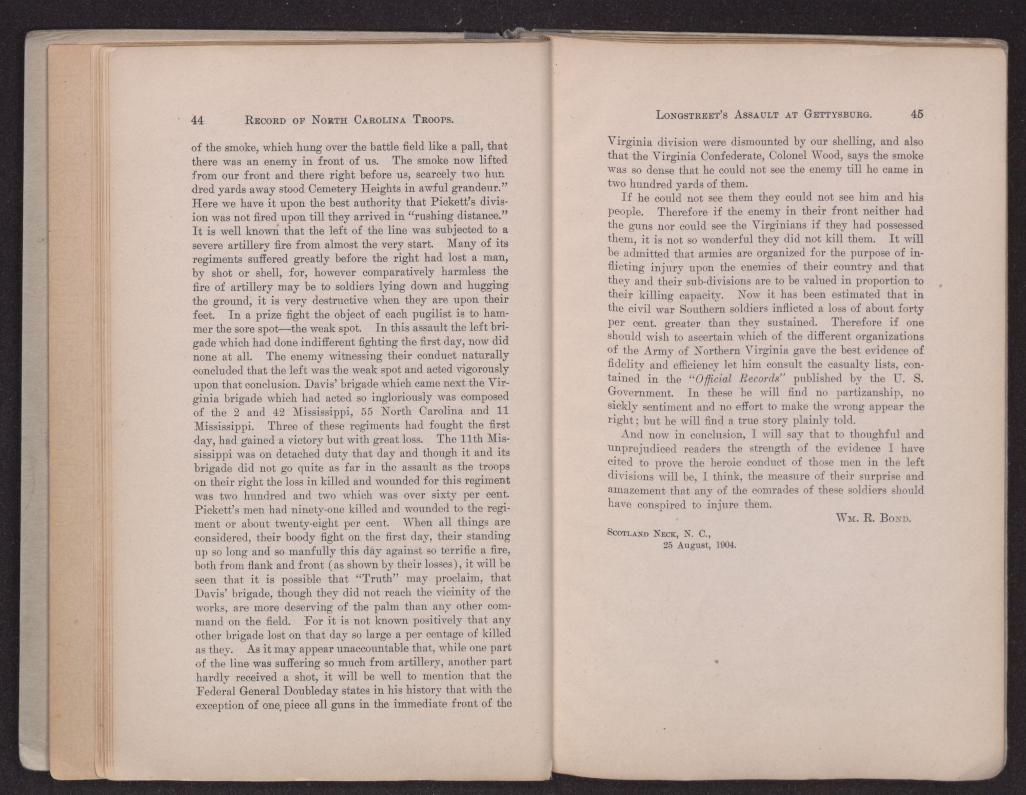 Without trenching on the ground covered by Judge Montgomery and Capt. Bond and merely as testimony of what troops went where the red rain of battle fell heaviest, it may be well to recall the following facts from the official reports: At Gettysburg 2,592 Confederates were killed and 12,707 wounded. Of the killed 770 were from North Carolina, 435 were Georgians, 399 Virginians, 258 Mississippians, 217 South Carolinians and 204 Alabamians. The three brigades that lost most men were Pettigrew's N. C. (190 killed); Davis's Miss. (180 killed) which had in it one N. C. Regiment, and Daniel's N. C. (165 killed). Pickett's entire division had 214 killed. No brigade in Pickett's division lost as many killed and wounded as the 26 North Carolina regiment, whose loss was 86 killed and 502 wounded, the heaviest loss of any regiment, on either side, in any battle during the war. In the first day's fight there were 16 Confederate brigades of which 7 were from North Carolina. In Longstreet's Assault, which has been miscalled by some “Pickett's charge”, there were 19 Virginia and 15 North Carolina regiments besides troops from other States.