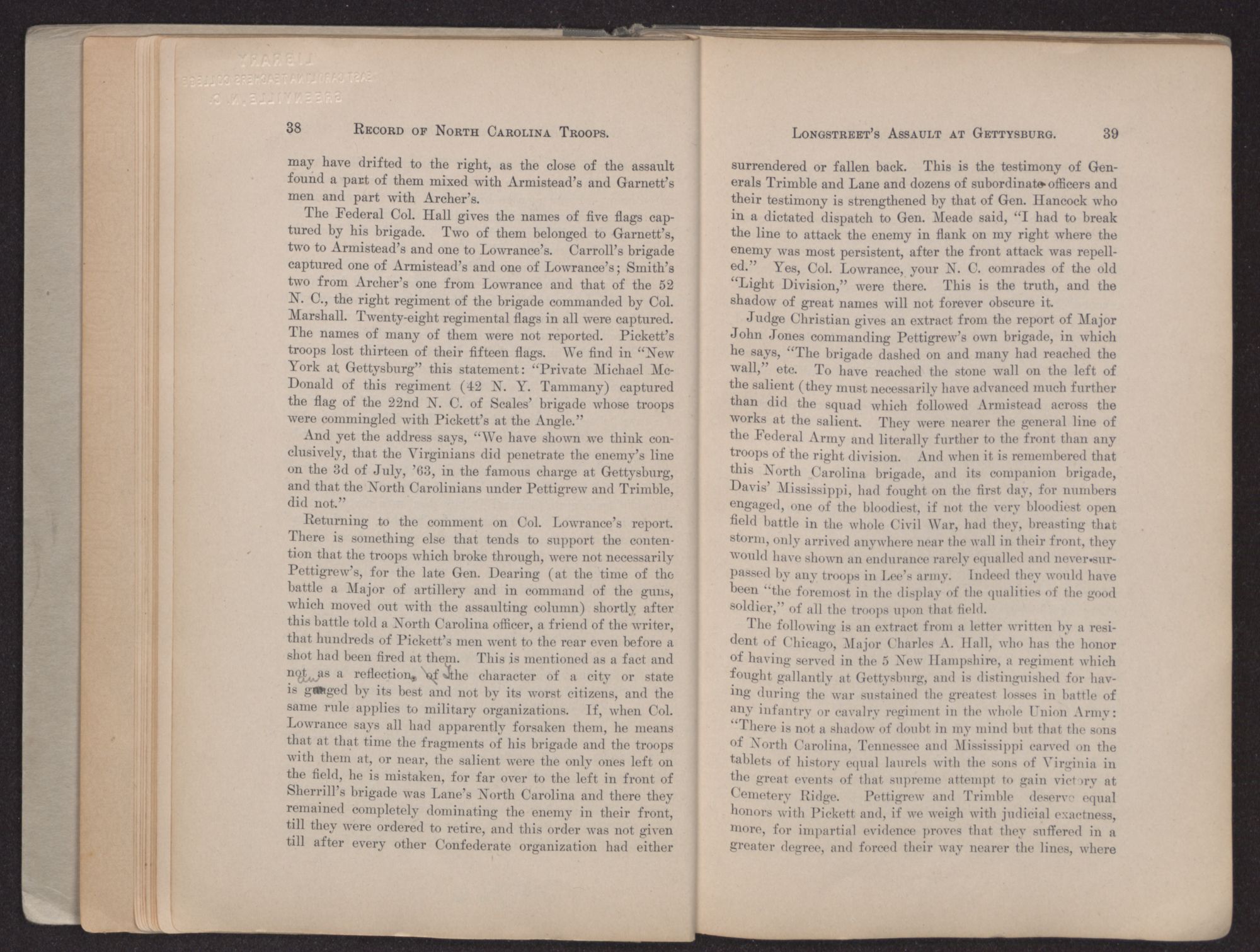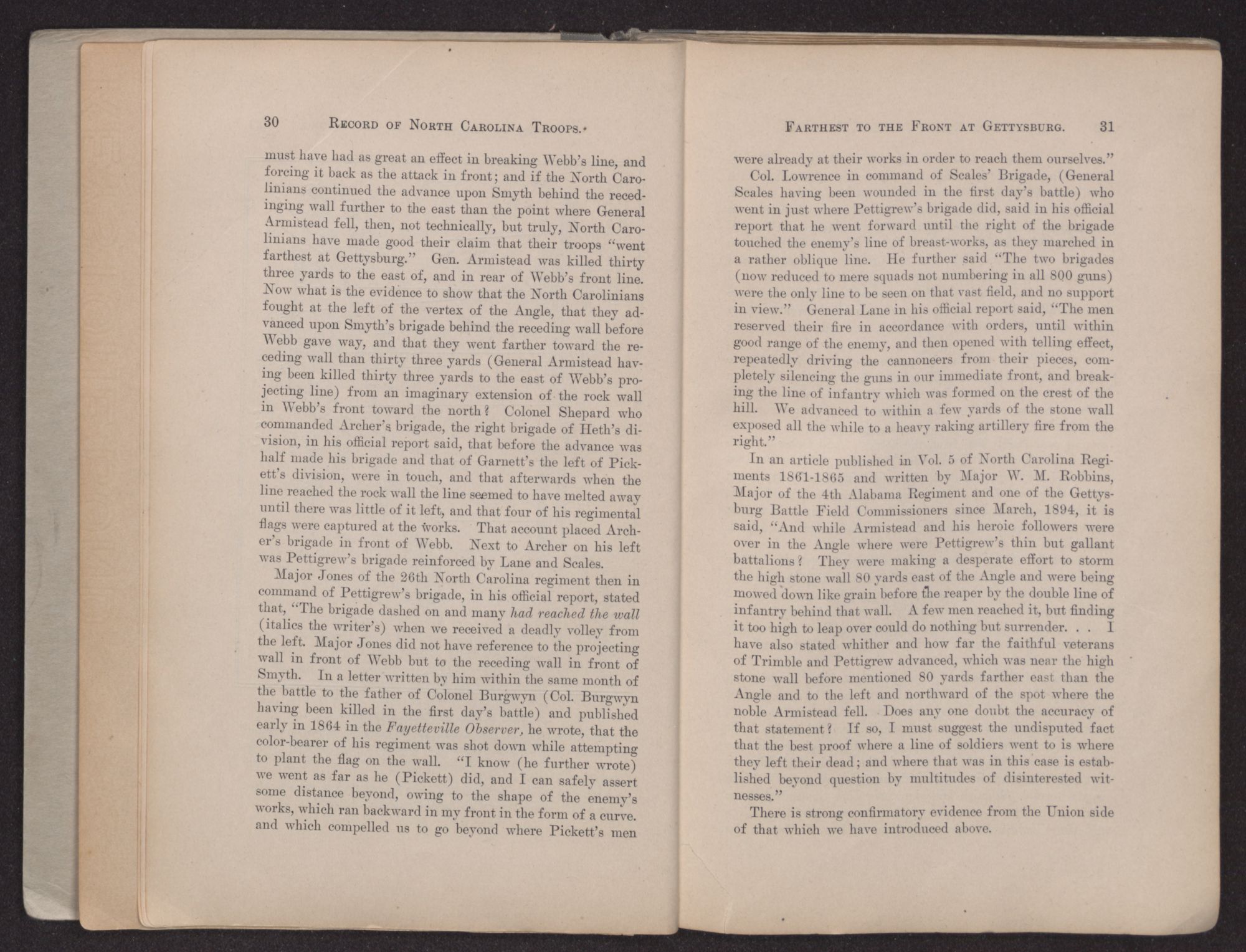GETTYSBURG.That the soldiers of this State went somewhat farther at Gettysburg than any others in the third day's battle is so succinctly and clearly shown by Judge Montgomery and Capt. W. R. Bond in the articles by them that it is not necessary to recapitulate. The controverted point assigned us was only as to that charge, else we could have referred to the undisputed fact that on the evening of the second day Hoke's Brigade commanded by Col. Isaac E. Avery (who lost his life in the assault), together with Louisianians from Hays’ Brigade, climbed Cemetery Heights, being further than any other troops penetrated during the three days. The following inscriptions placed by the Federal Park Commissioners upon tablets locating the position and stating the services of Hoke's brigade on the second day and Pettigrew's on the third day amply vindicate the justice of our claim. (The tablets also record their glorious services upon the other two days which are omitted here).