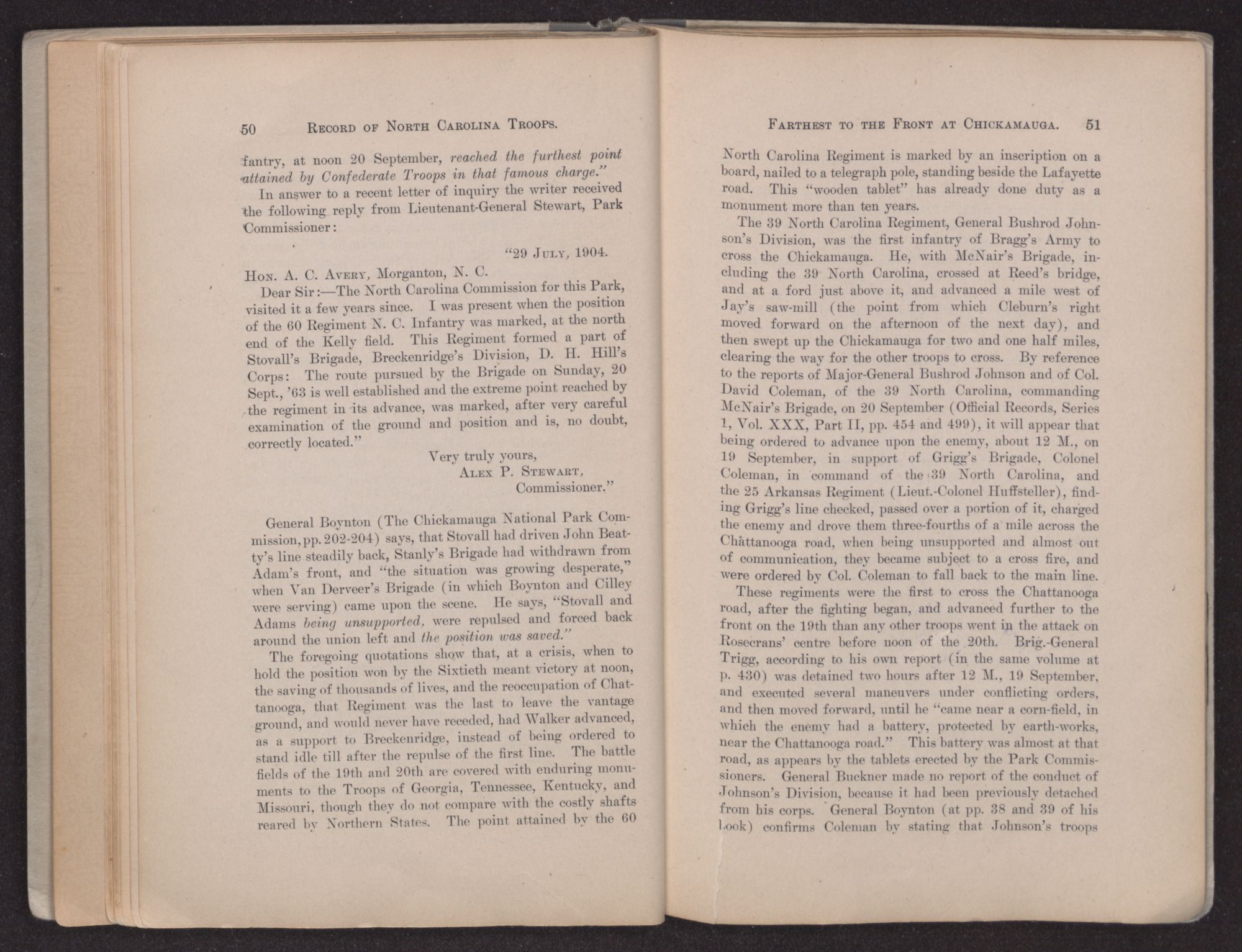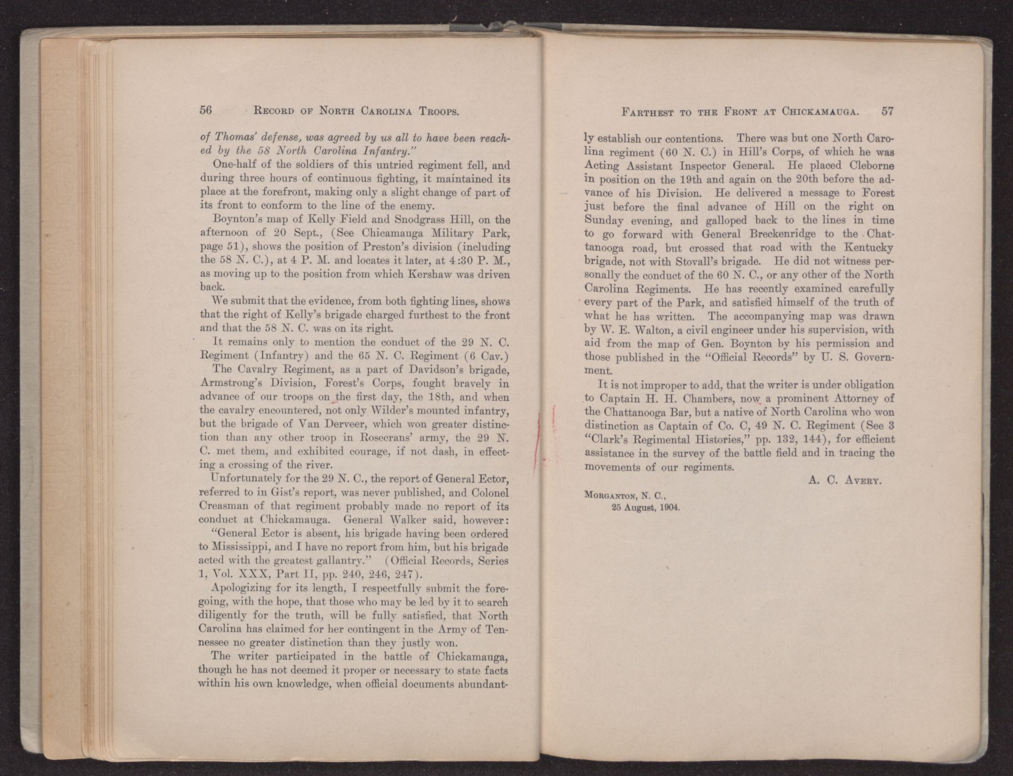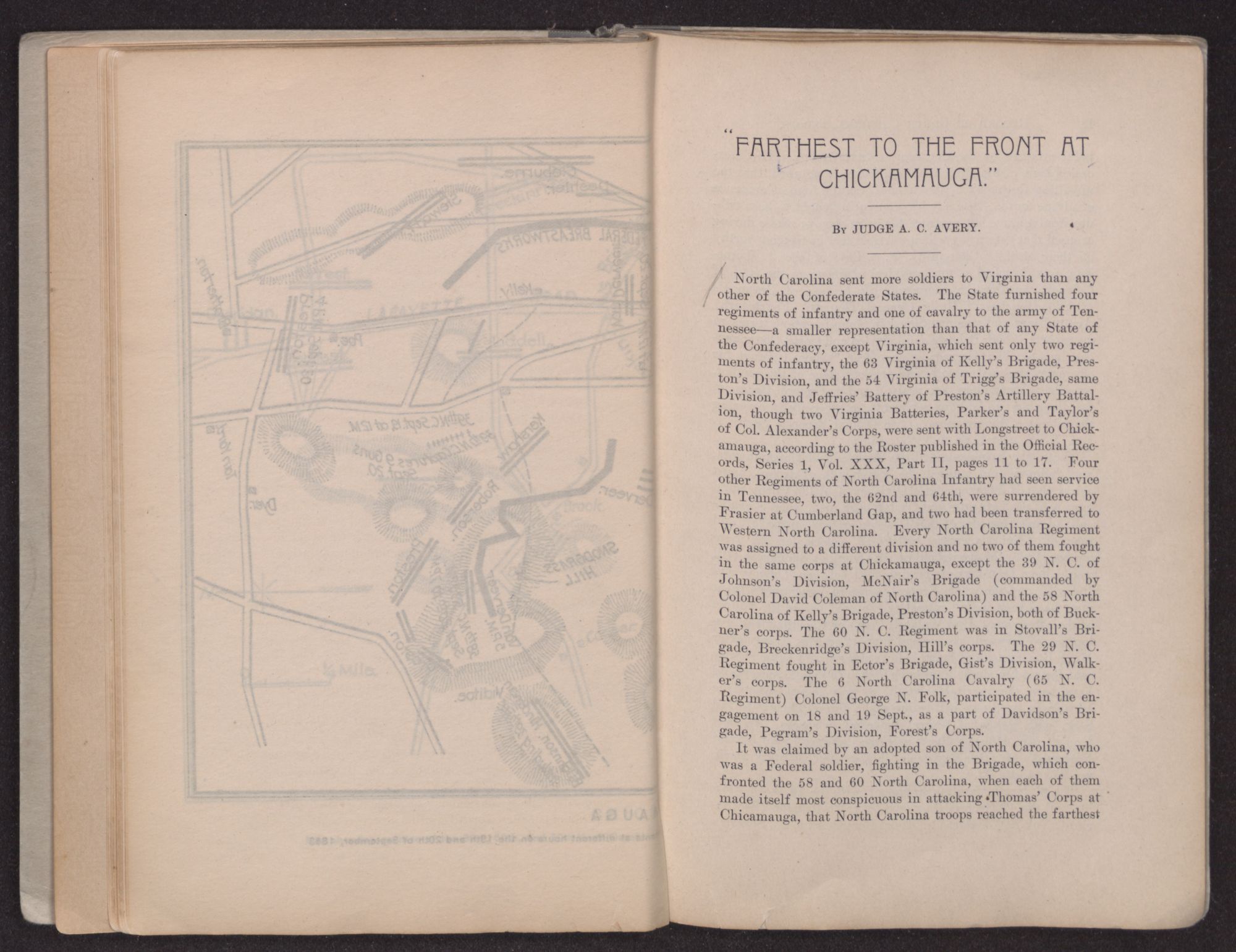 of Chickamauga, has lately revisited that battlefield with a view to writing his very graphic article which will have a peculiar interest because the deeds of North Carolina soldiers in the Army of the West are less widely known among us than the daring of the veterans in the Army of Northern Virginia in which the greater part of troops from this State served. Judge Avery clearly shows that the 39, 58 and 60 N. C., the one on the first day and the others on the second day, achieved the farthest advance attained by our troops. This conclusion is further sustained by the locations marked on the map by the Federal Commissioners, as having been attained by the different troops. The map of Chickamauga accompanying Judge Avery's article was made under his supervision after revisiting the field. Judge Avery states that while these locations have been marked on the ground by tablets erected not only by the Northern States, but by South Carolina, Georgia, Alabama, Tennessee, Missouri and other Southern States, the highest point, that reached by the North Carolinians, is marked only by a wooden board nailed to a telegraph pole! Moved by this pathetic statement, the committee adopted the Resolution which will be found below.