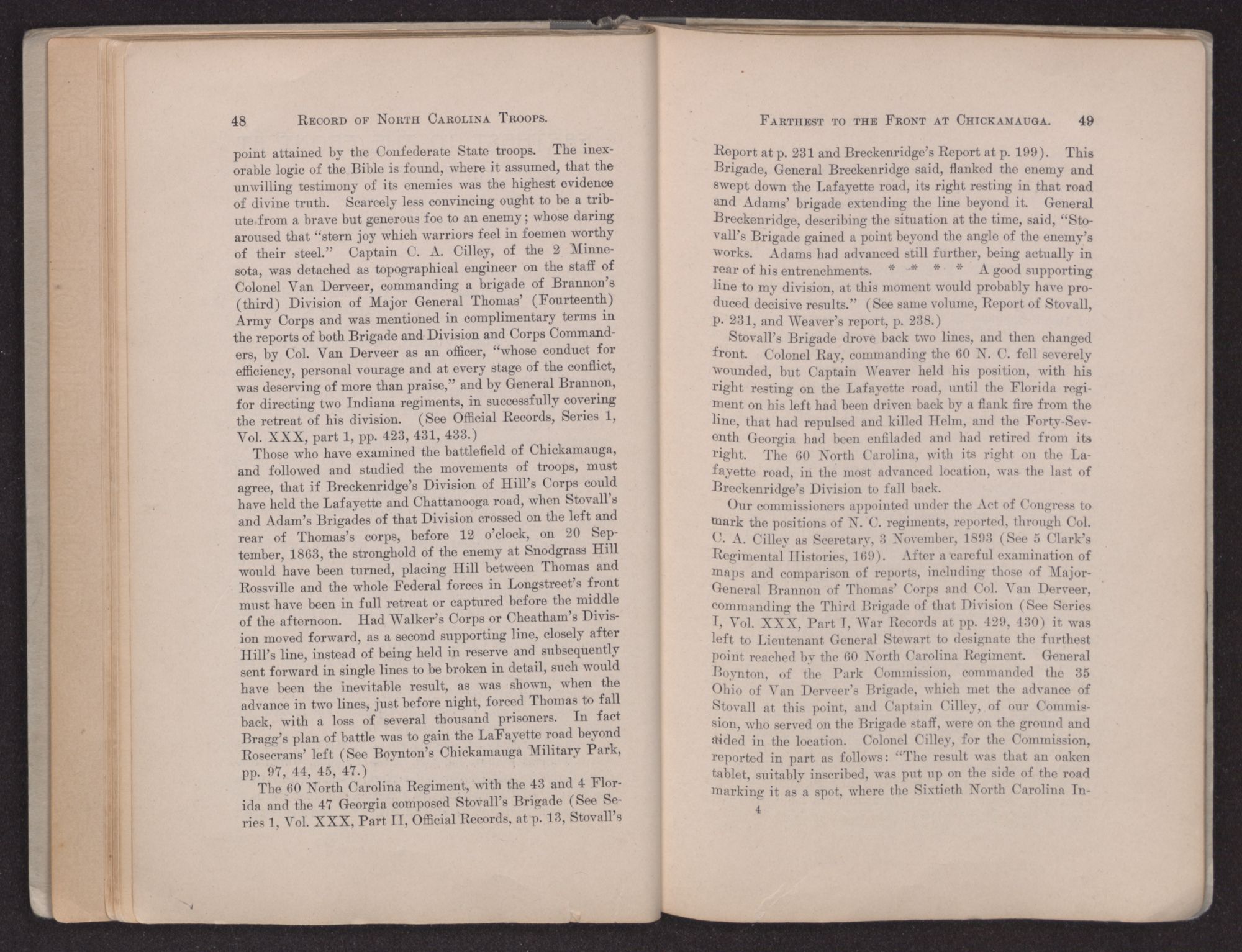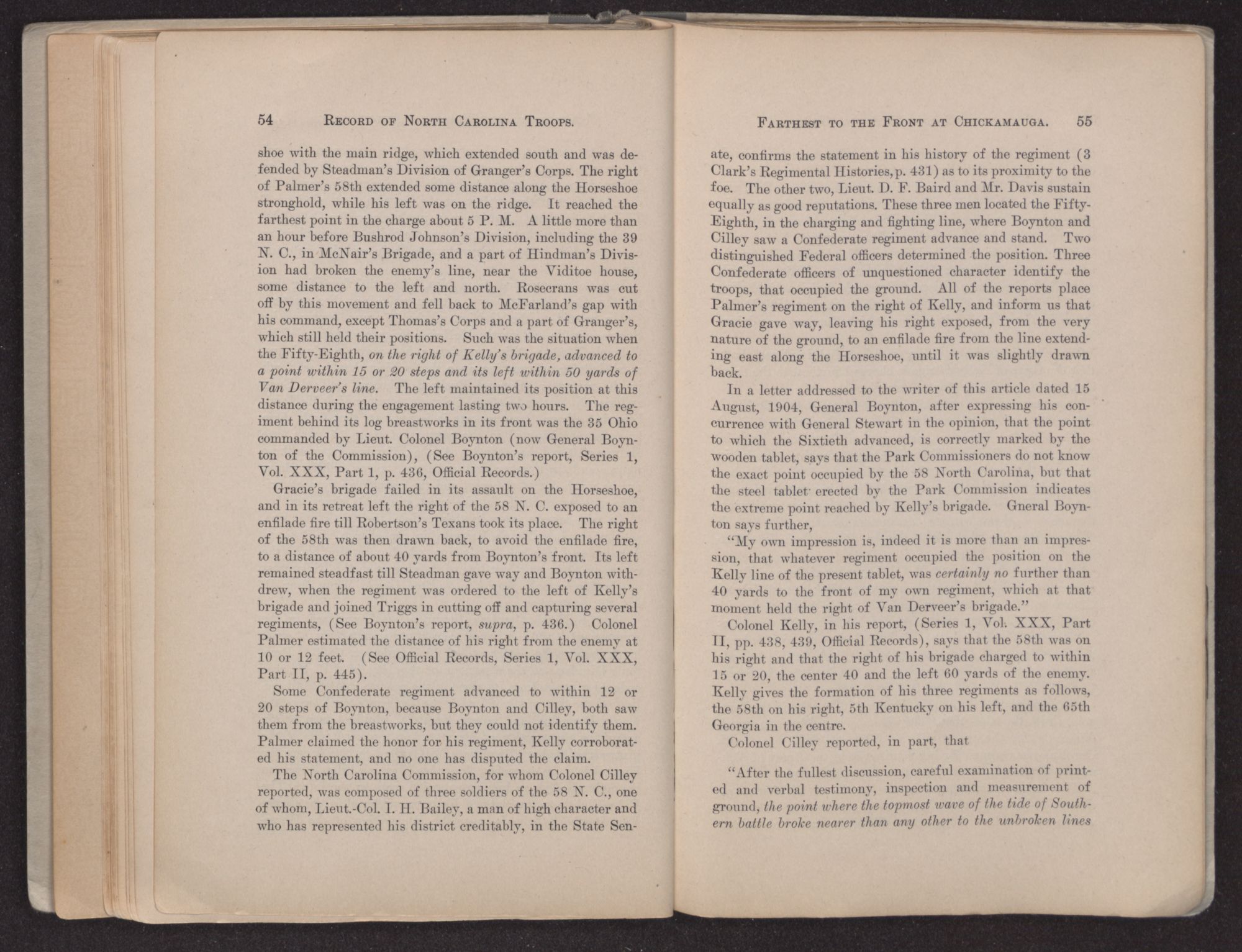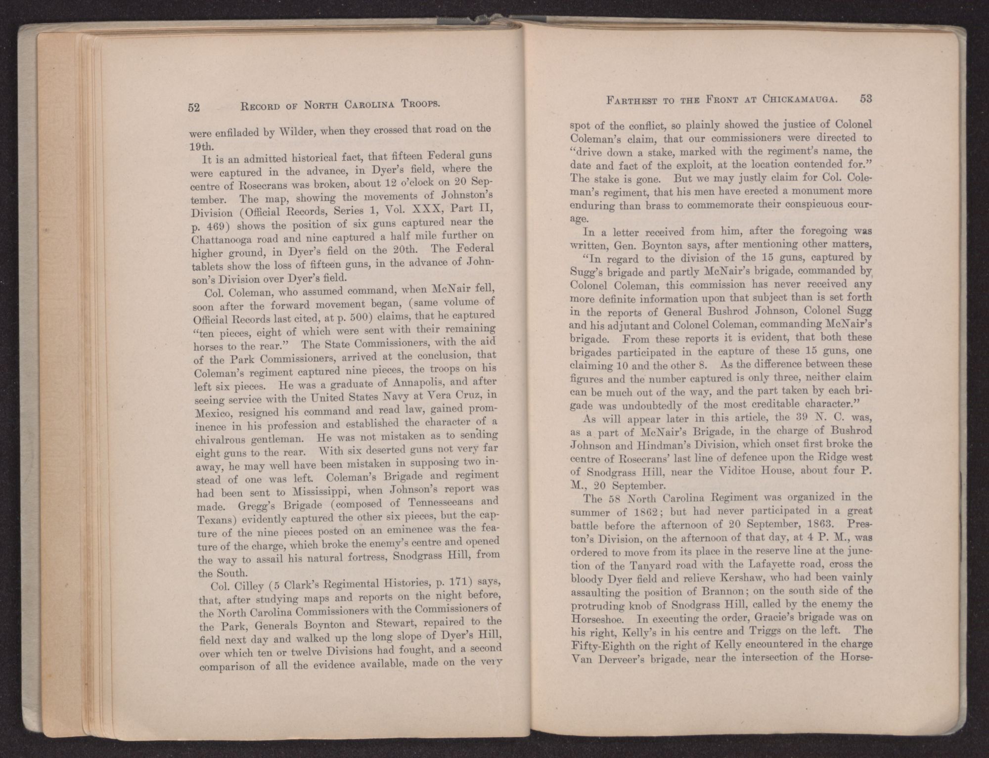 of Chickamauga, has lately revisited that battlefield with a view to writing his very graphic article which will have a peculiar interest because the deeds of North Carolina soldiers in the Army of the West are less widely known among us than the daring of the veterans in the Army of Northern Virginia in which the greater part of troops from this State served. Judge Avery clearly shows that the 39, 58 and 60 N. C., the one on the first day and the others on the second day, achieved the farthest advance attained by our troops. This conclusion is further sustained by the locations marked on the map by the Federal Commissioners, as having been attained by the different troops. The map of Chickamauga accompanying Judge Avery's article was made under his supervision after revisiting the field. Judge Avery states that while these locations have been marked on the ground by tablets erected not only by the Northern States, but by South Carolina, Georgia, Alabama, Tennessee, Missouri and other Southern States, the highest point, that reached by the North Carolinians, is marked only by a wooden board nailed to a telegraph pole! Moved by this pathetic statement, the committee adopted the Resolution which will be found below.