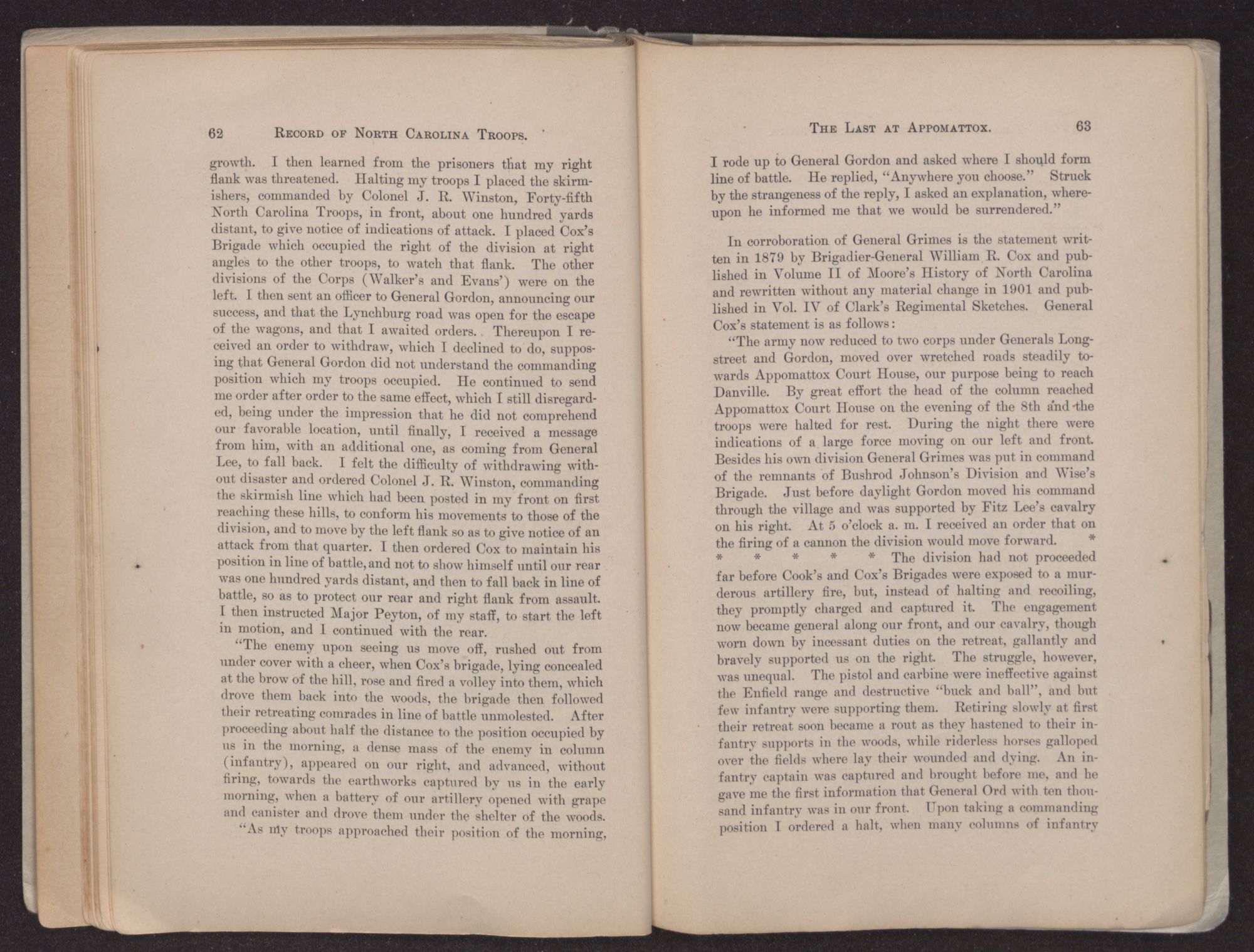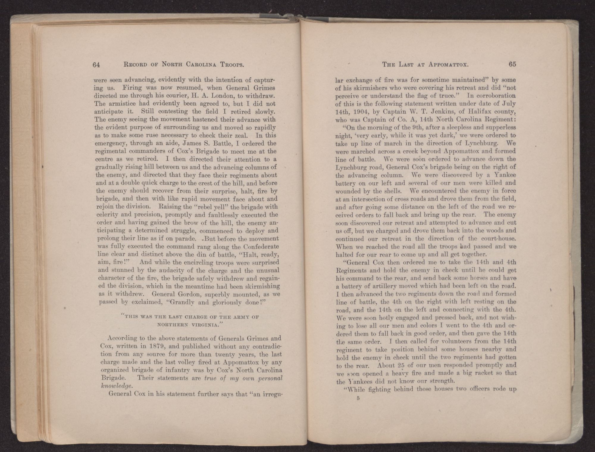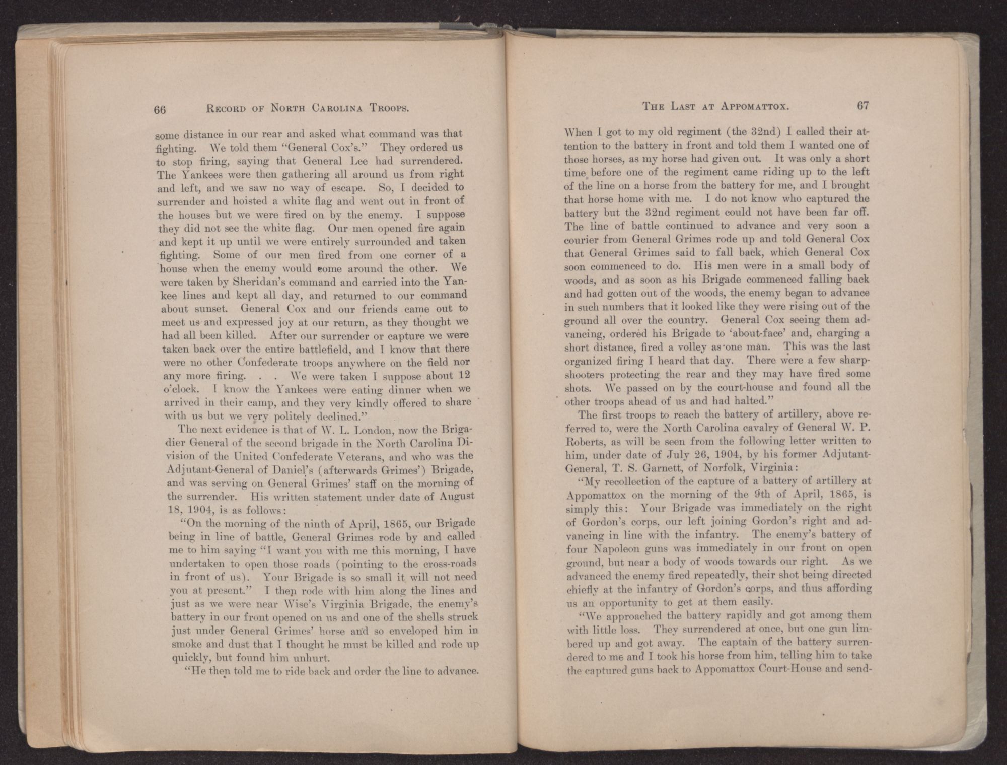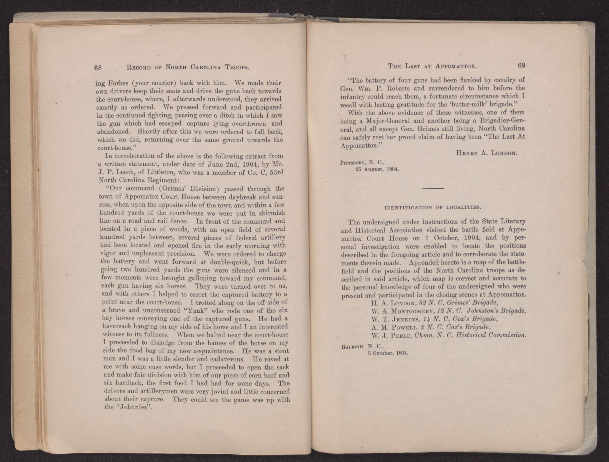 APPOMATTOX.Senator Henry A. London, who carried the last order at Appomattox, tells tersely and clearly what he saw and heard and is fully sustained by the statements which he quotes of Major-General Bryan Grimes and Brigadier General Cox who were in command of the troops who fired the last volley. Two other members of the Committee, Major Hale and Judge Montgomery, were also at Appomattox. The positions held by the troops under Major Gen. Grimes, who were in the front of the army and by whom necessarily the last volley was fired, (the other part of the army under Longstreet, which faced Grant, in our rear, was not engaged) is shown on the map accompanying London's article herein. The ground was visited 1 Oct., 1904, by a special committee consisting of Hon. H. A. London, Judge W. A. Montgomery, Capt. W. T. Jenkins and Mayor A. M. Powell, veterans of that field and they were accompanied by W. J. Peele, Esq., Chairman of the State Historical Commission to whose patriotism and intelligent