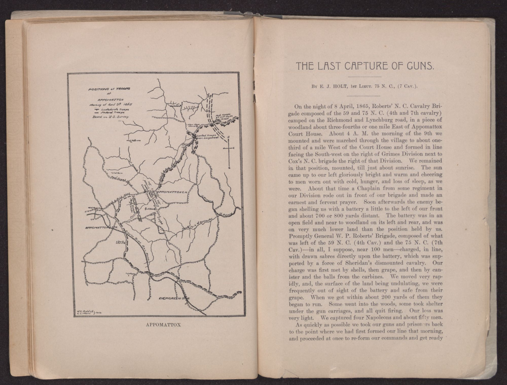 On the night of 8 April, 1865, Roberts’ N. C. Cavalry Brigade composed of the 59 and 75 N. C. (4th and 7th cavalry) camped on the Richmond and Lynchburg road, in a piece of woodland about three-fourths or one mile East of Appomattox Court House. About 4 A. M. the morning of the 9th we mounted and were marched through the village to about one-third of a mile West of the Court House and formed in line facing the South-west on the right of Grimes Division next to Cox's N. C. brigade the right of that Division. We remained in that position, mounted, till just about sunrise. The sun came up to our left gloriously bright and warm and cheering to men worn out with cold, hunger, and loss of sleep, as we were. About that time a Chaplain from some regiment in our Division rode out in front of our brigade and made an earnest and fervent prayer. Soon afterwards the enemy began shelling us with a battery a little to the left of our front and about 700 or 800 yards distant. The battery was in an open field and near to woodland on its left and rear, and was on very much lower land than the position held by us. Promptly General W. P. Roberts’ Brigade, composed of what was left of the 59 N. C. (4th Cav.) and the 75 N. C. (7th Cav.)—in all, I suppose, near 100 men—charged, in line, with drawn sabres directly upon the battery, which was supported by a force of Sheridan's dismounted cavalry. Our charge was first met by shells, then grape, and then by canister and the balls from the carbines. We moved very rapidly, and, the surface of the land being undulating, we were frequently out of sight of the battery and safe from their grape. When we got within about 200 yards of them they began to run. Some went into the woods, some took shelter under the gun carriages, and all quit firing. Our loss was very light. We captured four Napoleons and about fifty men.