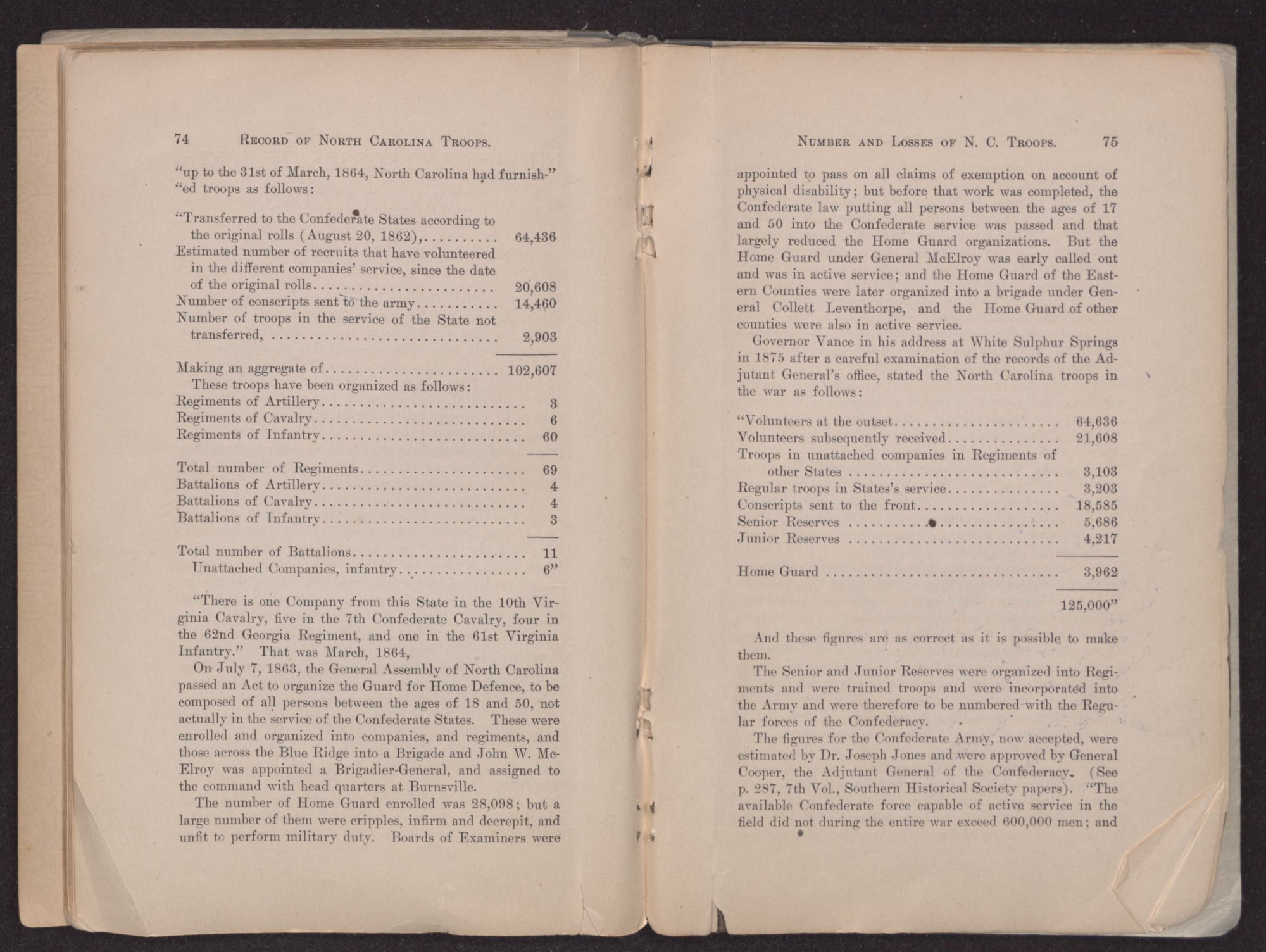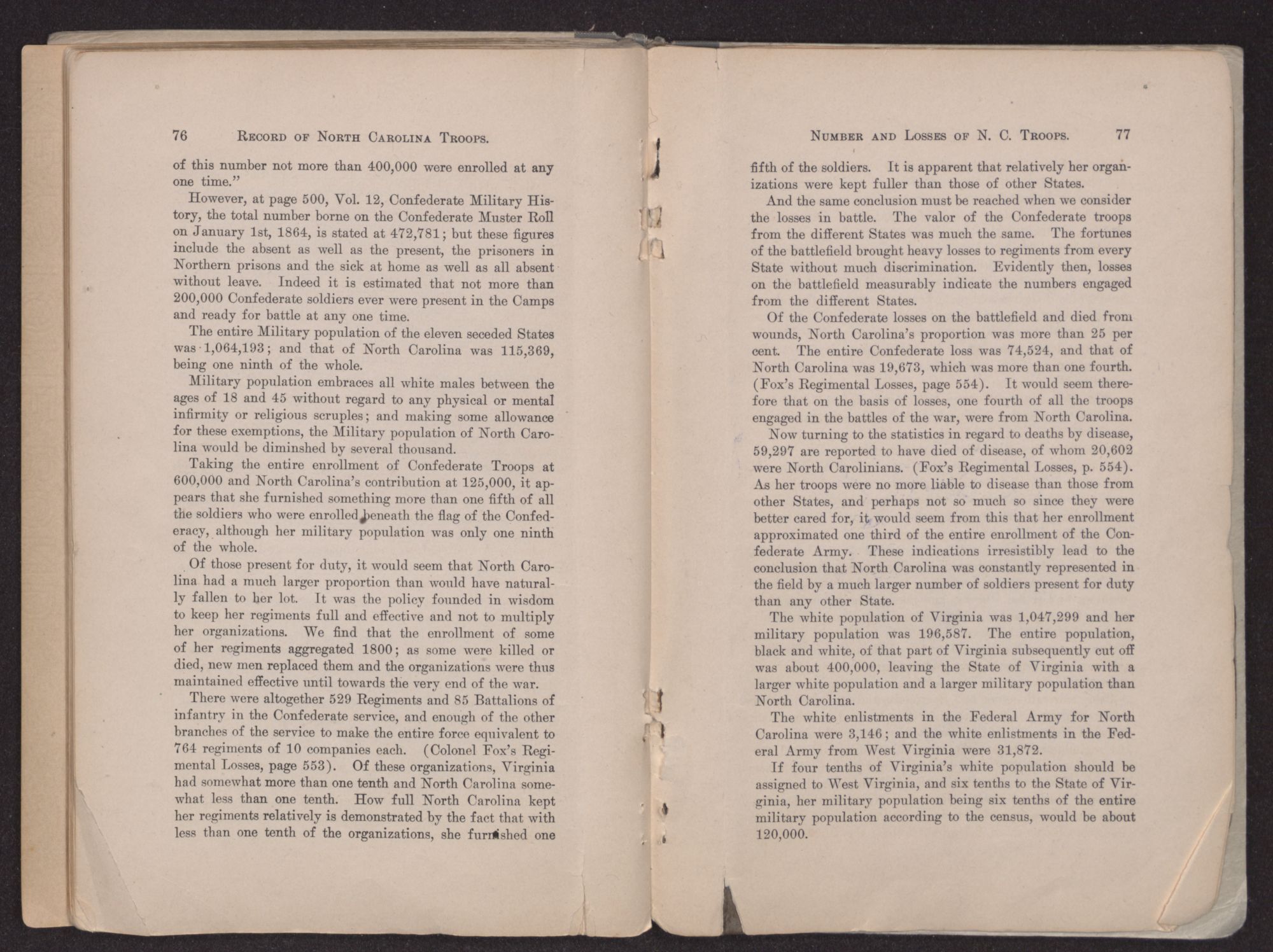 At page 553, Fox states that North Carolina had 69 regiments and 4 battalions of infantry; one regiment and five battalions of cavalry and 2 battalions of heavy artillery and 9 battalions of light artillery. As a matter of fact it appears that North Carolina furnished 84 regiments, 16 battalions, and 13 unattached Companies, besides the companies and individuals serving in commands from other States, and 9 regiments of Home Guards, and the militia rendering short terms of duty. Vol. 4, p. 224, Reg. Histories. Virginia is credited with 65 regiments and 10 battalions of infantry, 22 regiments and 11 battalions of cavalry, one regiment of partizan rangers, one regiment of artillery and 53 batteries of light artillery. But how many of these organizations were maintained with their full complement of men ready for active duty does not appear. It does appear however that North Carolina furnished more than 120,000 soldiers including Home Guard out of a total enrollment of 600,000, leaving only 480,000 to be apportioned among the other States. It also appears that her losses both on the battlefield and by disease indicate that her contribution to the Confederate Army was somewhat more than the proportion of one to