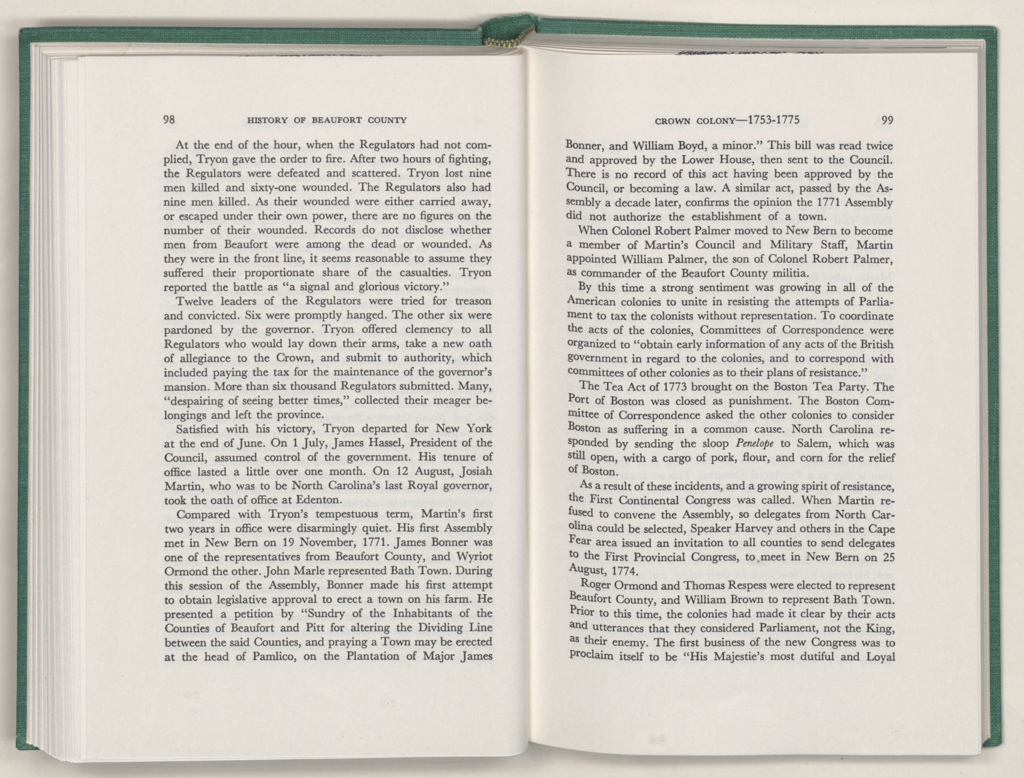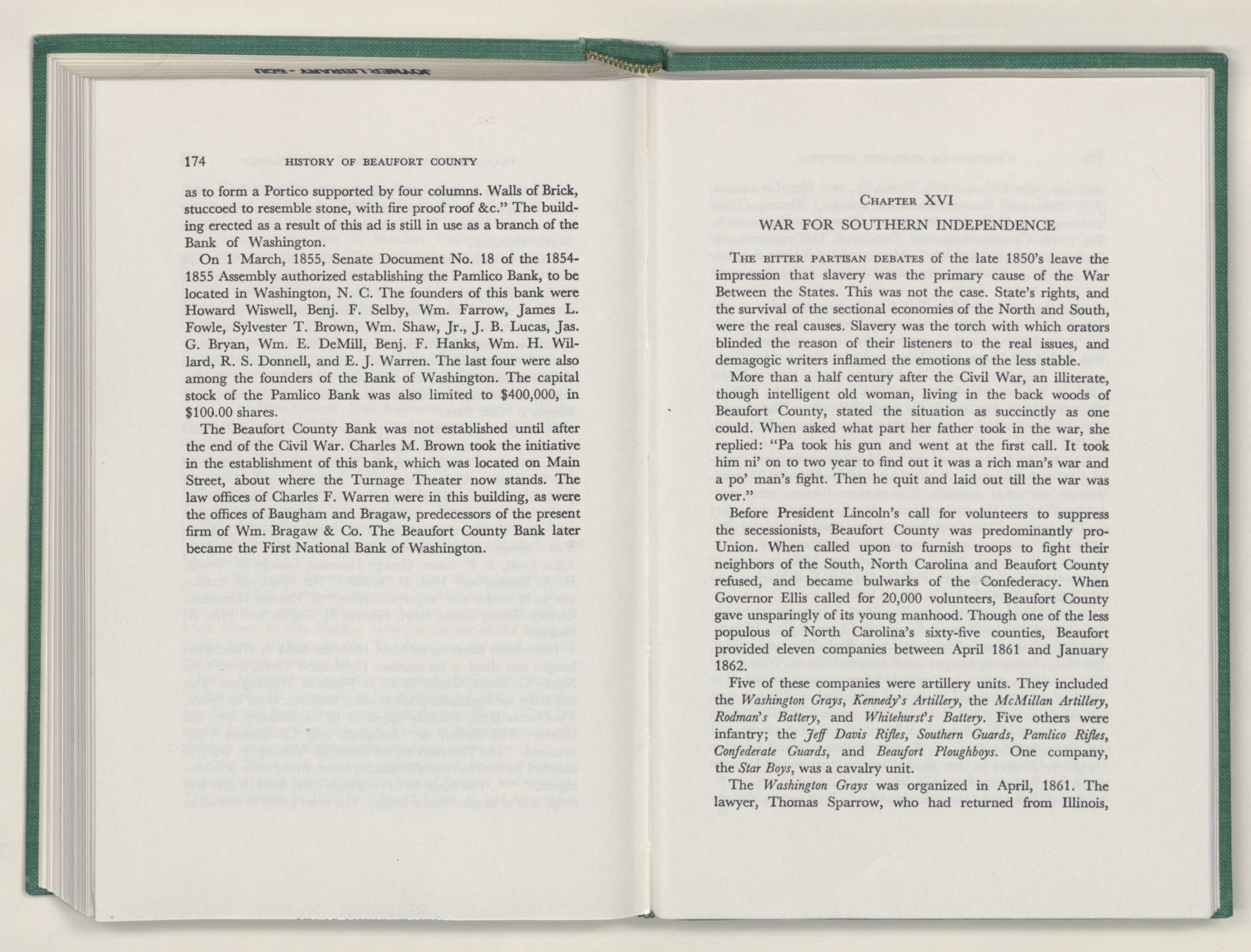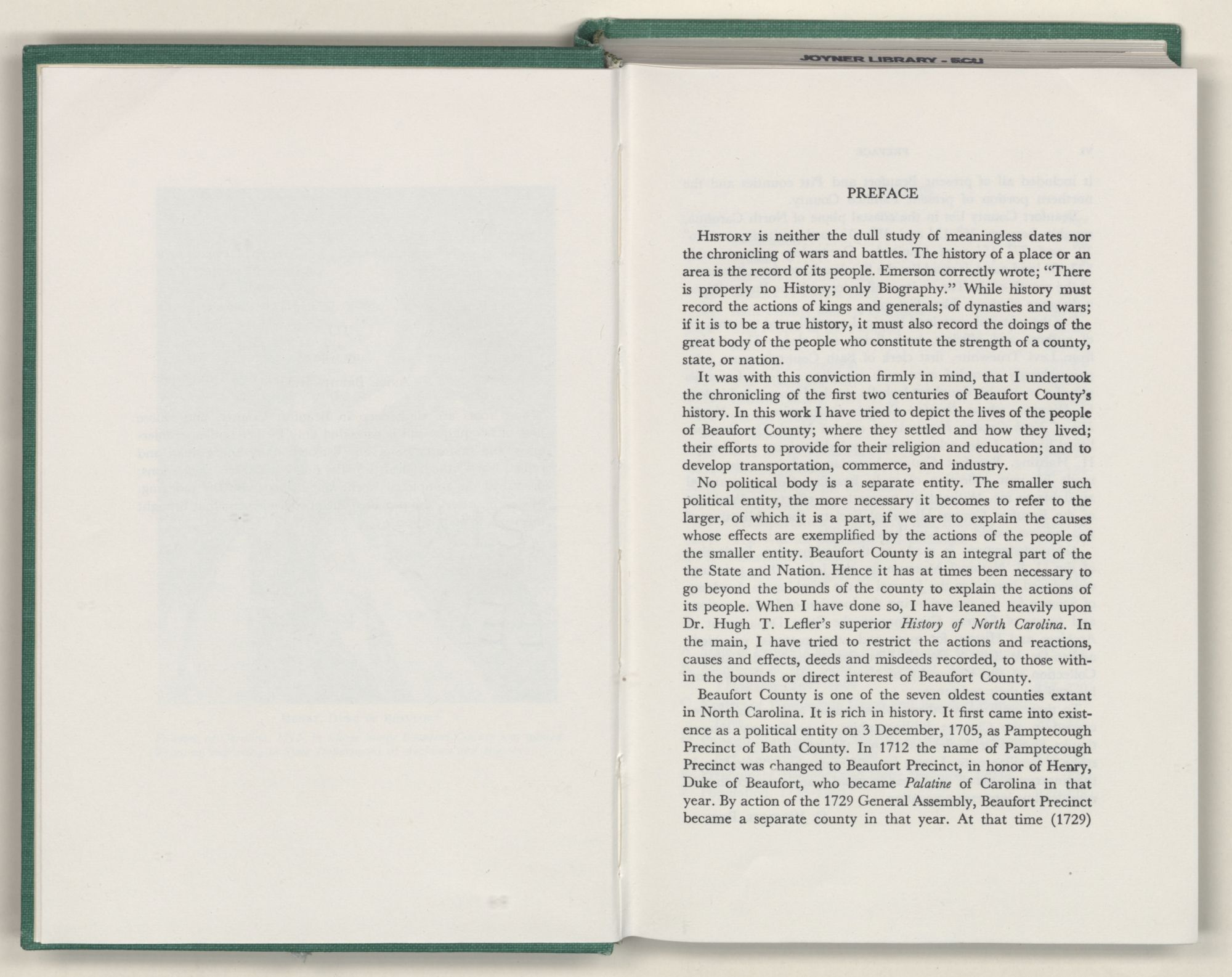 No political body is a separate entity. The smaller such political entity, the more necessary it becomes to refer to the larger, of which it is a part, if we are to explain the causes whose effects are exemplified by the actions of the people of the smaller entity. Beaufort County is an integral part of the the State and Nation. Hence it has at times been necessary to go beyond the bounds of the county to explain the actions of its people. When I have done so, I have leaned heavily upon Dr. Hugh T. Lefler's superior History of North Carolina. In the main, I have tried to restrict the actions and reactions, causes and effects, deeds and misdeeds recorded, to those within the bounds or direct interest of Beaufort County.