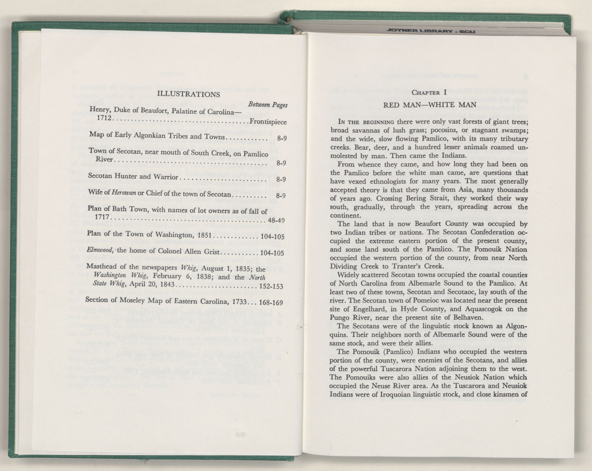 IN THE BEGINNING there were only vast forests of giant trees; broad savannas of lush grass; pocosins, or stagnant swamps; and the wide, slow flowing Pamlico, with its many tributary creeks. Bear, deer, and a hundred lesser animals roamed unmolested by man. Then came the Indians.