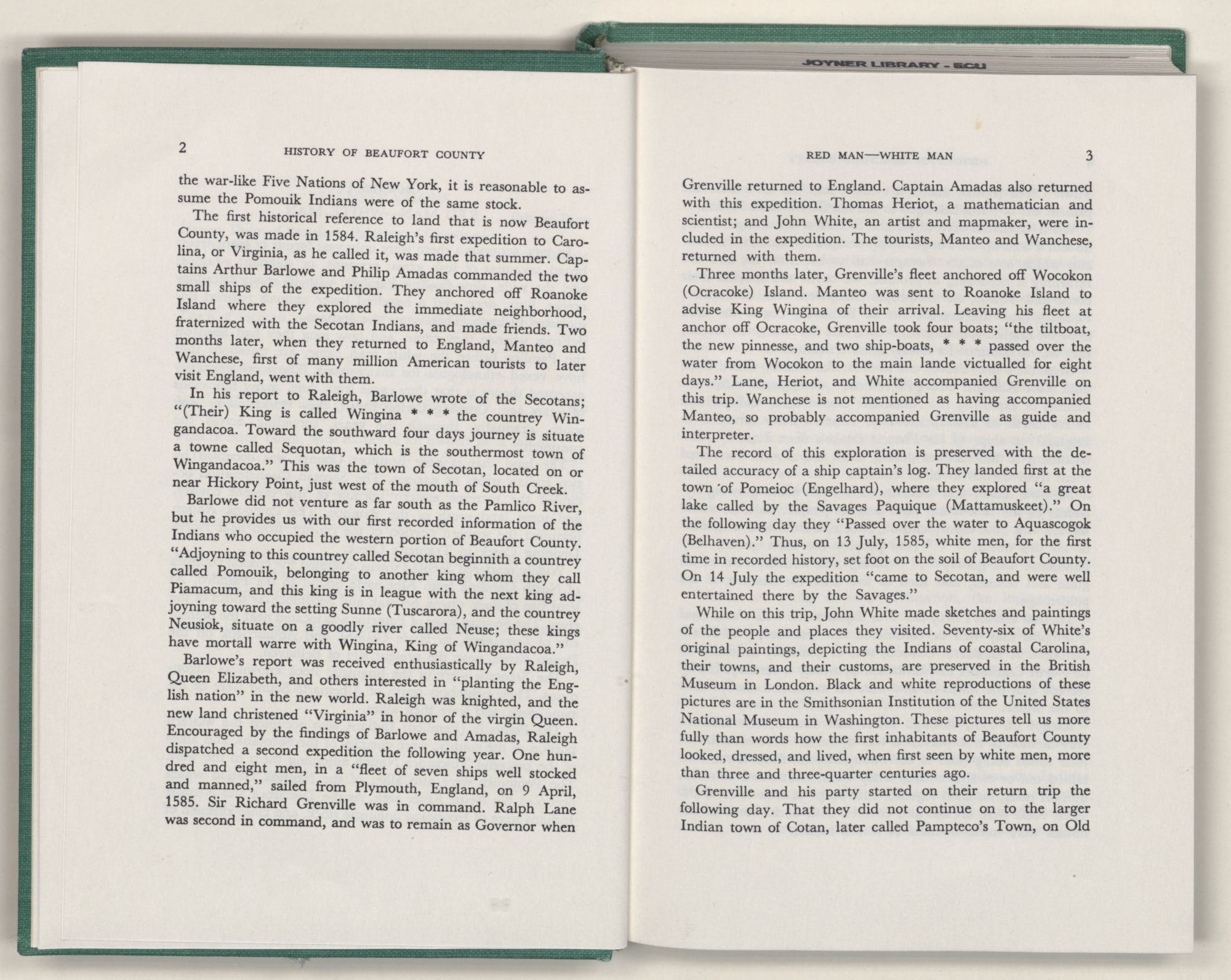 The record of this exploration is preserved with the detailed accuracy of a ship captain's log. They landed first at the town of Pomeioc (Engelhard), where they explored “a great lake called by the Savages Paquique (Mattamuskeet).” On the following day they “Passed over the water to Aquascogok (Belhaven).” Thus, on 13 July, 1585, white men, for the first time in recorded history, set foot on the soil of Beaufort County. On 14 July the expedition “came to Secotan, and were well entertained there by the Savages.”