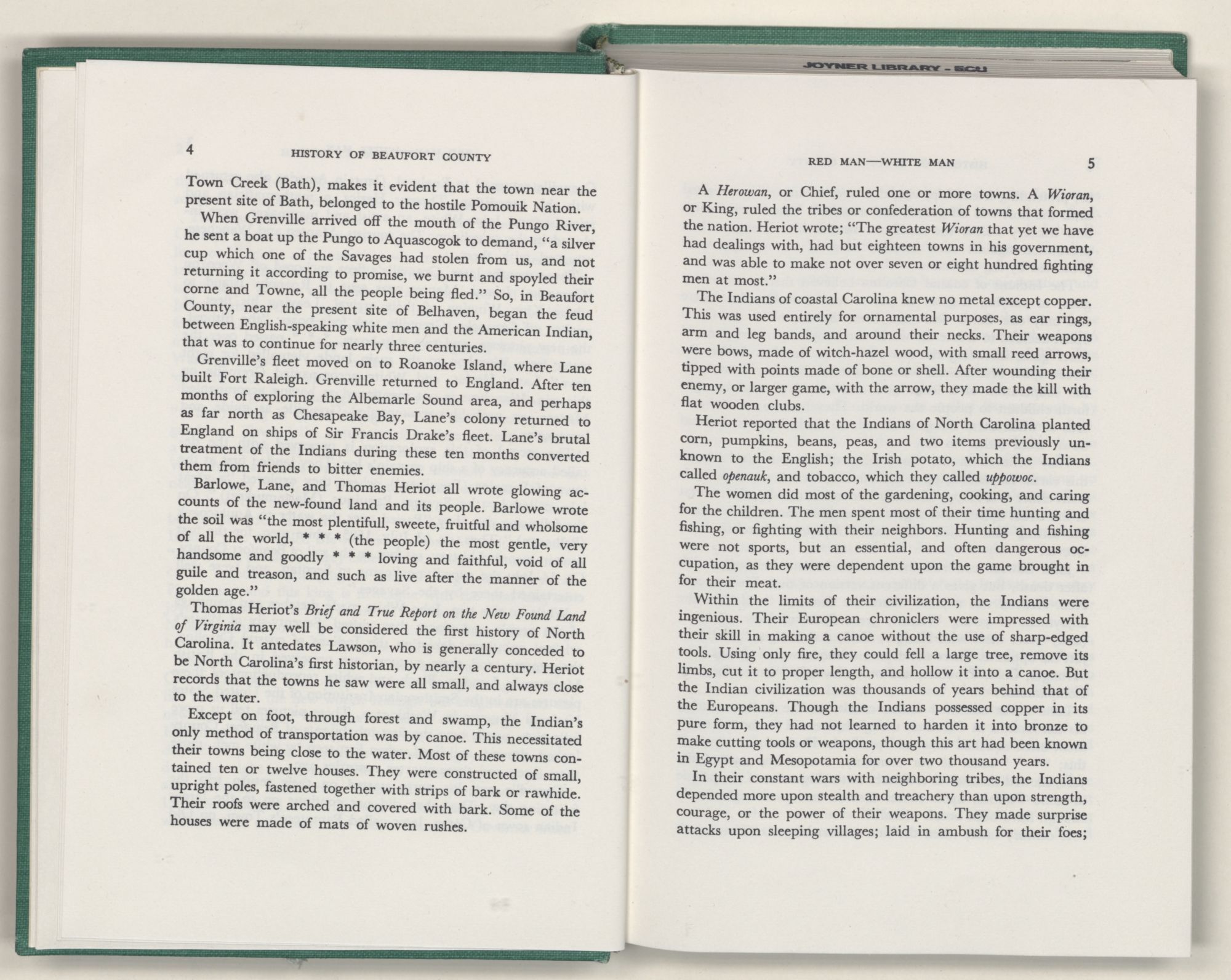 Thomas Heriot's Brief and True Report on the New Found Land of Virginia may well be considered the first history of North Carolina. It antedates Lawson, who is generally conceded to be North Carolina's first historian, by nearly a century. Heriot records that the towns he saw were all small, and always close to the water.
