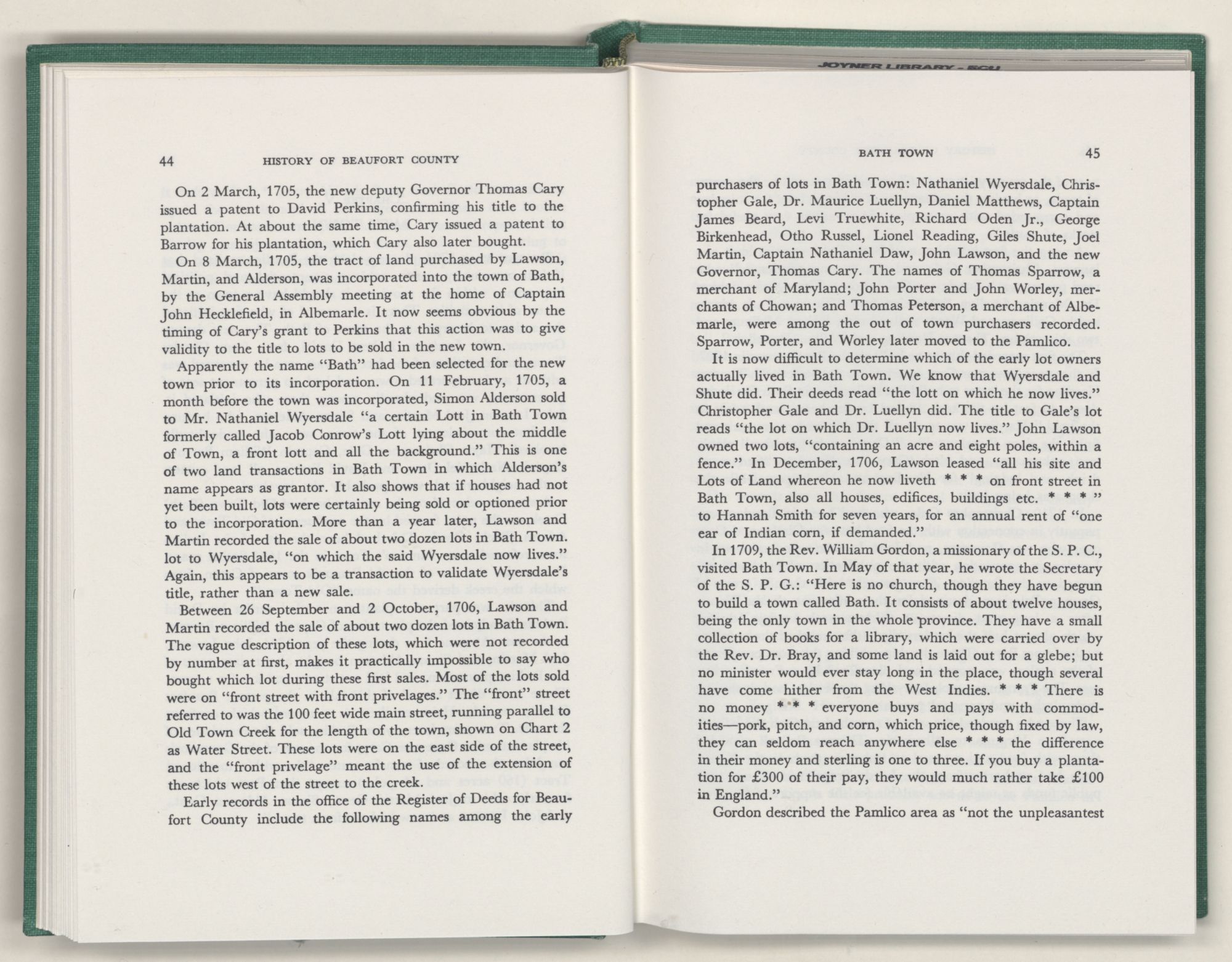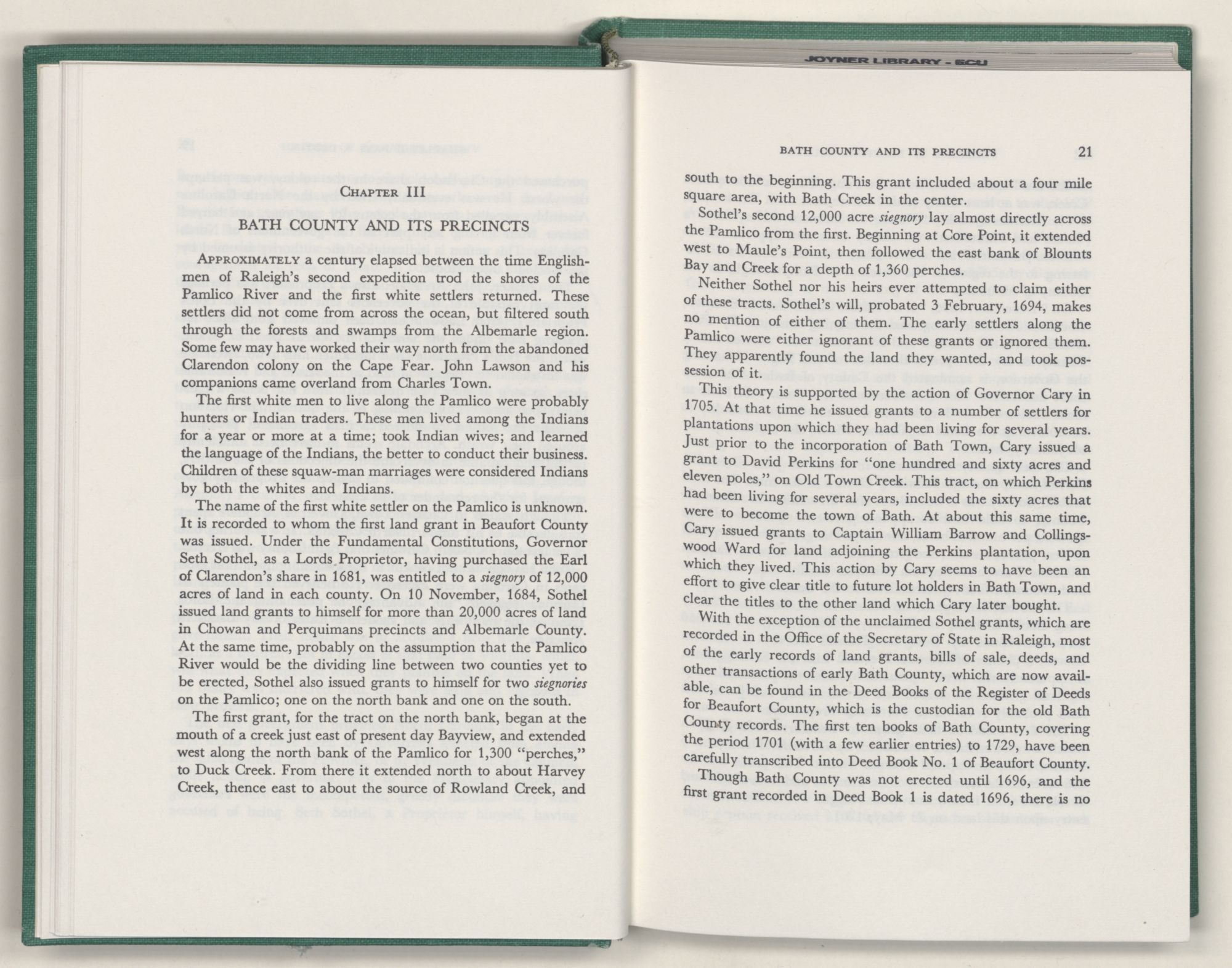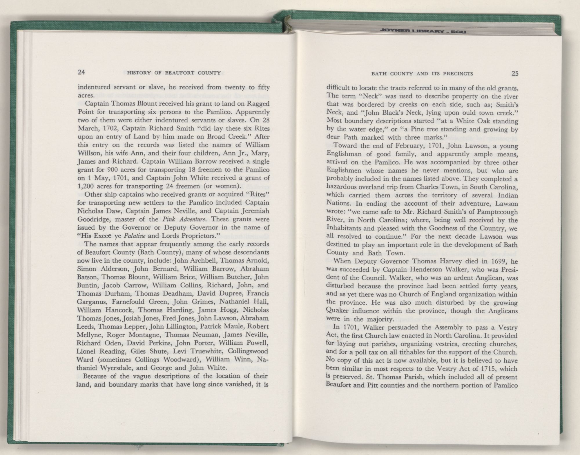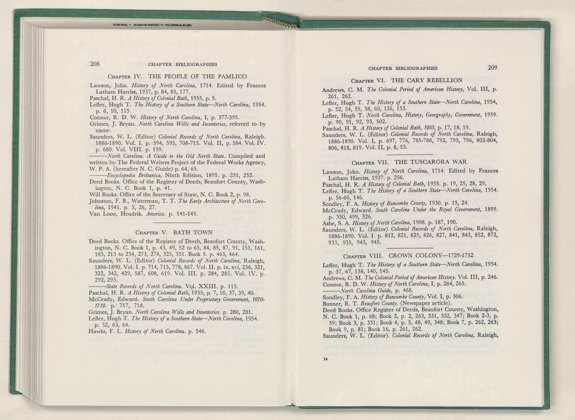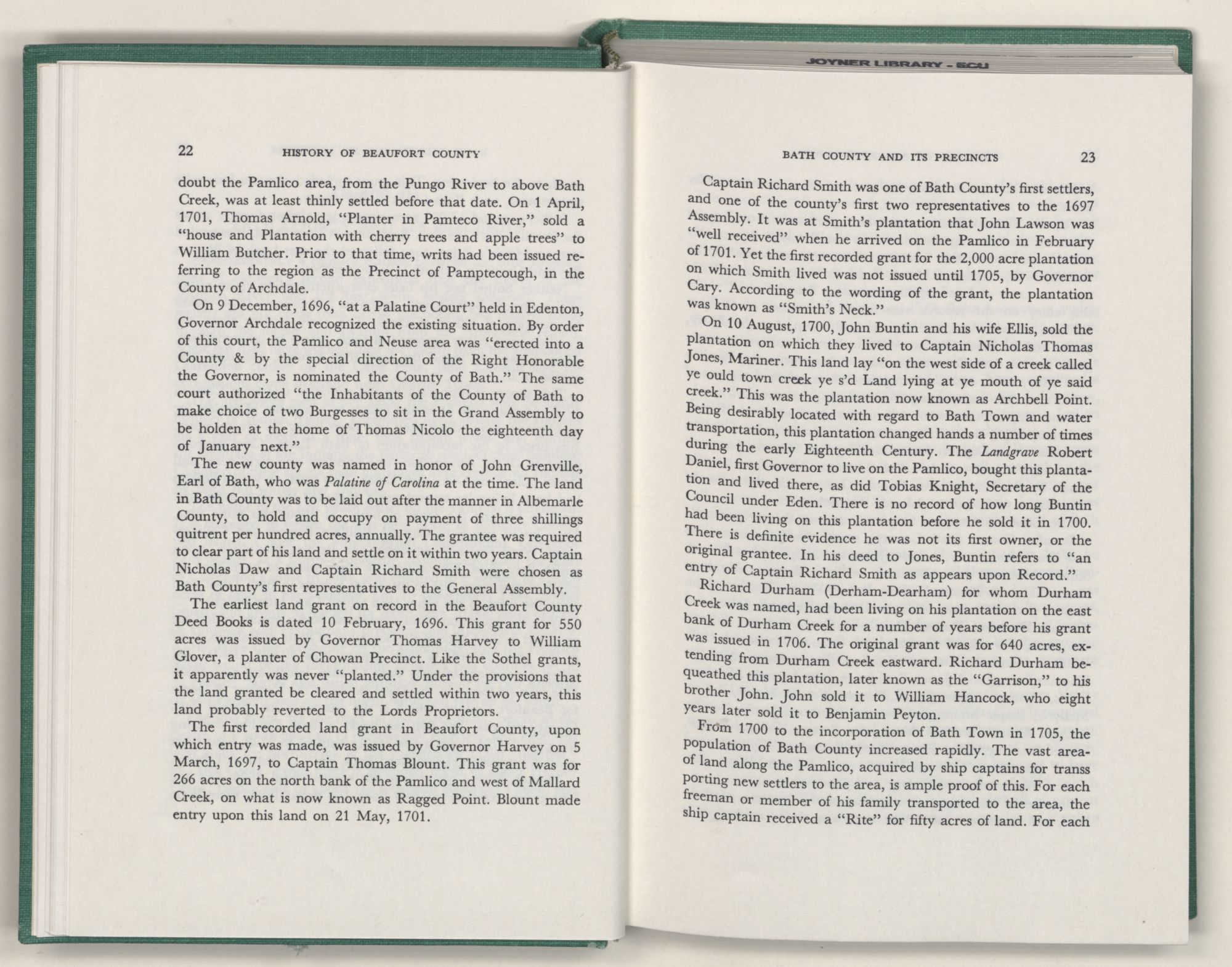 For the material contained herein, I am obligated to hundreds of authors and officials, both living and dead. They range from Levi Truewhite, first clerk of Bath County's court, who painstakingly recorded even such triviality as John Lawson's gift of a cow to his daughter Isabella; to the Honorable Lindsay C. Warren, whose Beaufort County's Contribution to a Notable Era of North Carolina History is an epic of North Carolina political history. I also acknowledge my indebtedness to Edmund H. Harding, Beaufort County historian and humorist, who made his vast collection of early Beaufort County material available to me. Without his promotional efforts, as President of the Beaufort County Historical Society, the publication of this volume would not have been possible.