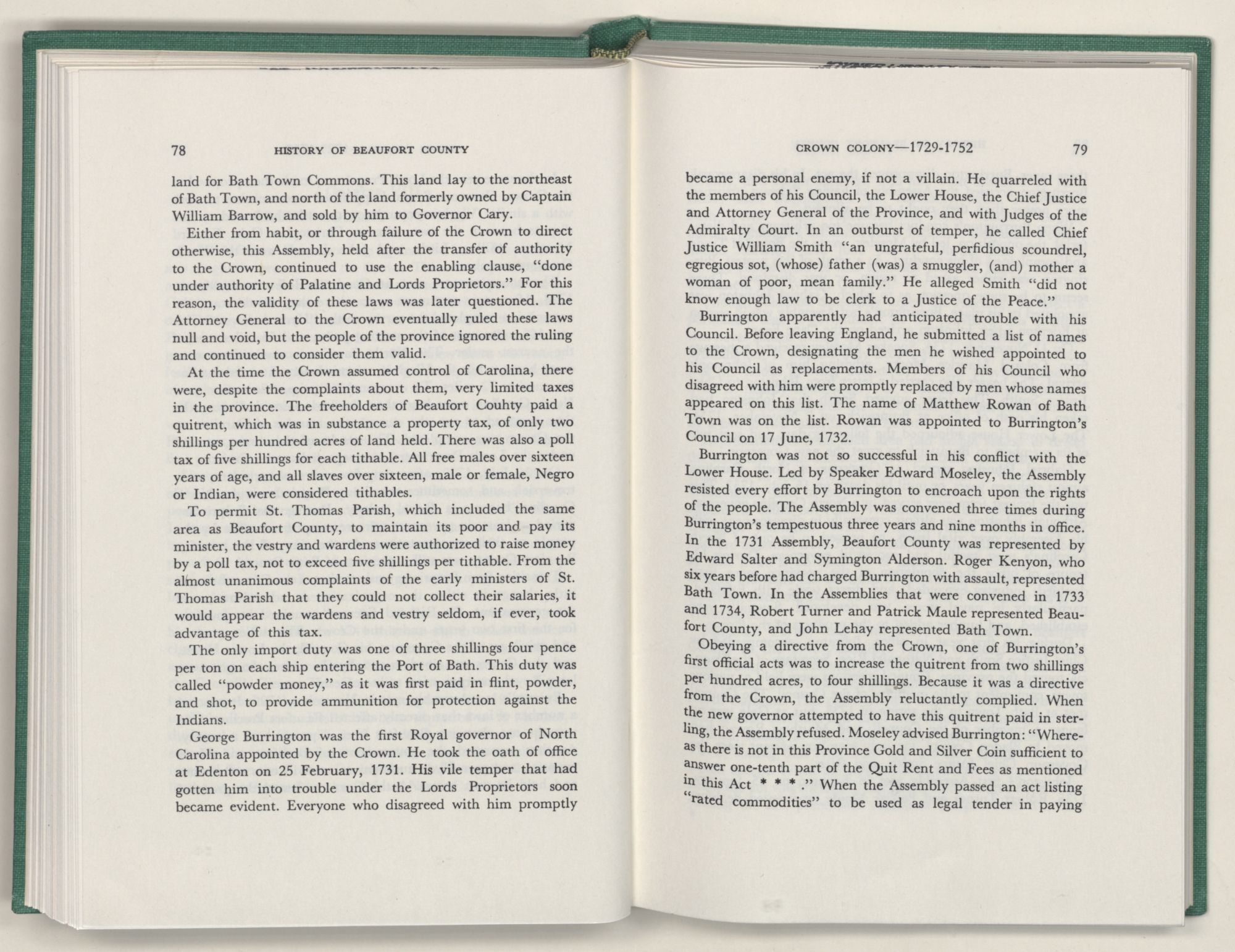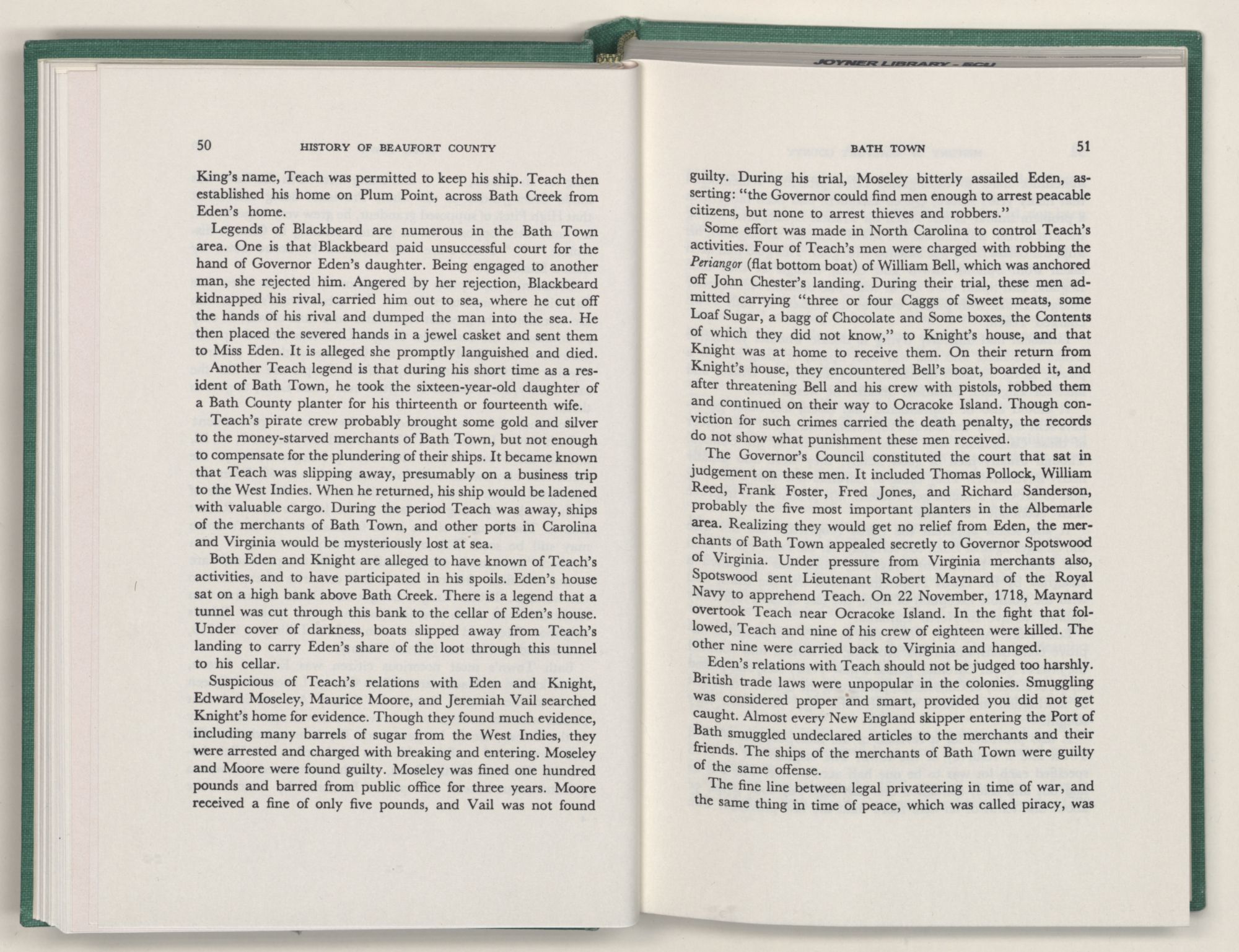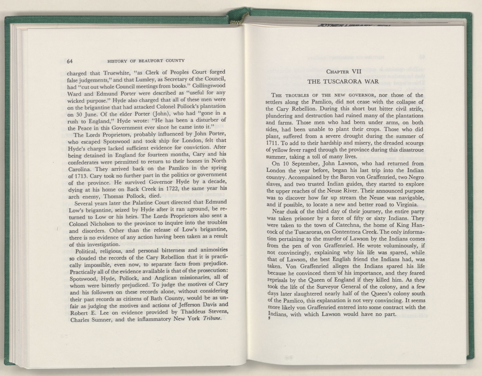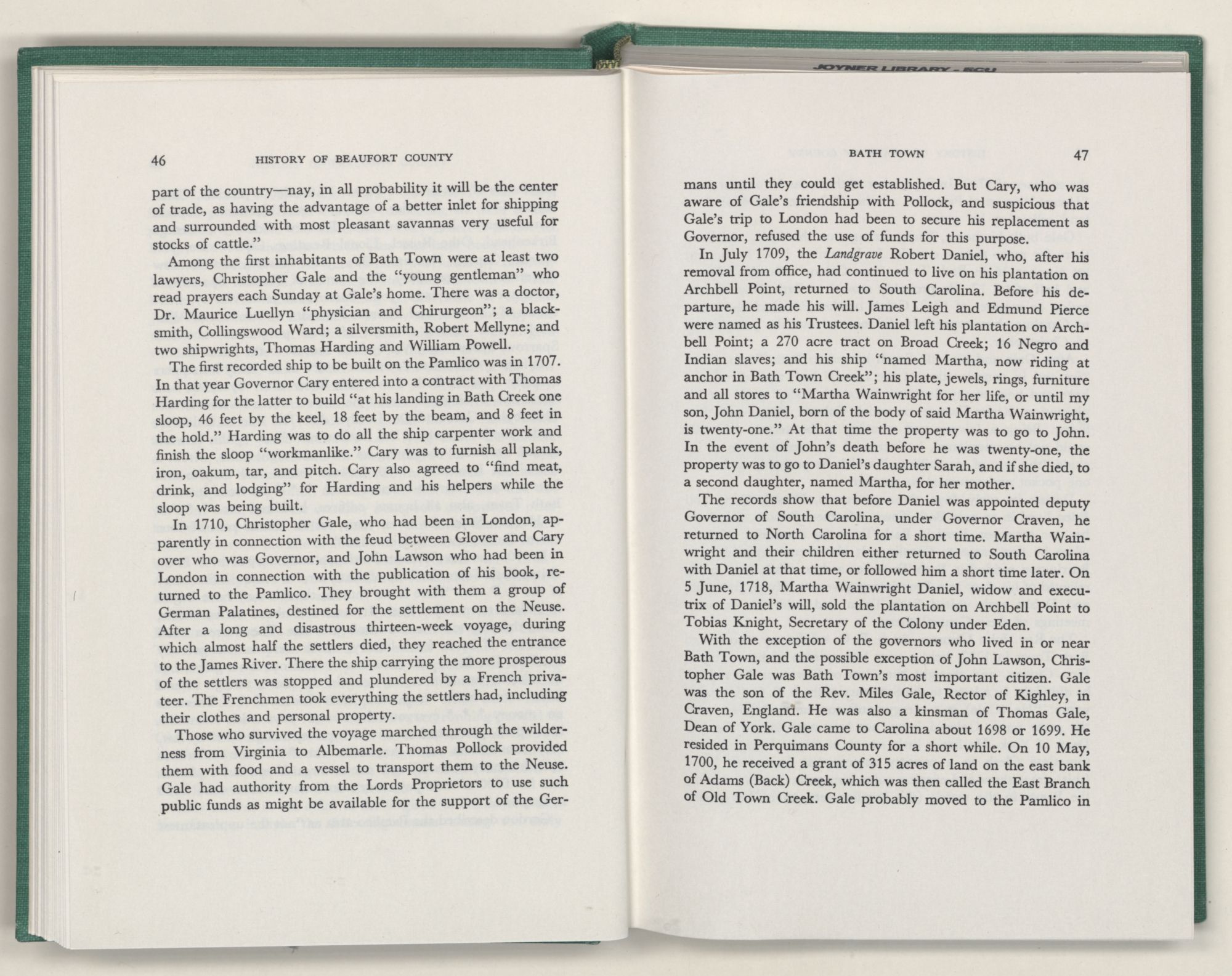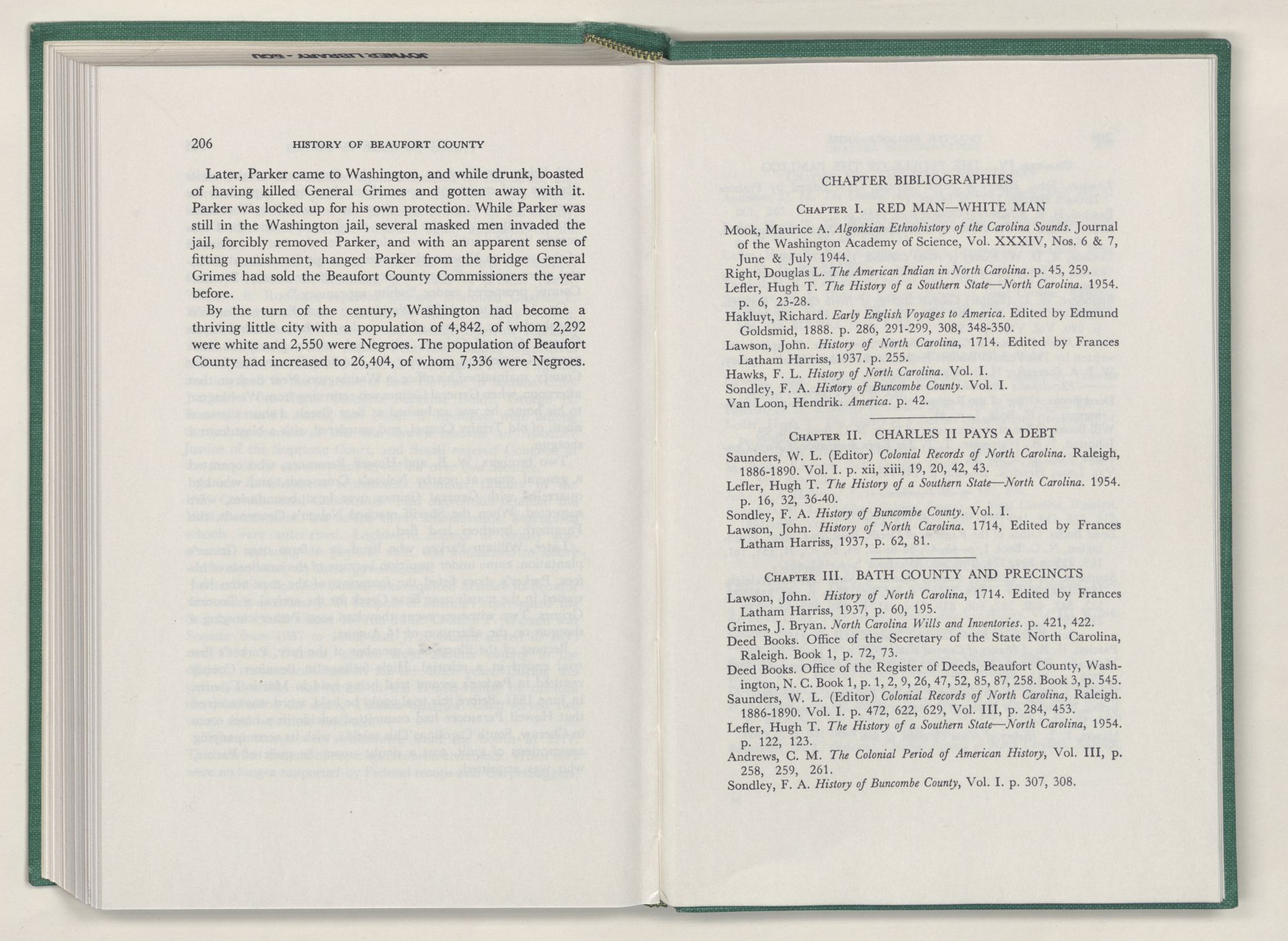 For the material contained herein, I am obligated to hundreds of authors and officials, both living and dead. They range from Levi Truewhite, first clerk of Bath County's court, who painstakingly recorded even such triviality as John Lawson's gift of a cow to his daughter Isabella; to the Honorable Lindsay C. Warren, whose Beaufort County's Contribution to a Notable Era of North Carolina History is an epic of North Carolina political history. I also acknowledge my indebtedness to Edmund H. Harding, Beaufort County historian and humorist, who made his vast collection of early Beaufort County material available to me. Without his promotional efforts, as President of the Beaufort County Historical Society, the publication of this volume would not have been possible.