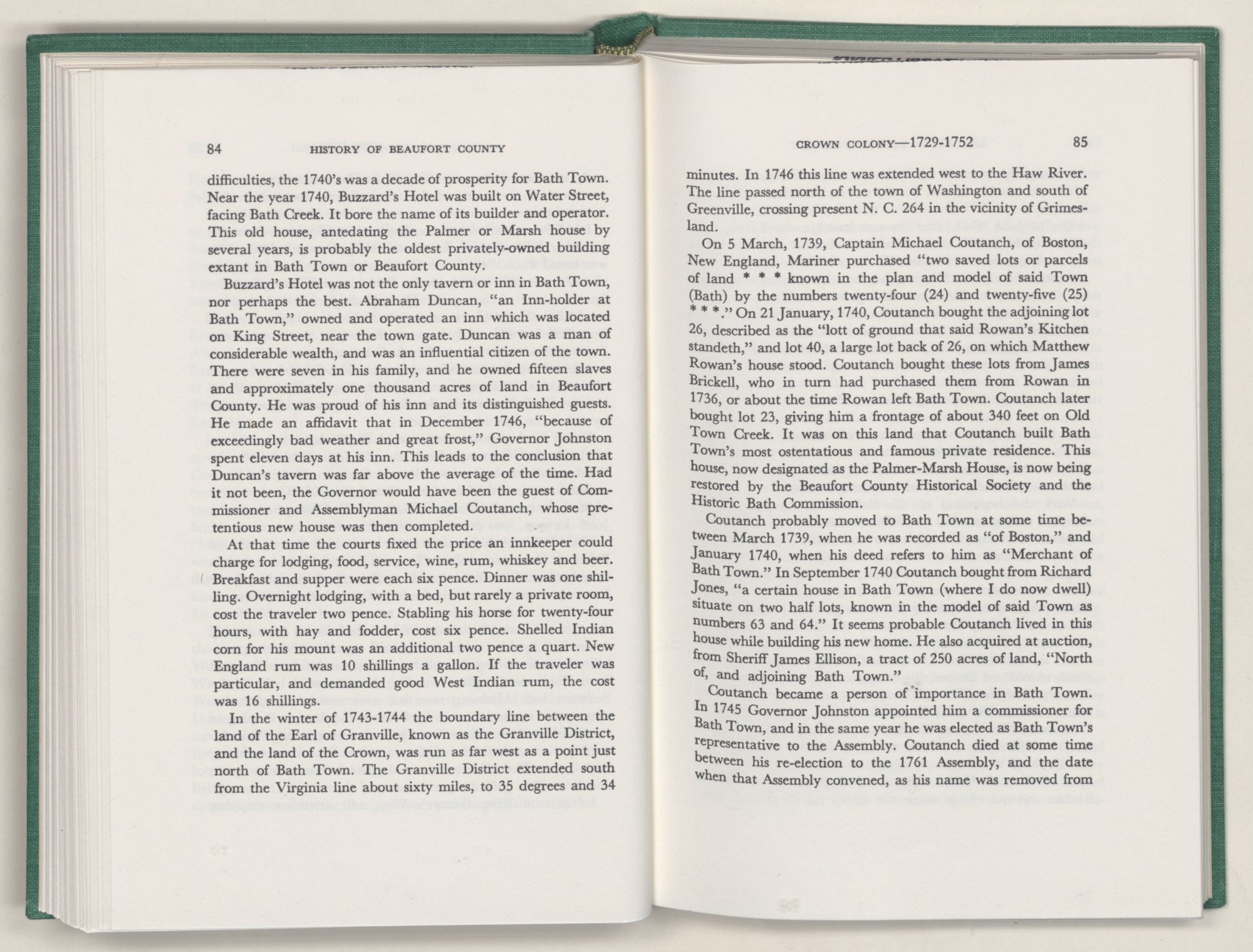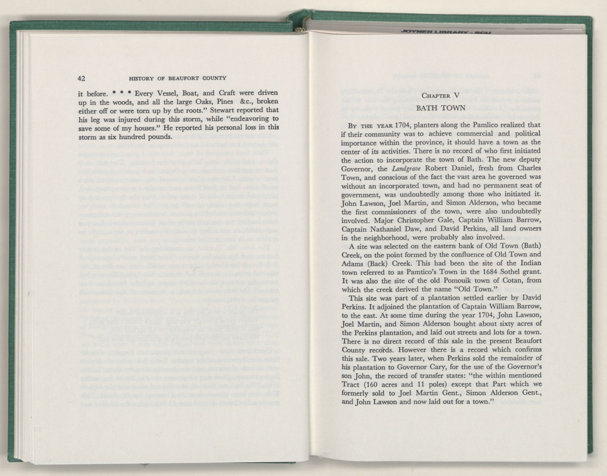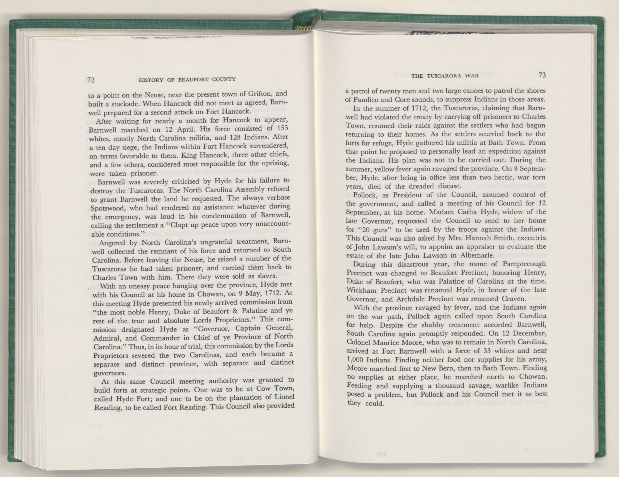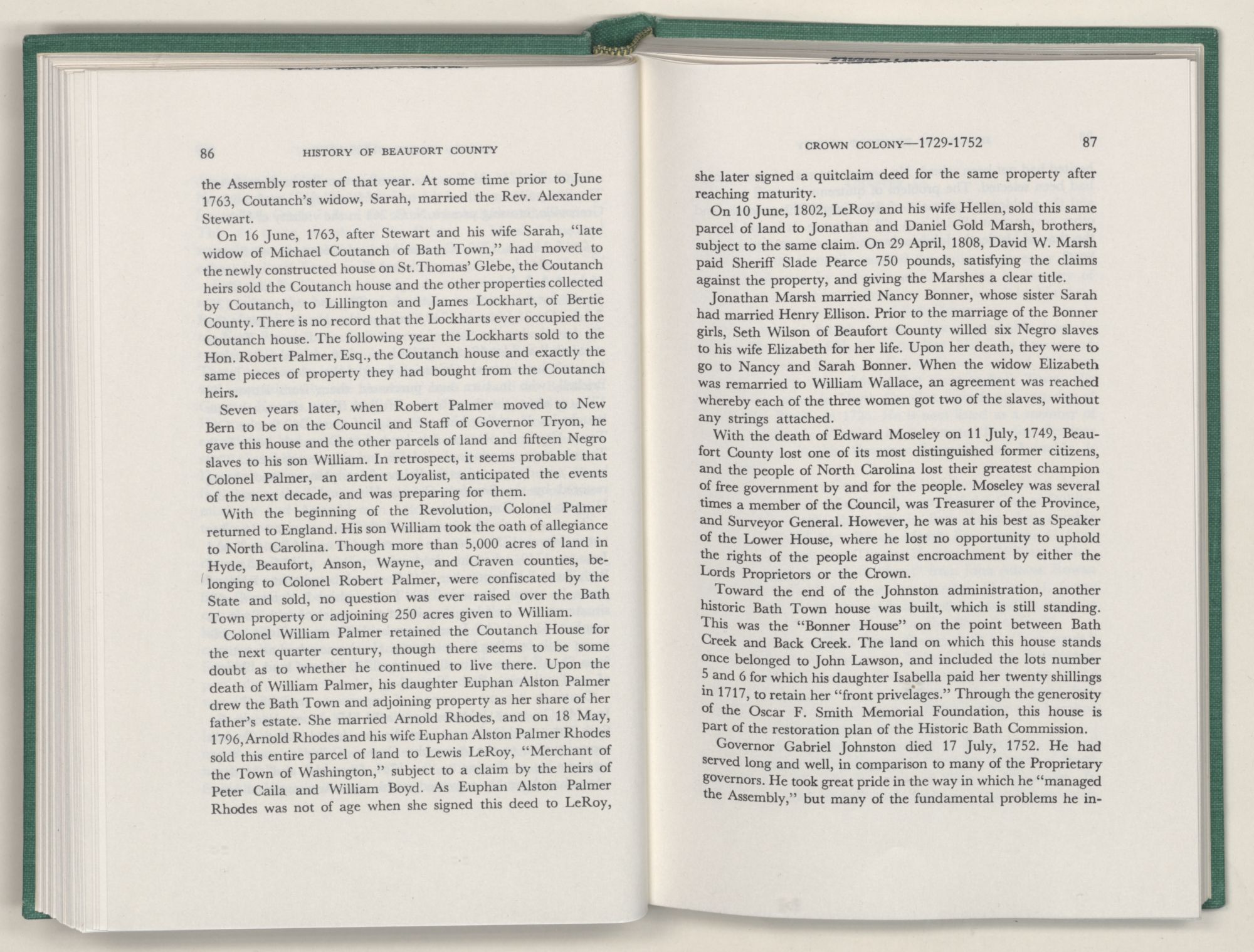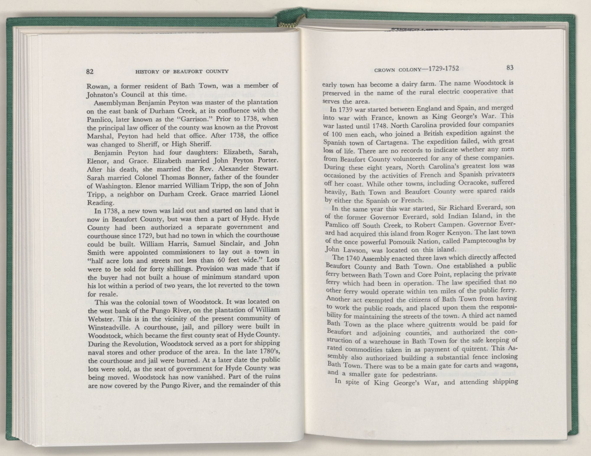 For the material contained herein, I am obligated to hundreds of authors and officials, both living and dead. They range from Levi Truewhite, first clerk of Bath County's court, who painstakingly recorded even such triviality as John Lawson's gift of a cow to his daughter Isabella; to the Honorable Lindsay C. Warren, whose Beaufort County's Contribution to a Notable Era of North Carolina History is an epic of North Carolina political history. I also acknowledge my indebtedness to Edmund H. Harding, Beaufort County historian and humorist, who made his vast collection of early Beaufort County material available to me. Without his promotional efforts, as President of the Beaufort County Historical Society, the publication of this volume would not have been possible.