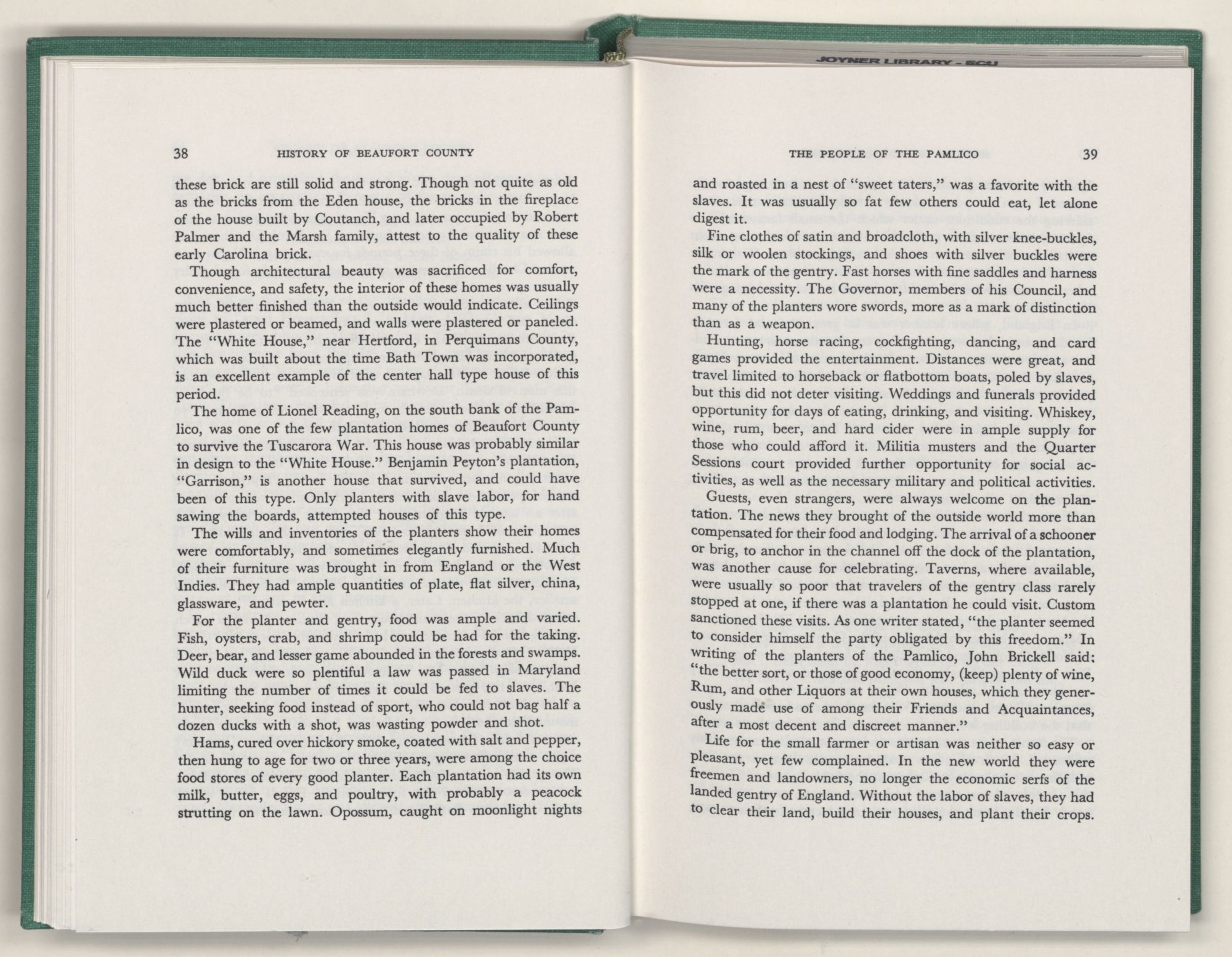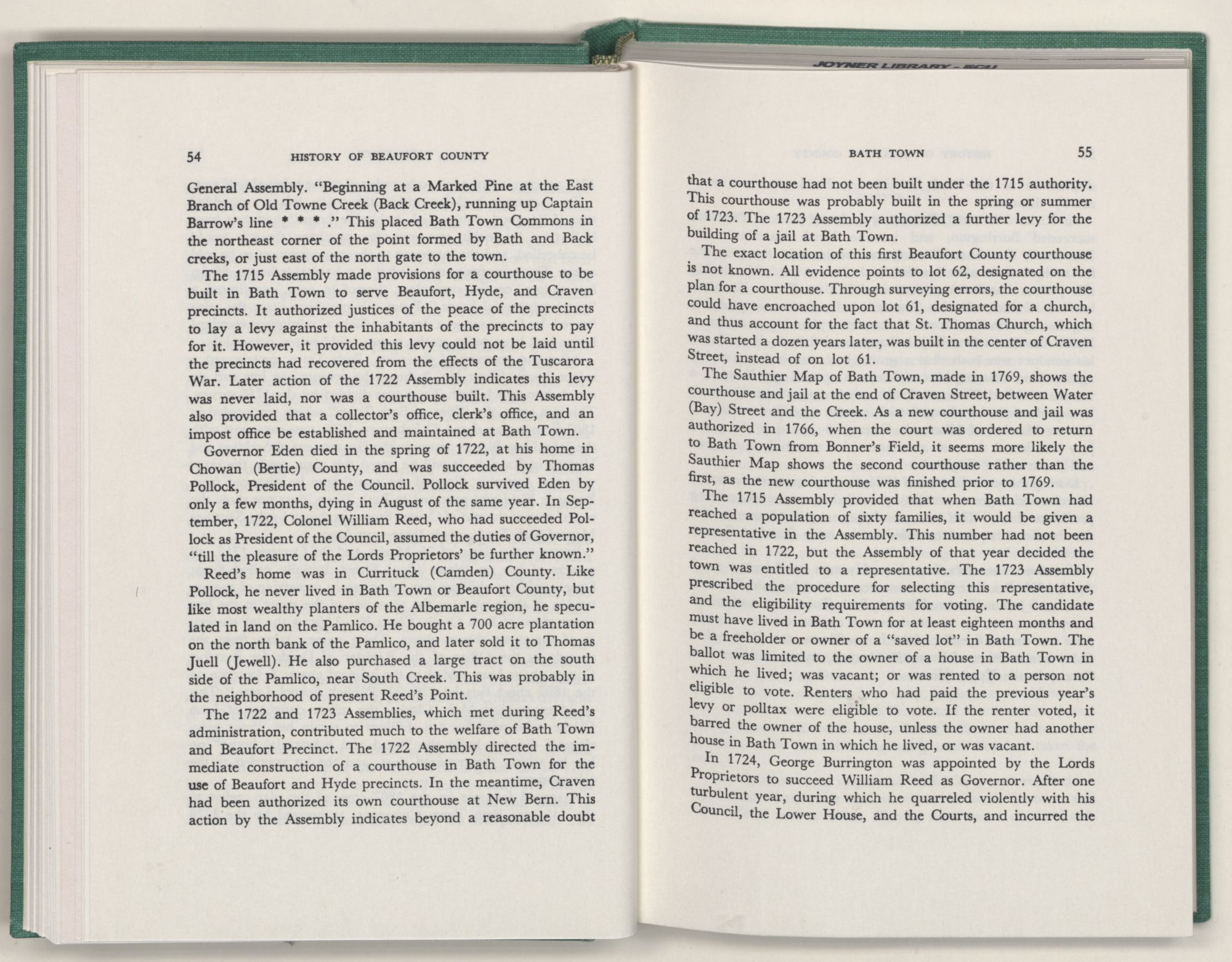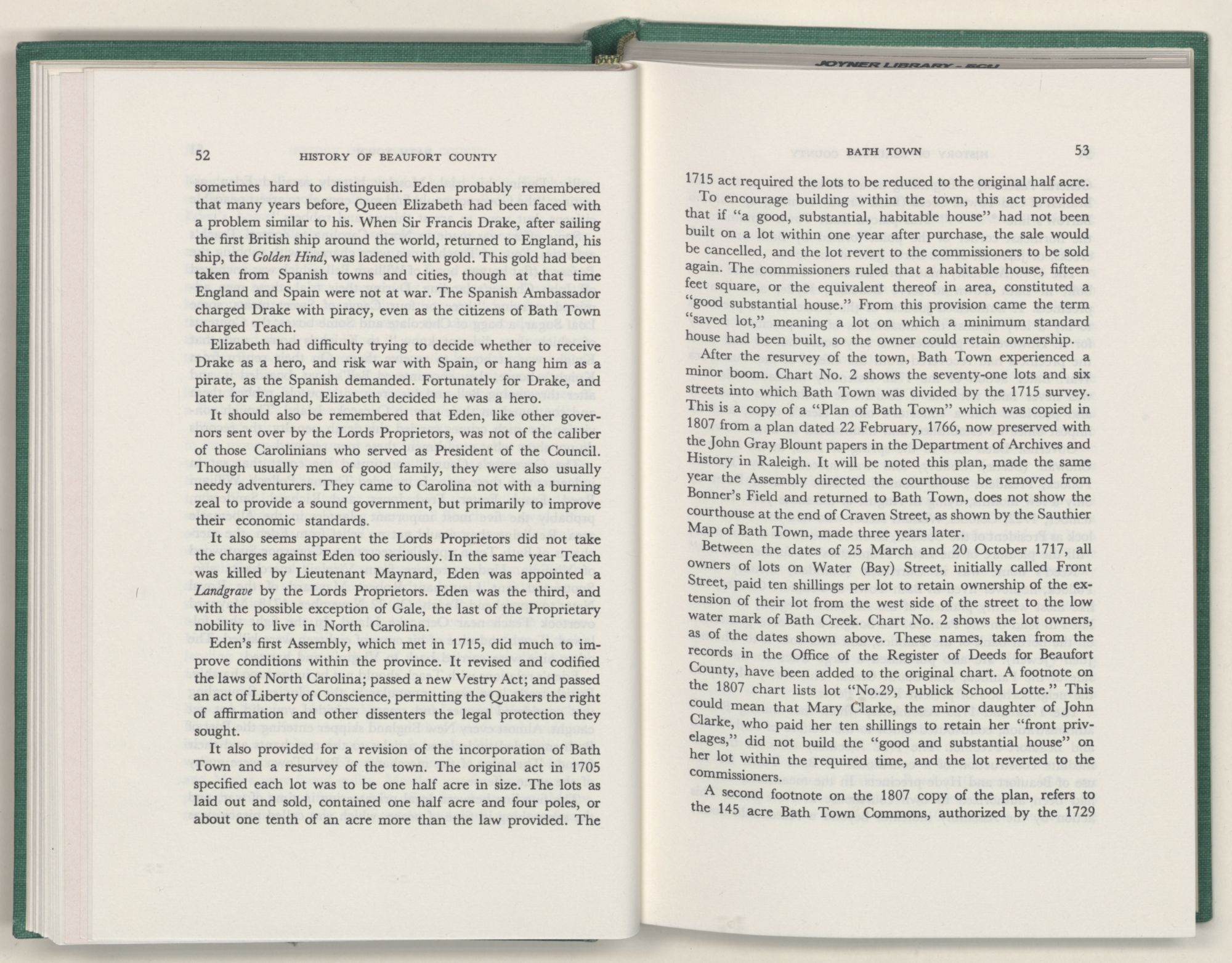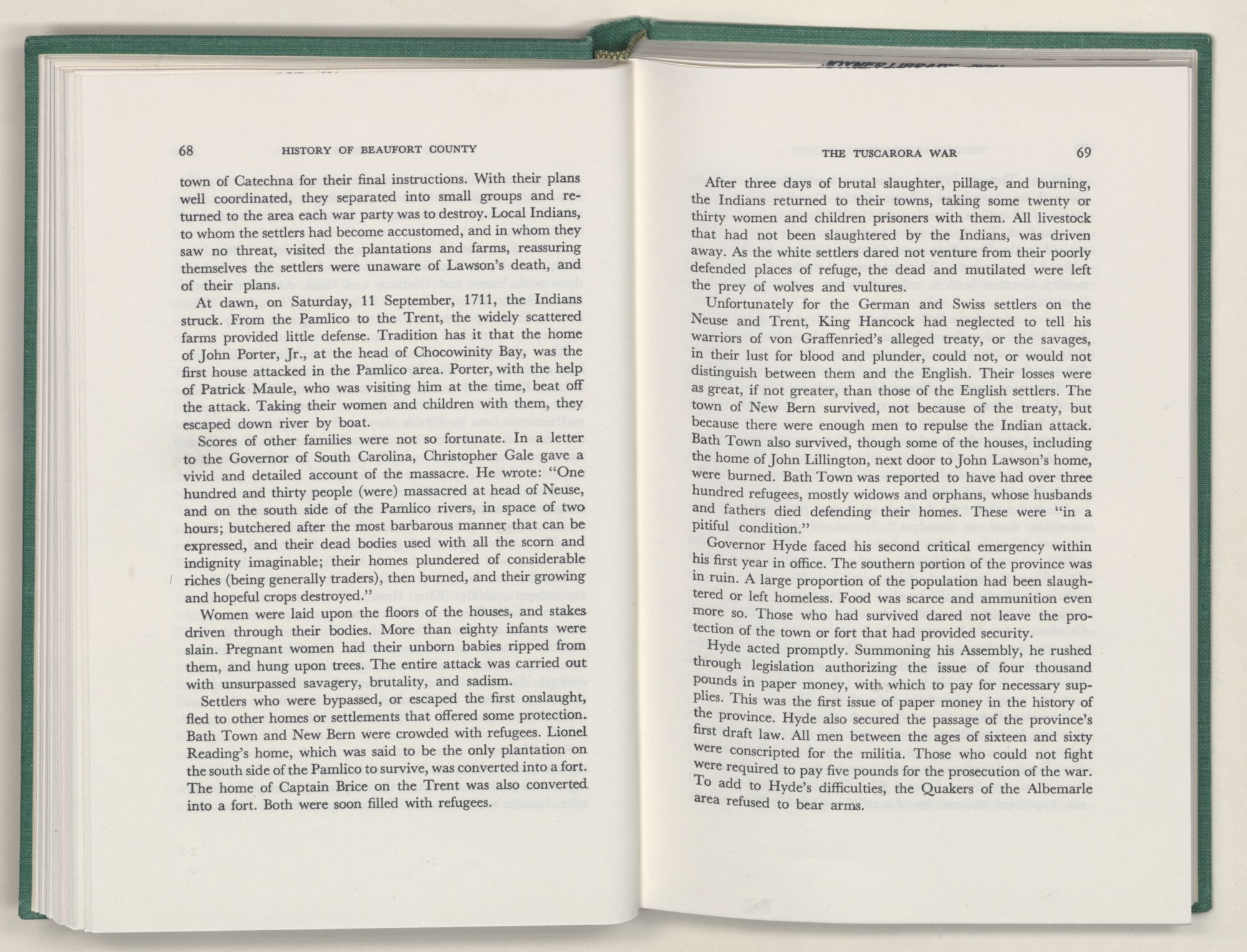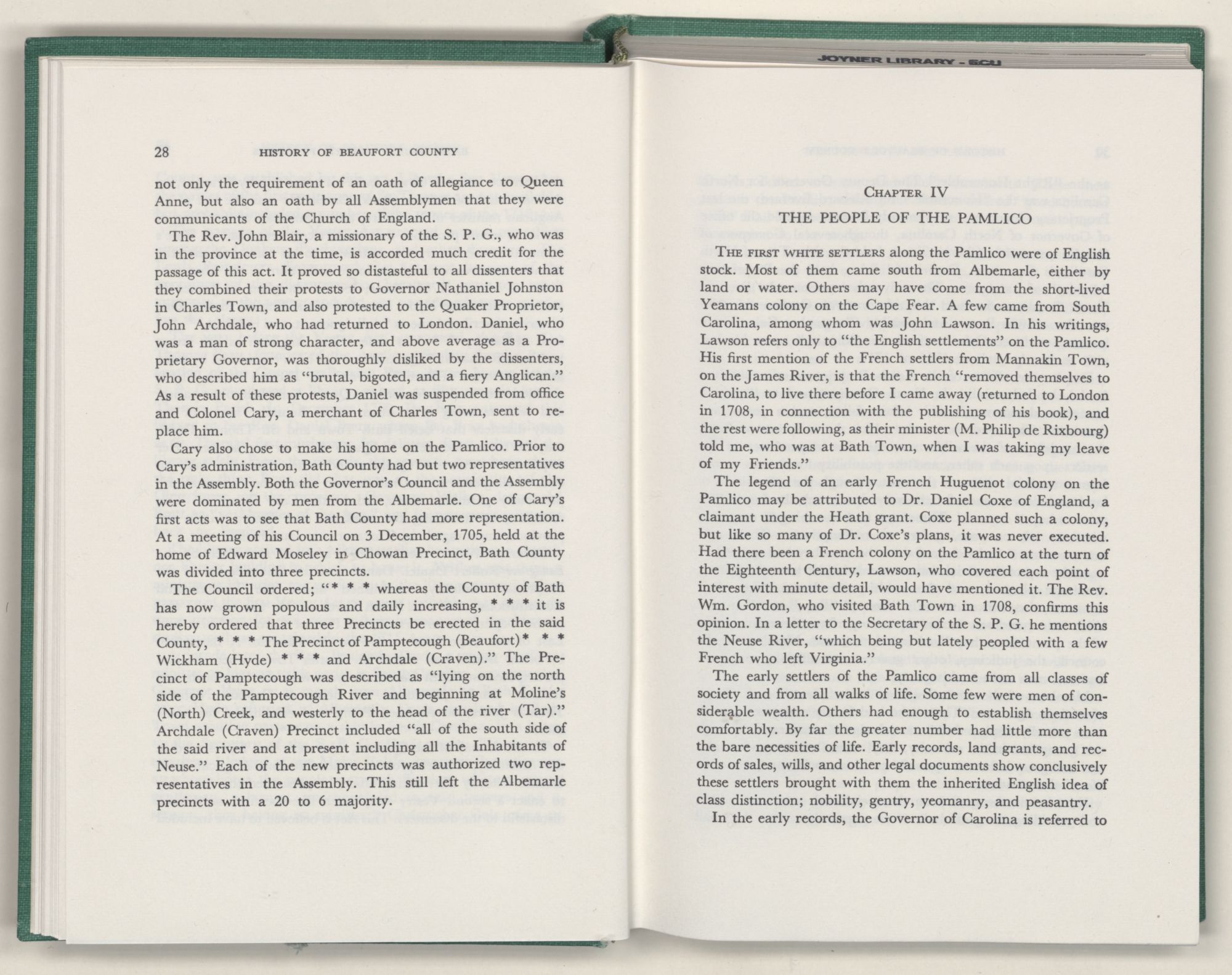 For the material contained herein, I am obligated to hundreds of authors and officials, both living and dead. They range from Levi Truewhite, first clerk of Bath County's court, who painstakingly recorded even such triviality as John Lawson's gift of a cow to his daughter Isabella; to the Honorable Lindsay C. Warren, whose Beaufort County's Contribution to a Notable Era of North Carolina History is an epic of North Carolina political history. I also acknowledge my indebtedness to Edmund H. Harding, Beaufort County historian and humorist, who made his vast collection of early Beaufort County material available to me. Without his promotional efforts, as President of the Beaufort County Historical Society, the publication of this volume would not have been possible.