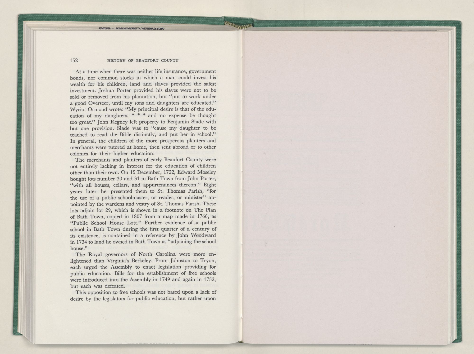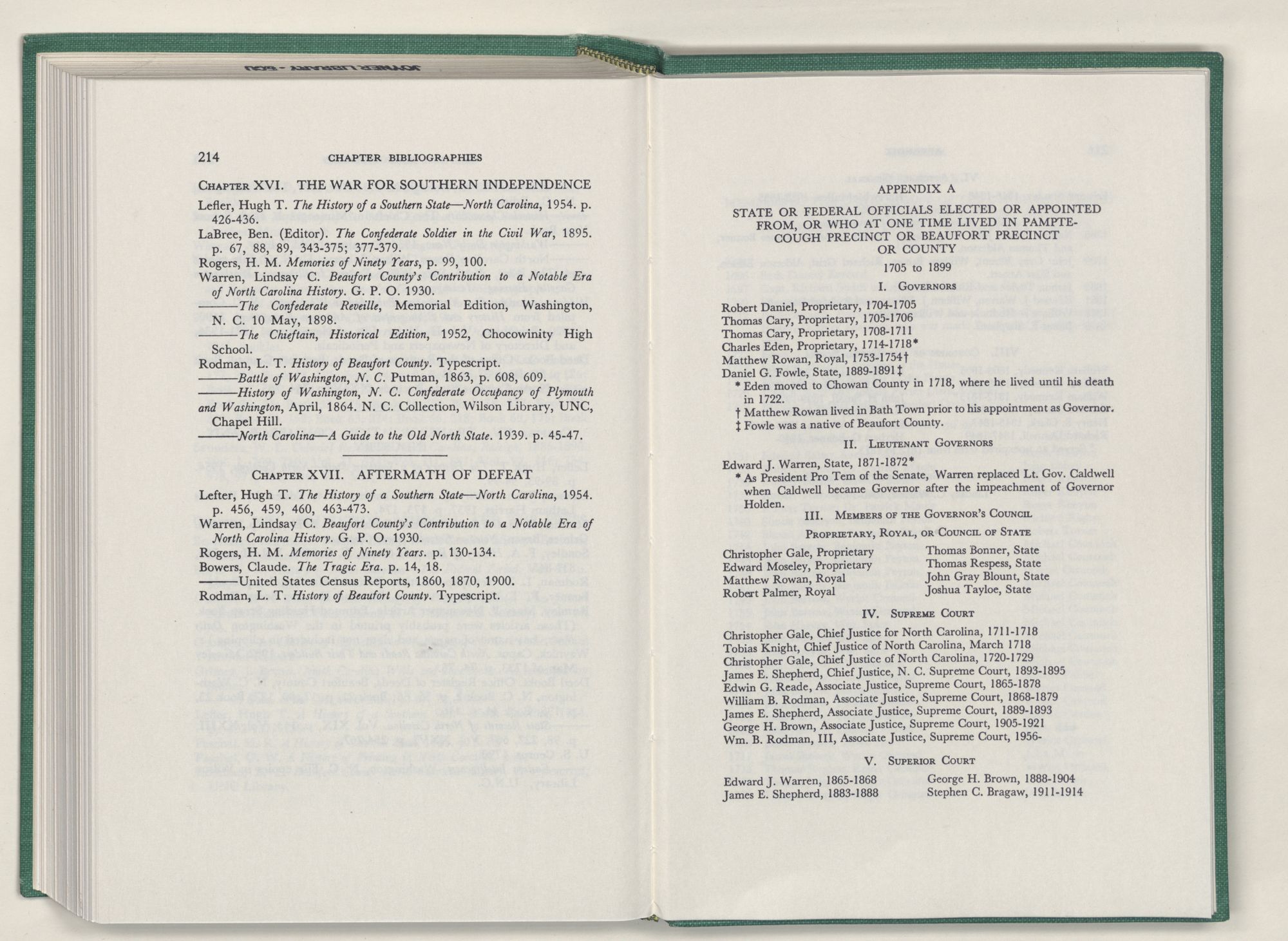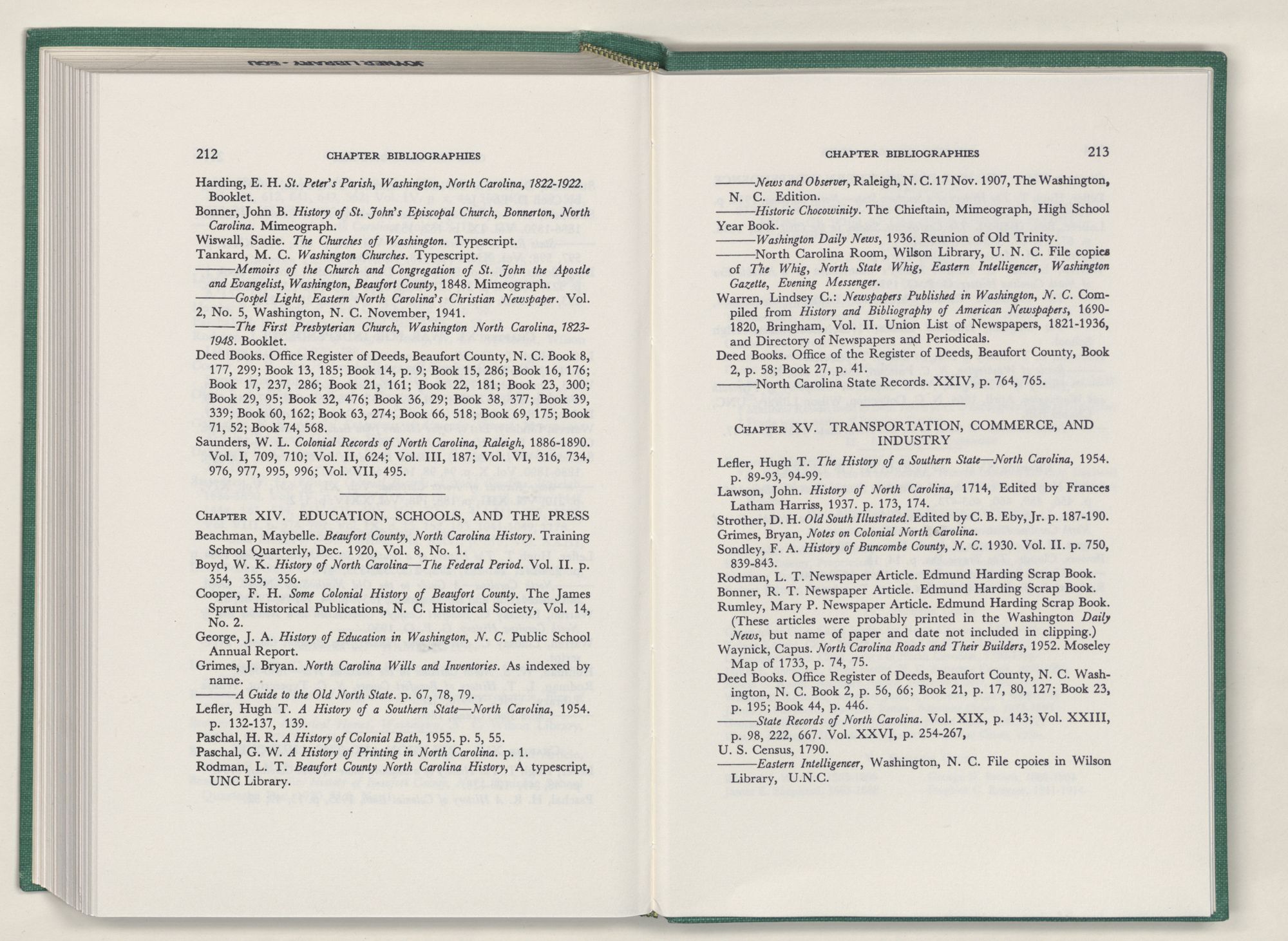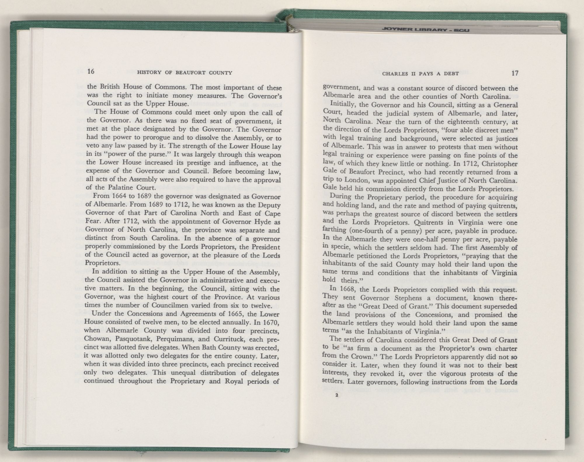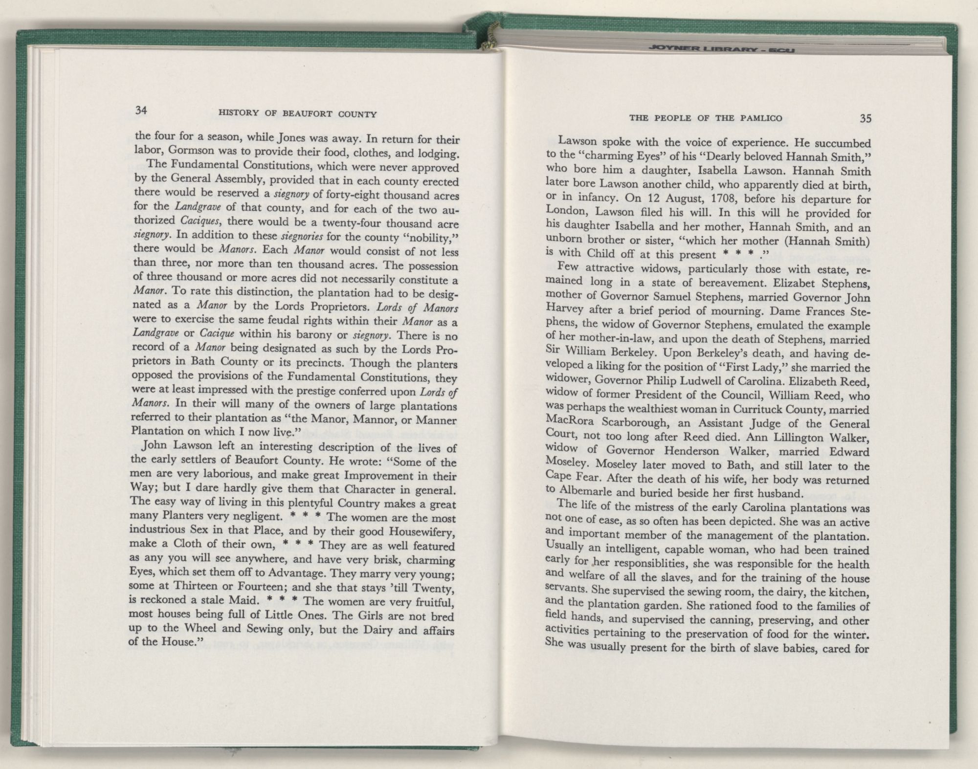 For the material contained herein, I am obligated to hundreds of authors and officials, both living and dead. They range from Levi Truewhite, first clerk of Bath County's court, who painstakingly recorded even such triviality as John Lawson's gift of a cow to his daughter Isabella; to the Honorable Lindsay C. Warren, whose Beaufort County's Contribution to a Notable Era of North Carolina History is an epic of North Carolina political history. I also acknowledge my indebtedness to Edmund H. Harding, Beaufort County historian and humorist, who made his vast collection of early Beaufort County material available to me. Without his promotional efforts, as President of the Beaufort County Historical Society, the publication of this volume would not have been possible.