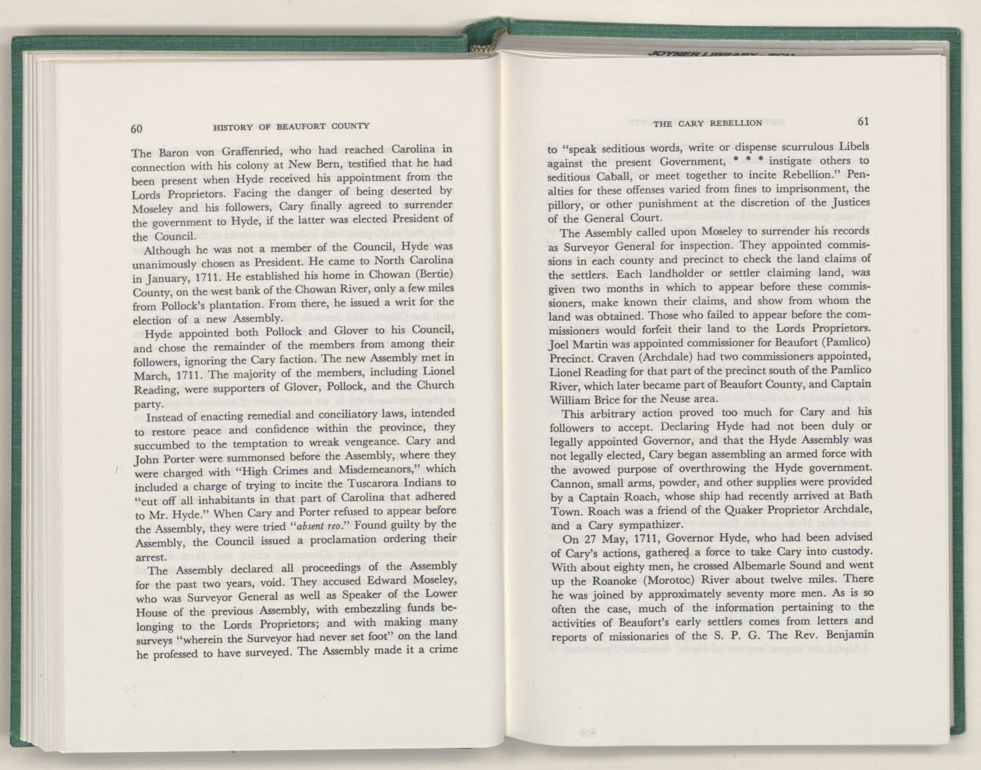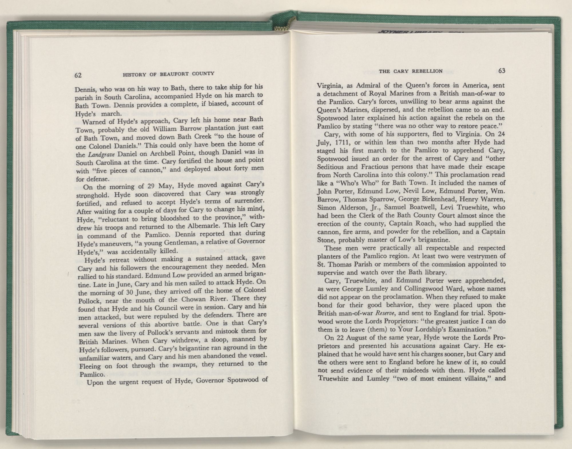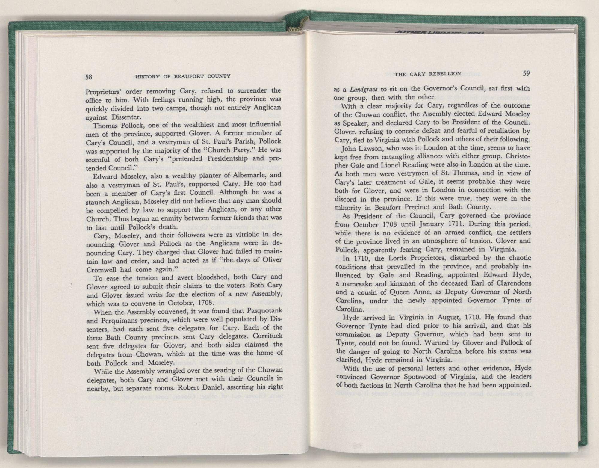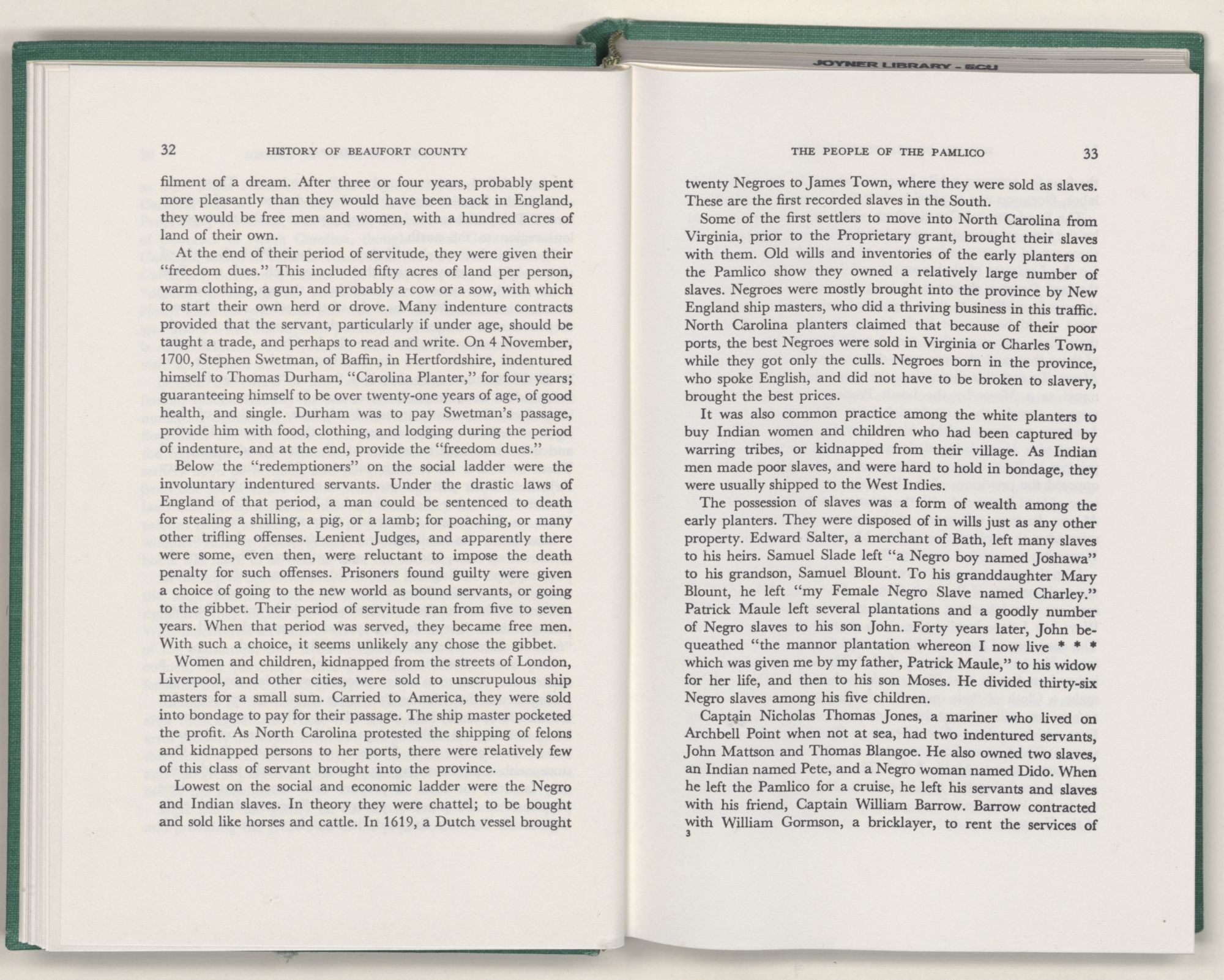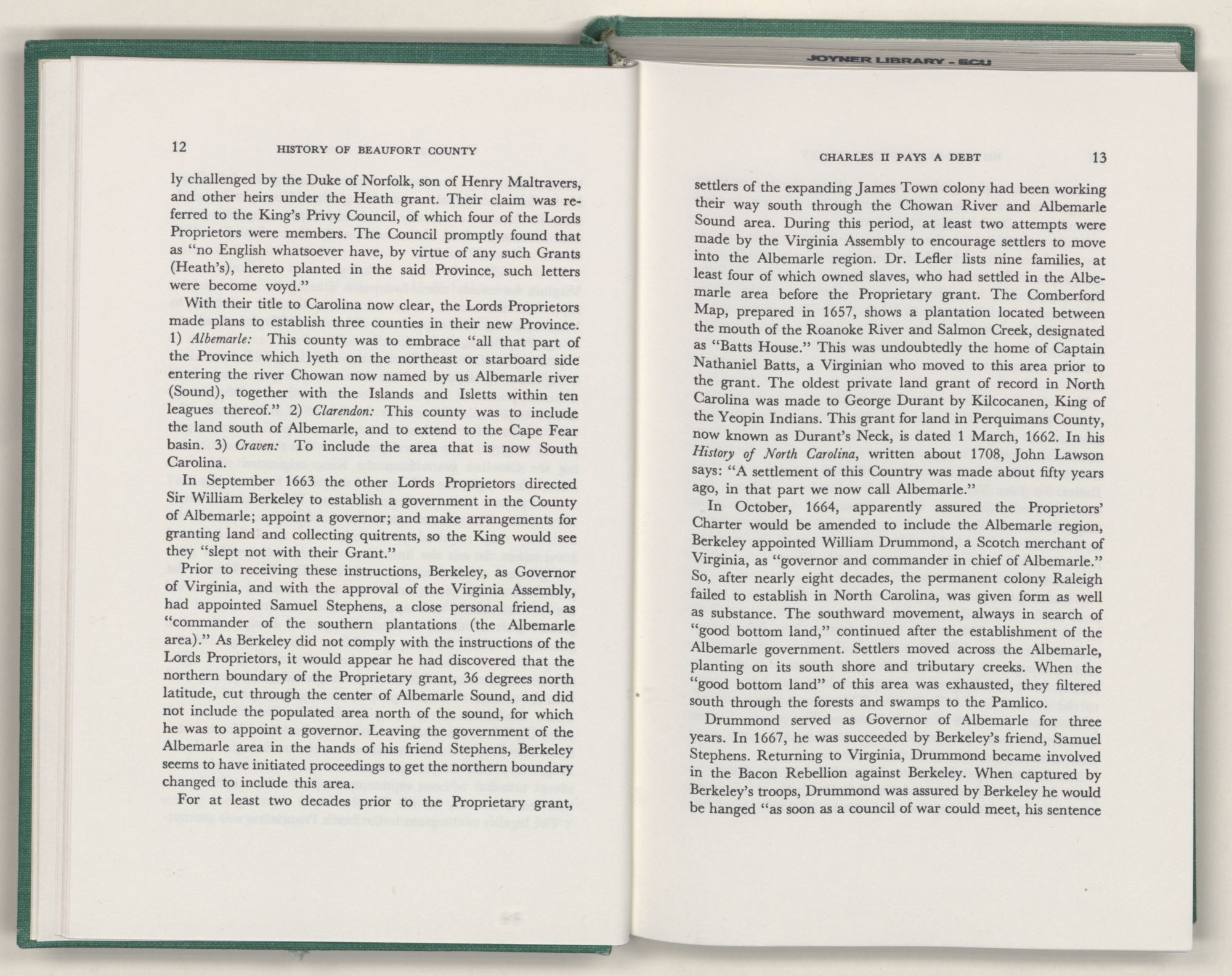 For the material contained herein, I am obligated to hundreds of authors and officials, both living and dead. They range from Levi Truewhite, first clerk of Bath County's court, who painstakingly recorded even such triviality as John Lawson's gift of a cow to his daughter Isabella; to the Honorable Lindsay C. Warren, whose Beaufort County's Contribution to a Notable Era of North Carolina History is an epic of North Carolina political history. I also acknowledge my indebtedness to Edmund H. Harding, Beaufort County historian and humorist, who made his vast collection of early Beaufort County material available to me. Without his promotional efforts, as President of the Beaufort County Historical Society, the publication of this volume would not have been possible.
