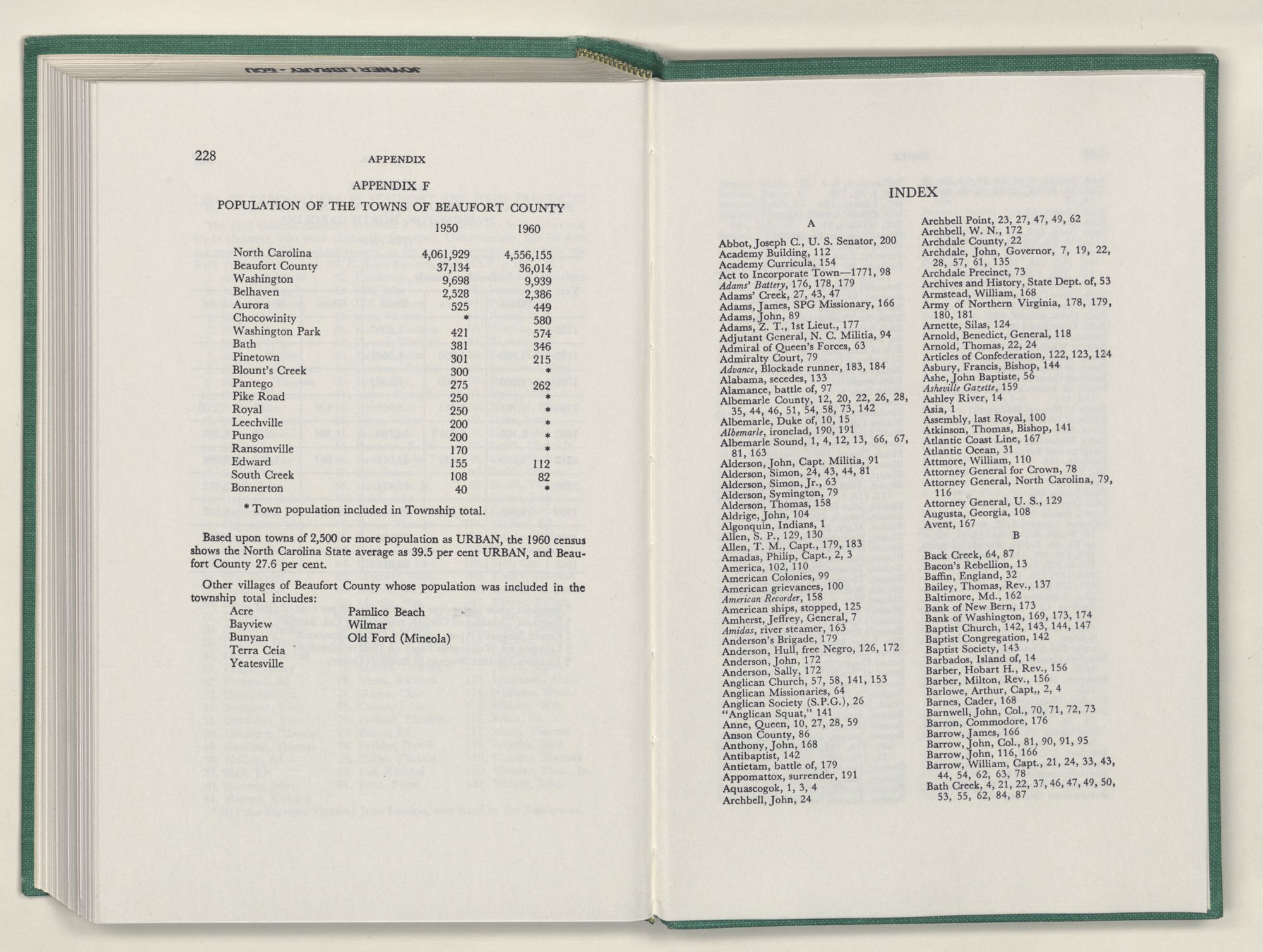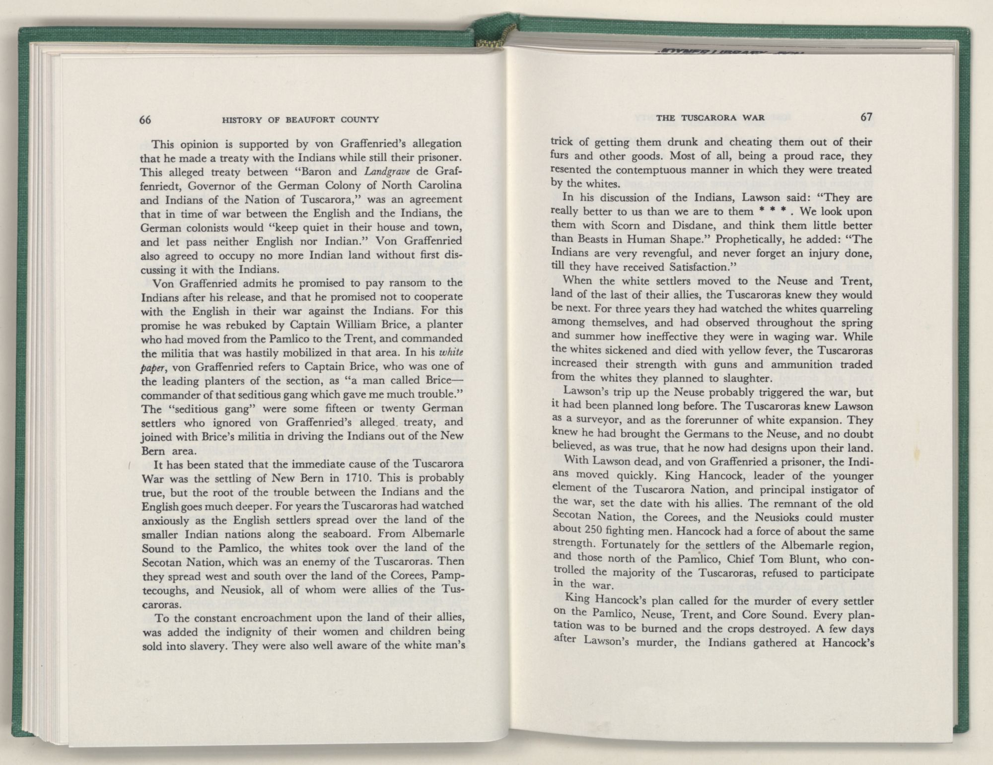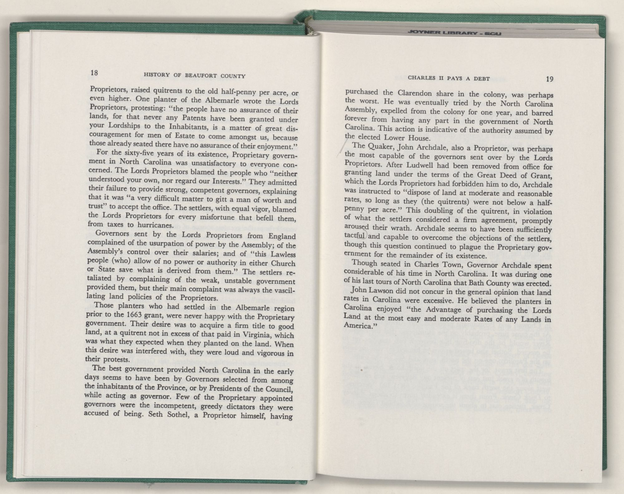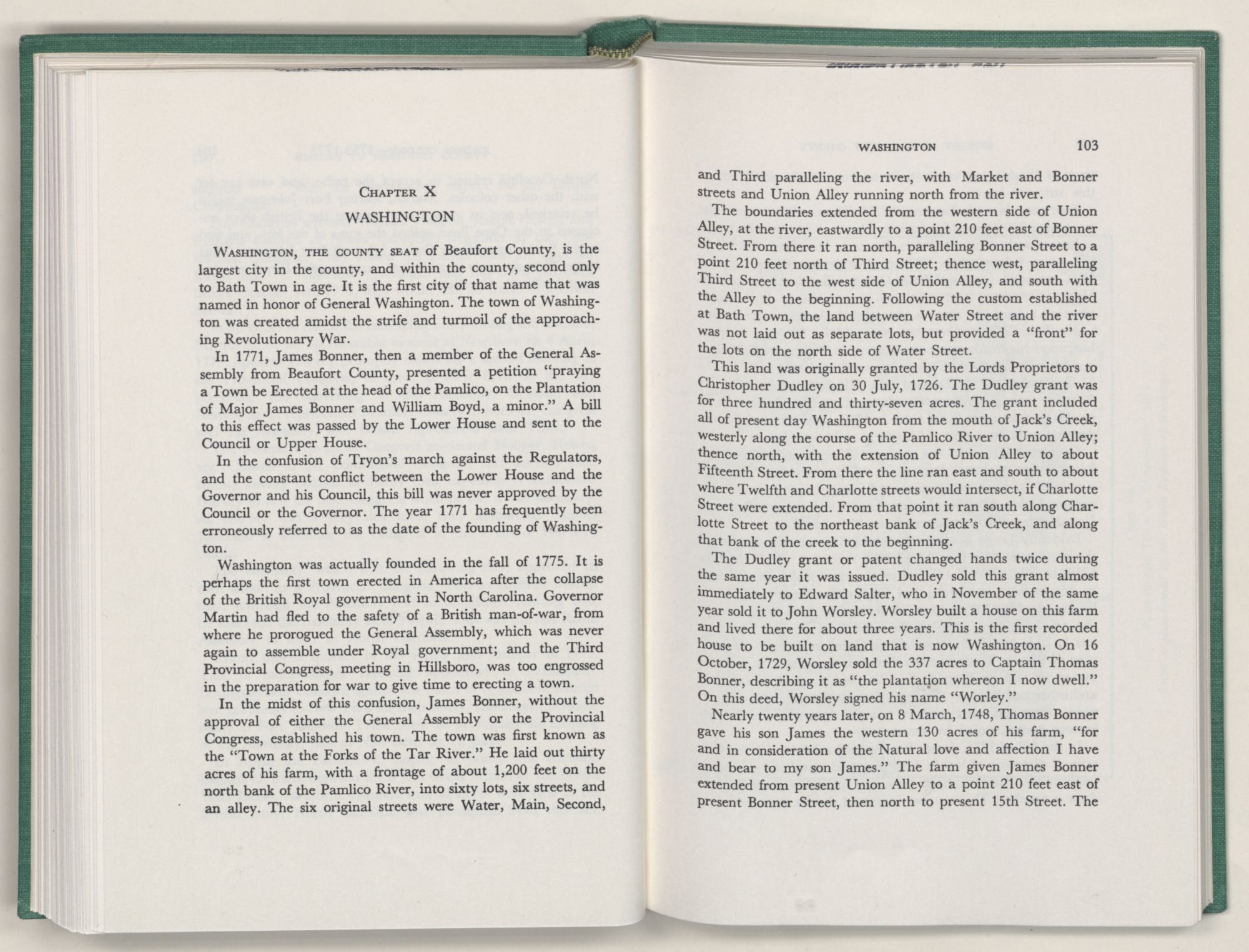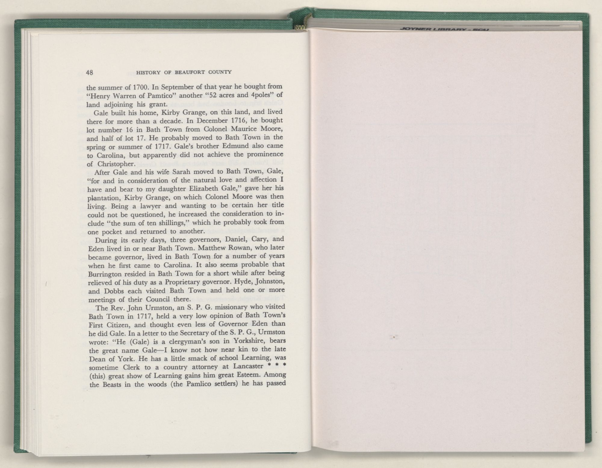 For the material contained herein, I am obligated to hundreds of authors and officials, both living and dead. They range from Levi Truewhite, first clerk of Bath County's court, who painstakingly recorded even such triviality as John Lawson's gift of a cow to his daughter Isabella; to the Honorable Lindsay C. Warren, whose Beaufort County's Contribution to a Notable Era of North Carolina History is an epic of North Carolina political history. I also acknowledge my indebtedness to Edmund H. Harding, Beaufort County historian and humorist, who made his vast collection of early Beaufort County material available to me. Without his promotional efforts, as President of the Beaufort County Historical Society, the publication of this volume would not have been possible.