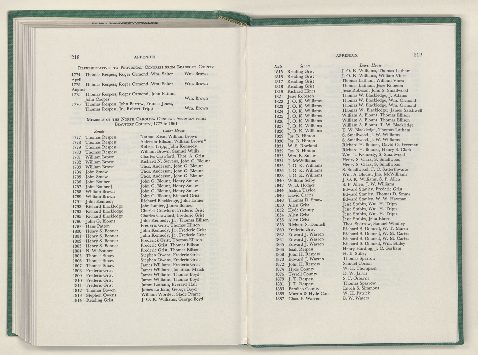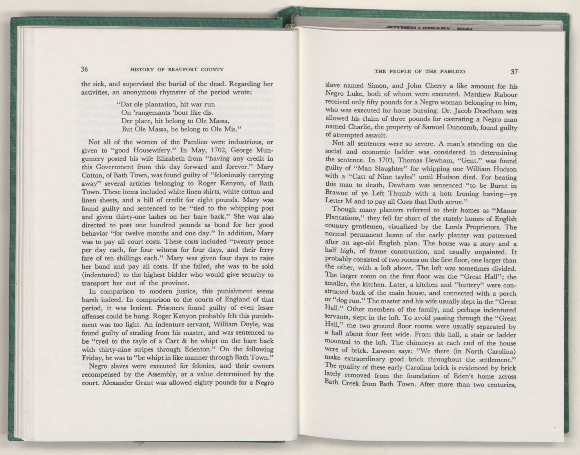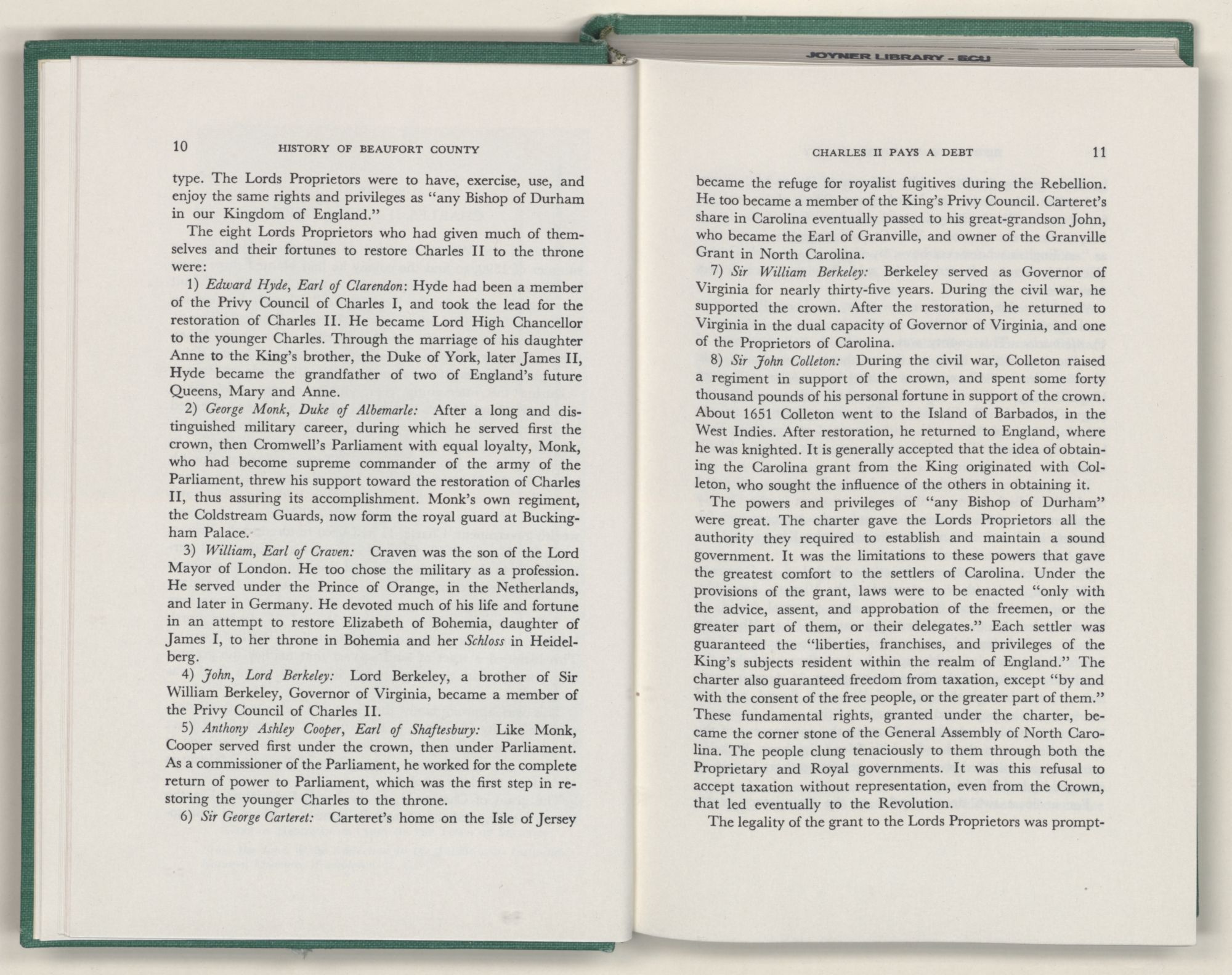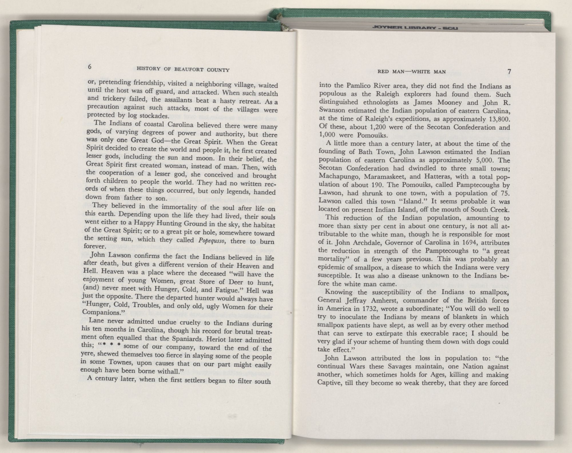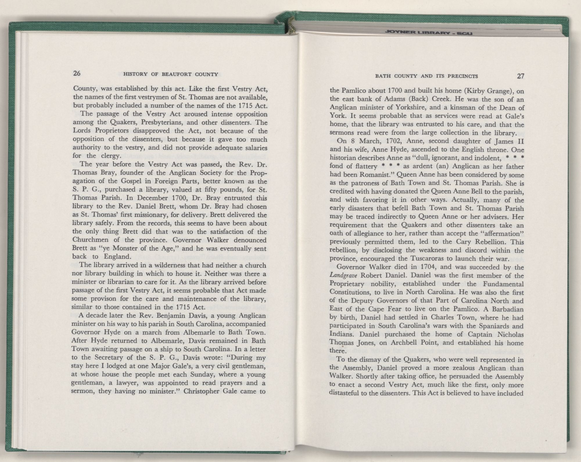 For the material contained herein, I am obligated to hundreds of authors and officials, both living and dead. They range from Levi Truewhite, first clerk of Bath County's court, who painstakingly recorded even such triviality as John Lawson's gift of a cow to his daughter Isabella; to the Honorable Lindsay C. Warren, whose Beaufort County's Contribution to a Notable Era of North Carolina History is an epic of North Carolina political history. I also acknowledge my indebtedness to Edmund H. Harding, Beaufort County historian and humorist, who made his vast collection of early Beaufort County material available to me. Without his promotional efforts, as President of the Beaufort County Historical Society, the publication of this volume would not have been possible.