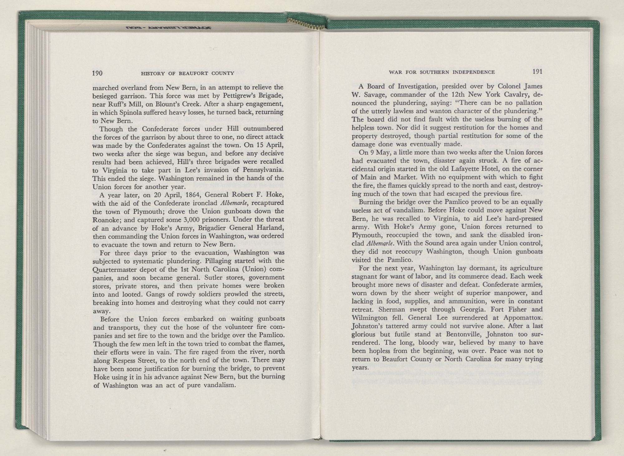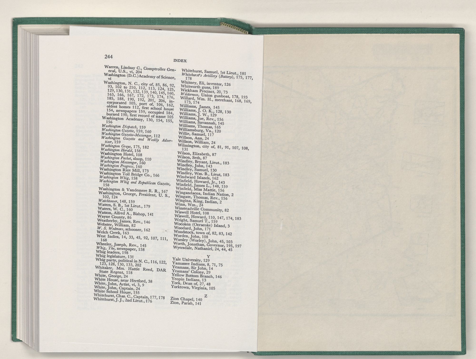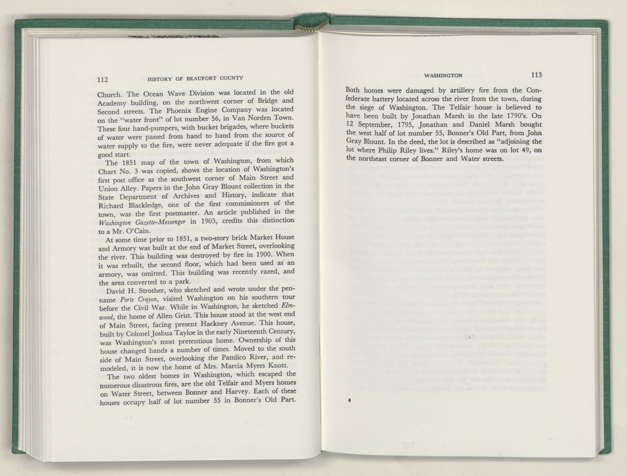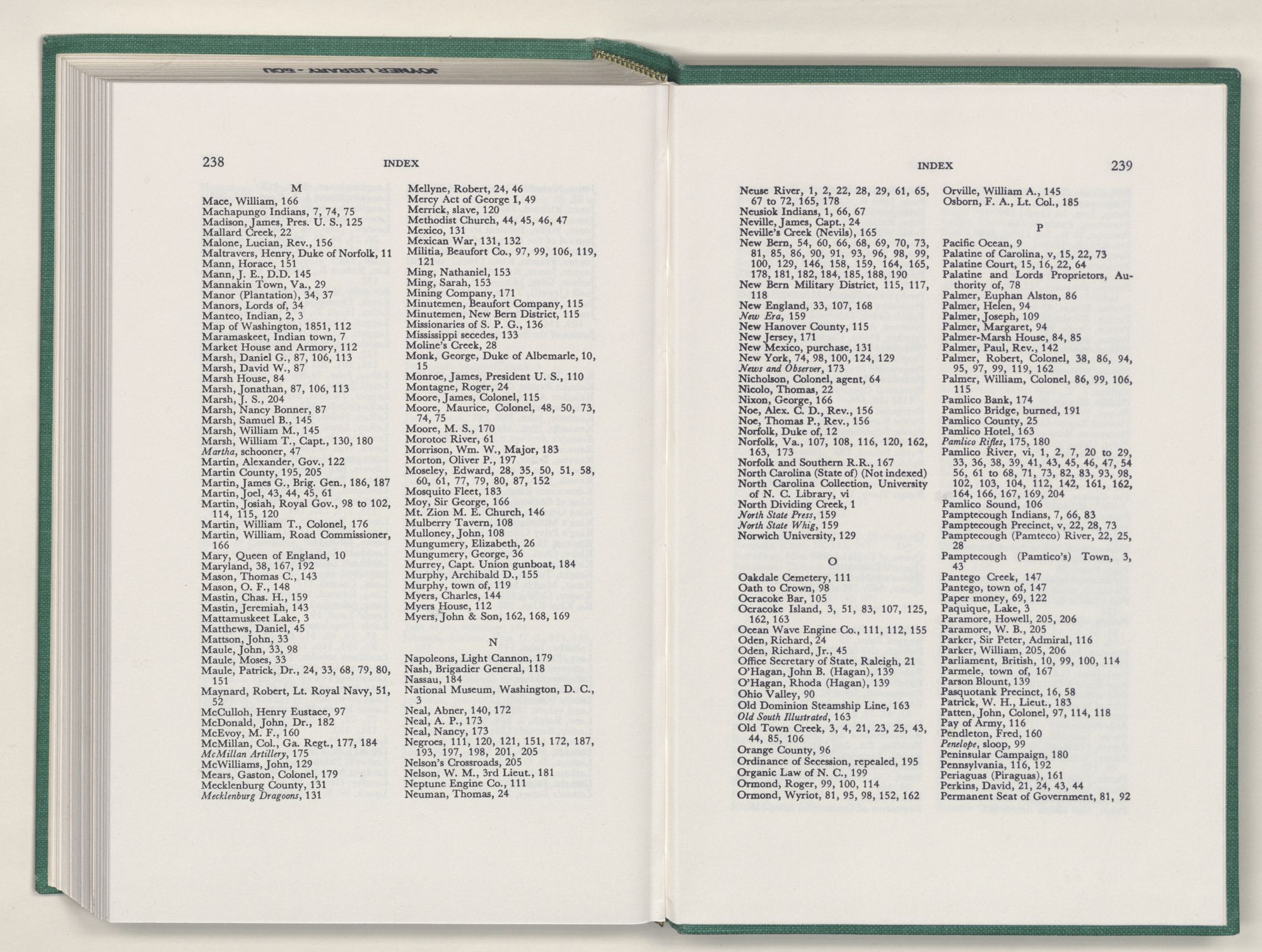 Washington, N. C., city of, 85, 86, 92, 93, 102 to 210, 112, 113, 124, 125, 129, 130, 131, 132, 139, 140, 145, 160, 163, 166, 167, 172, 173, 174, 176, 185, 188, 190, 192, 201, 206, incorporated 105, port of, 106, 162, oldest homes 112, first school house 154, newspapers 159, occupied 184, burned 190, first record of name 105