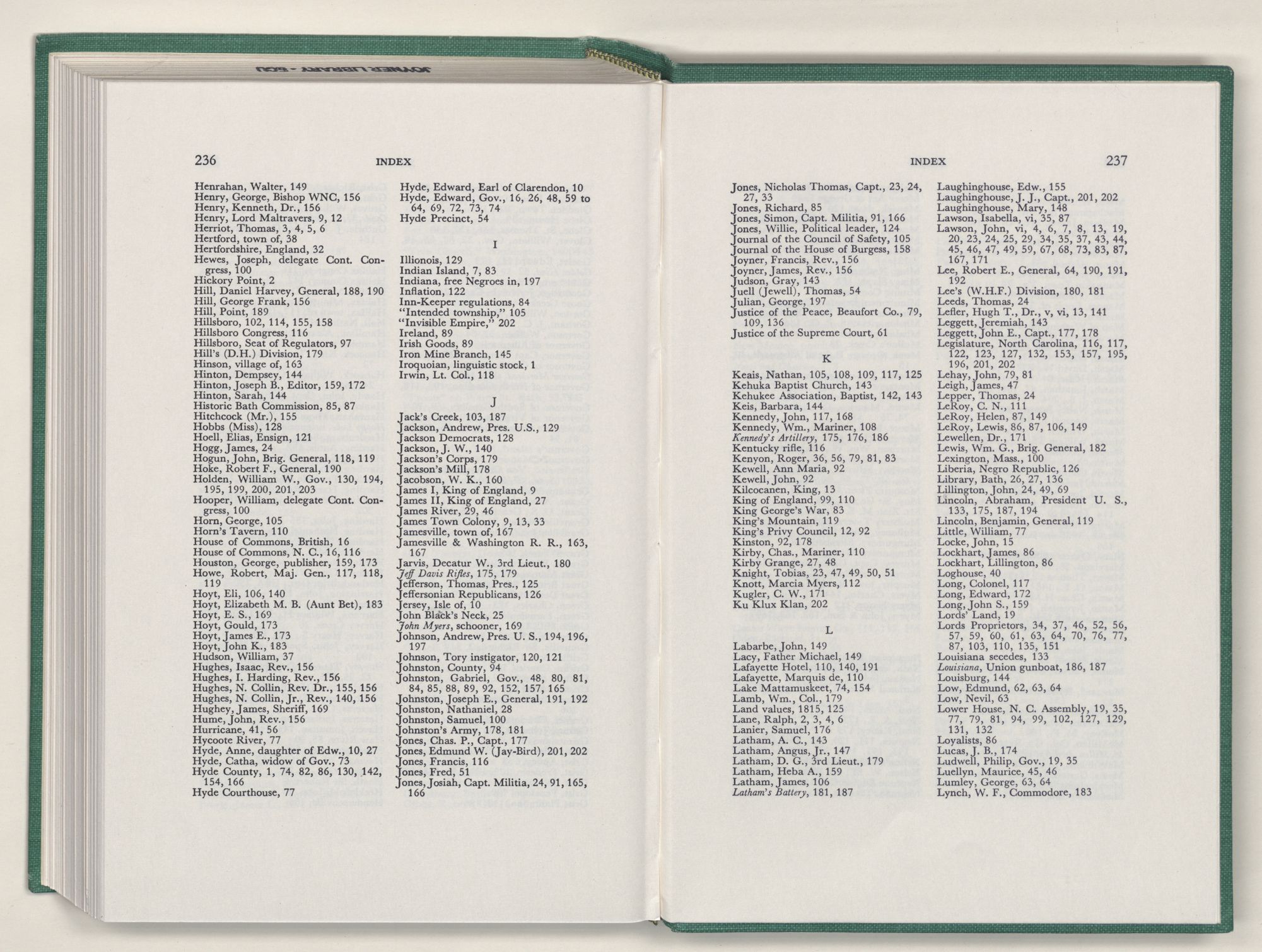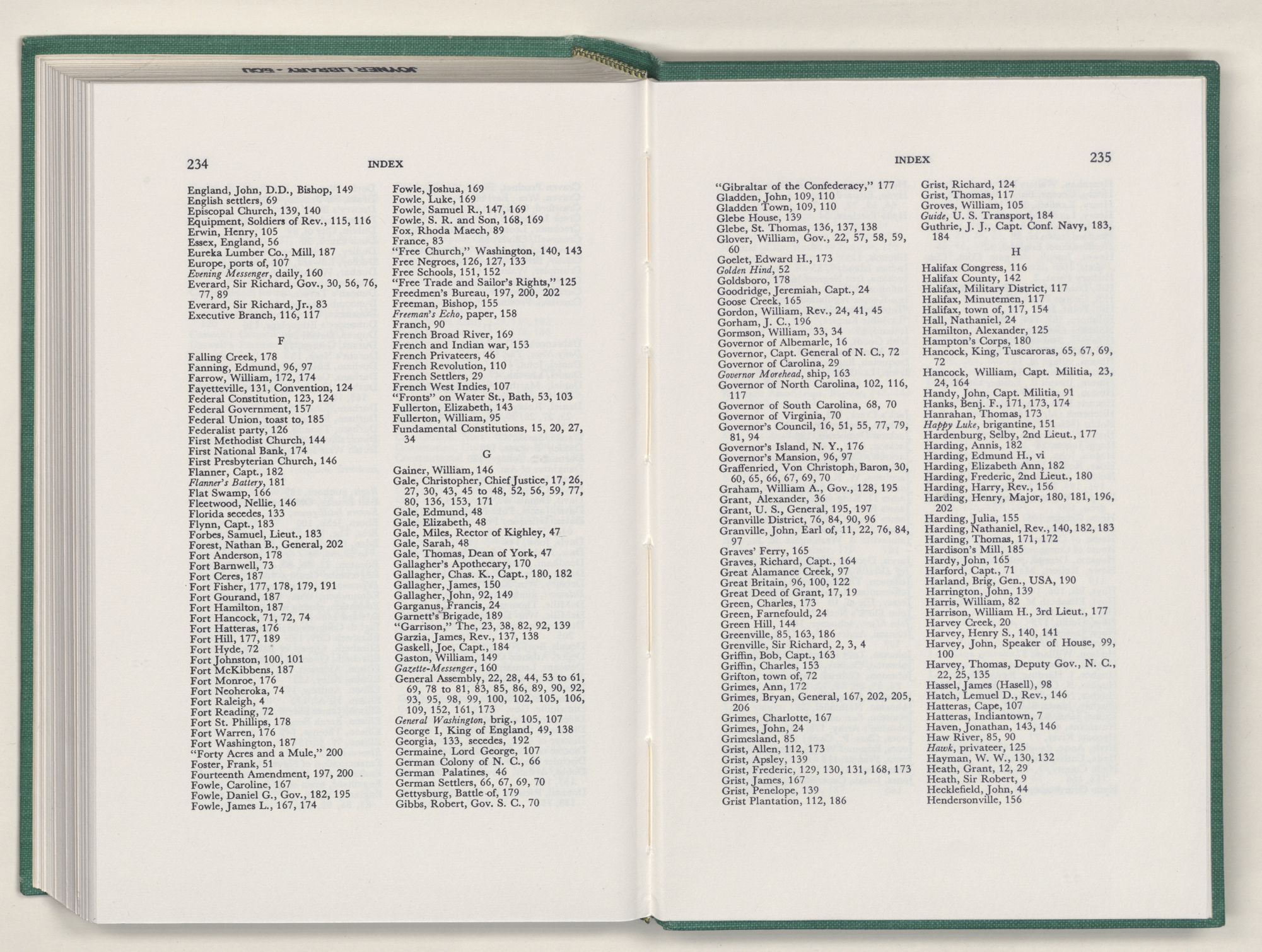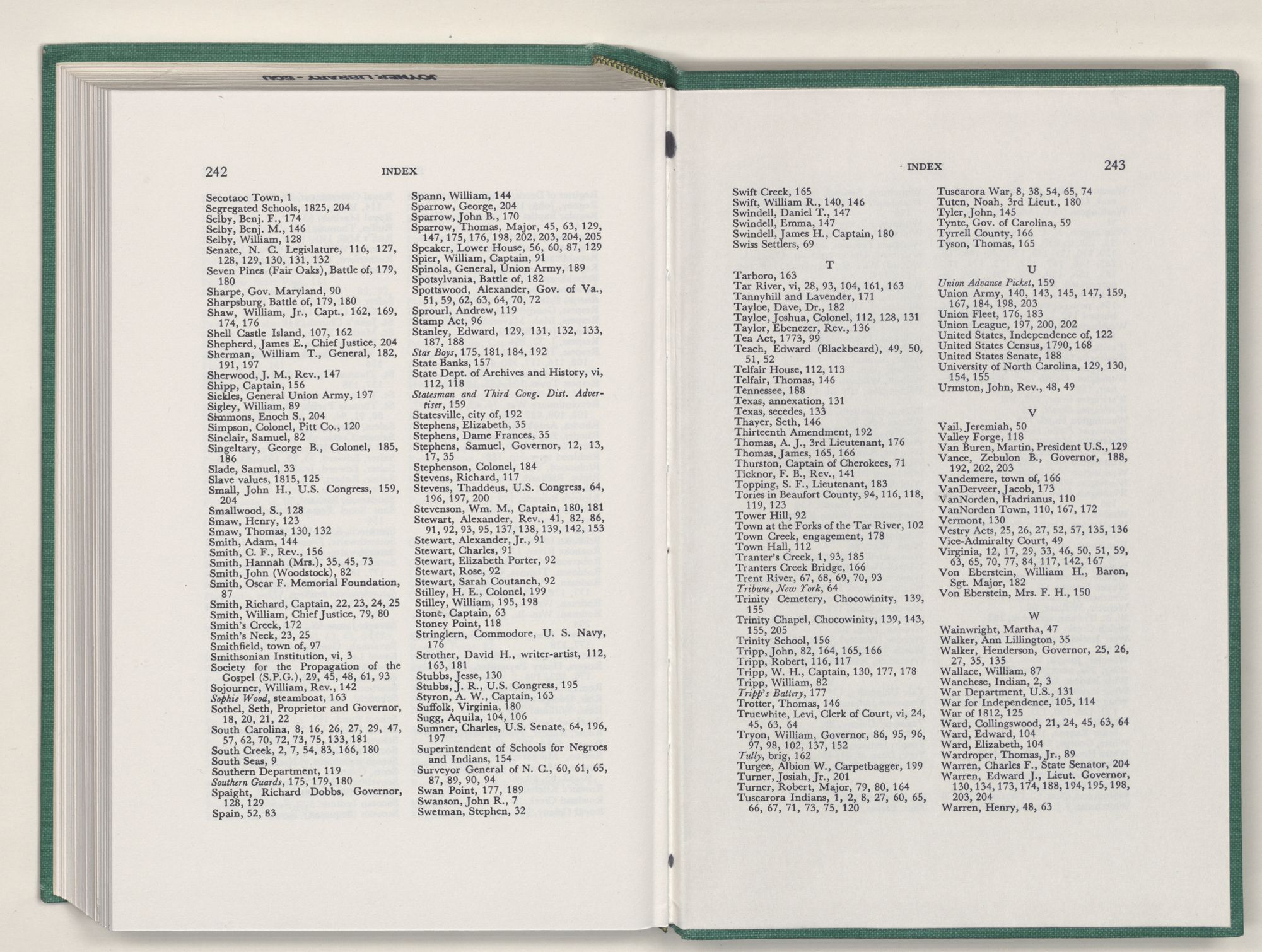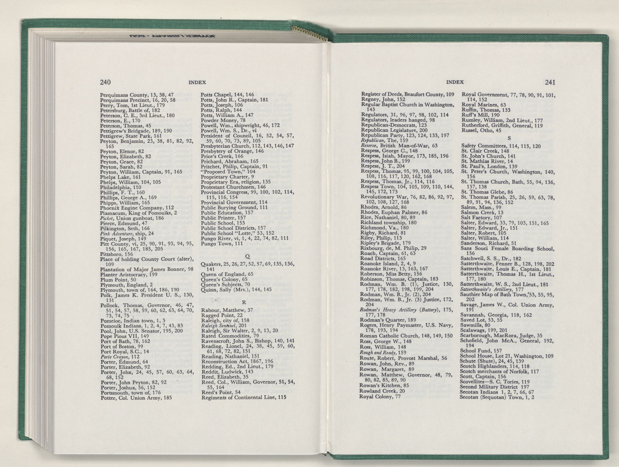 Washington, N. C., city of, 85, 86, 92, 93, 102 to 210, 112, 113, 124, 125, 129, 130, 131, 132, 139, 140, 145, 160, 163, 166, 167, 172, 173, 174, 176, 185, 188, 190, 192, 201, 206, incorporated 105, port of, 106, 162, oldest homes 112, first school house 154, newspapers 159, occupied 184, burned 190, first record of name 105