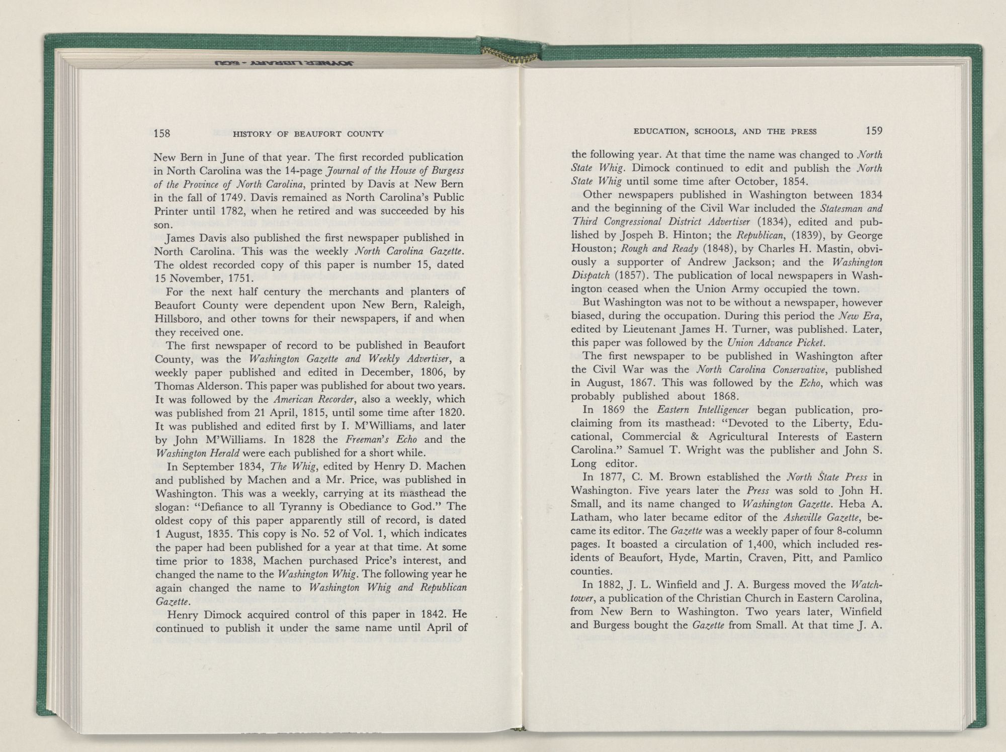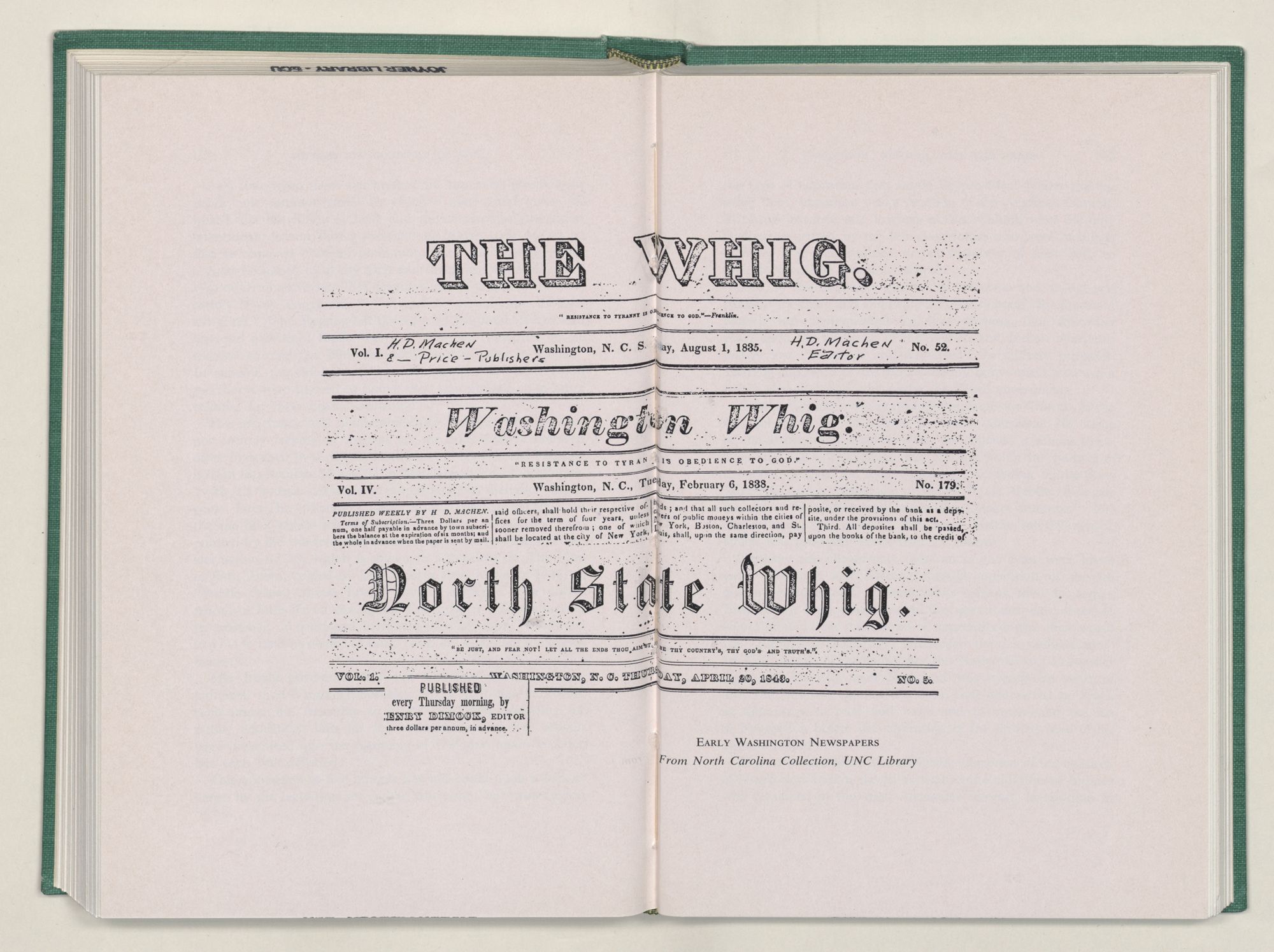 | Masthead of the newspapers Whig, August 1, 1835; the Washington Whig, February 6, 1838; and the North State Whig, April 20, 1843 | 152-153 |