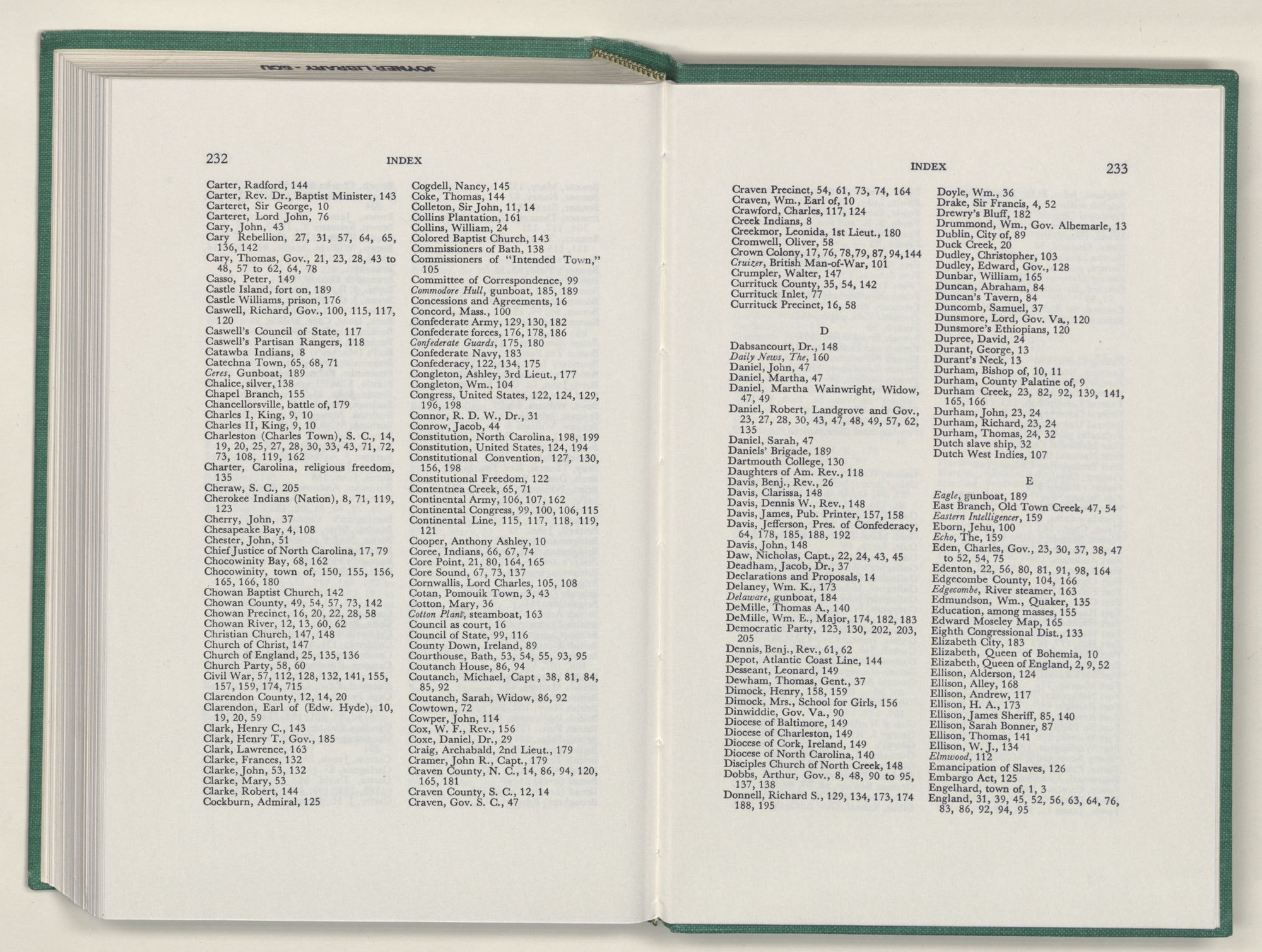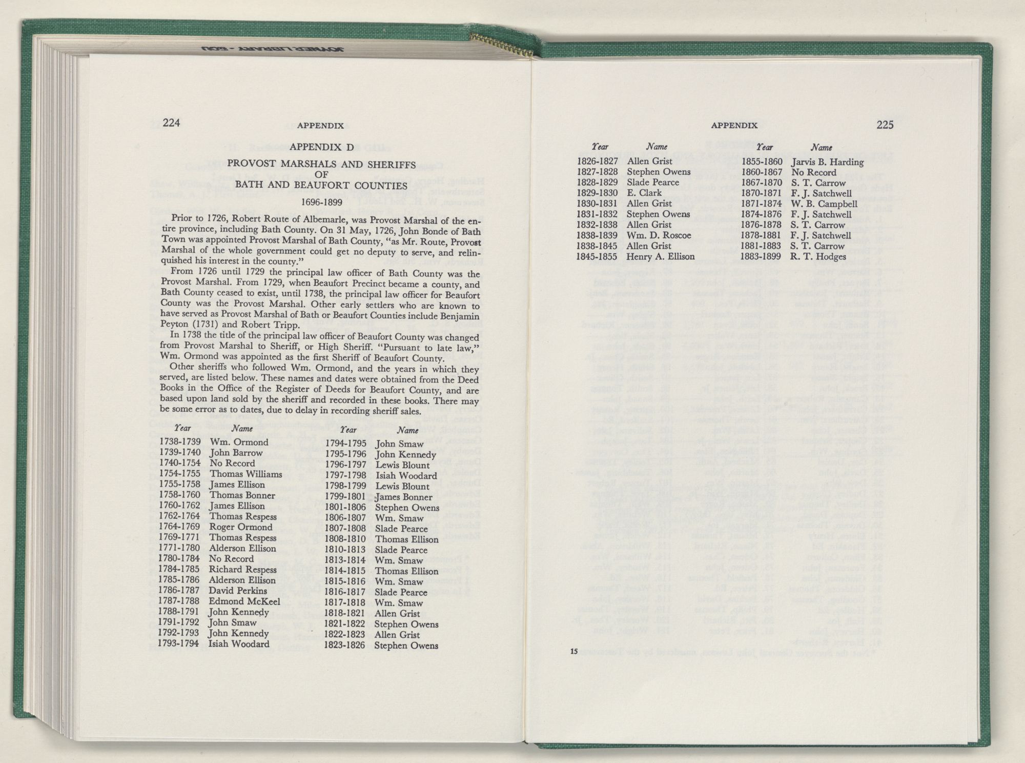 | D | Provost Marshals and Sheriffs of Bath and Beaufort Counties 1696-1899 | 224-225 |