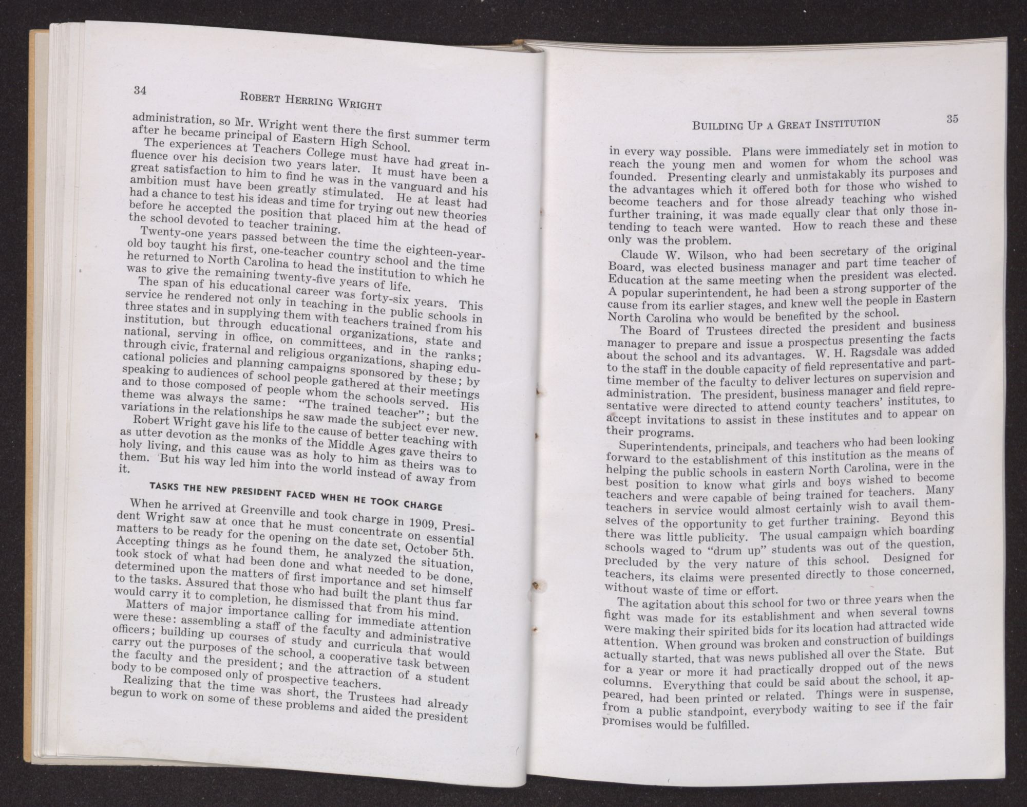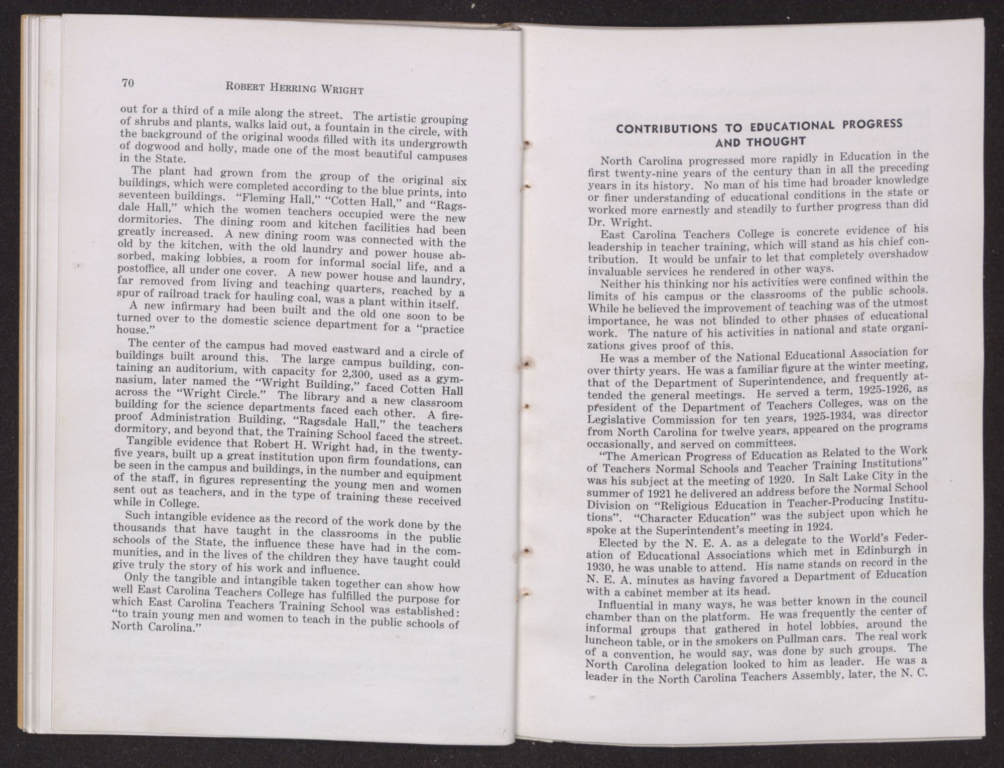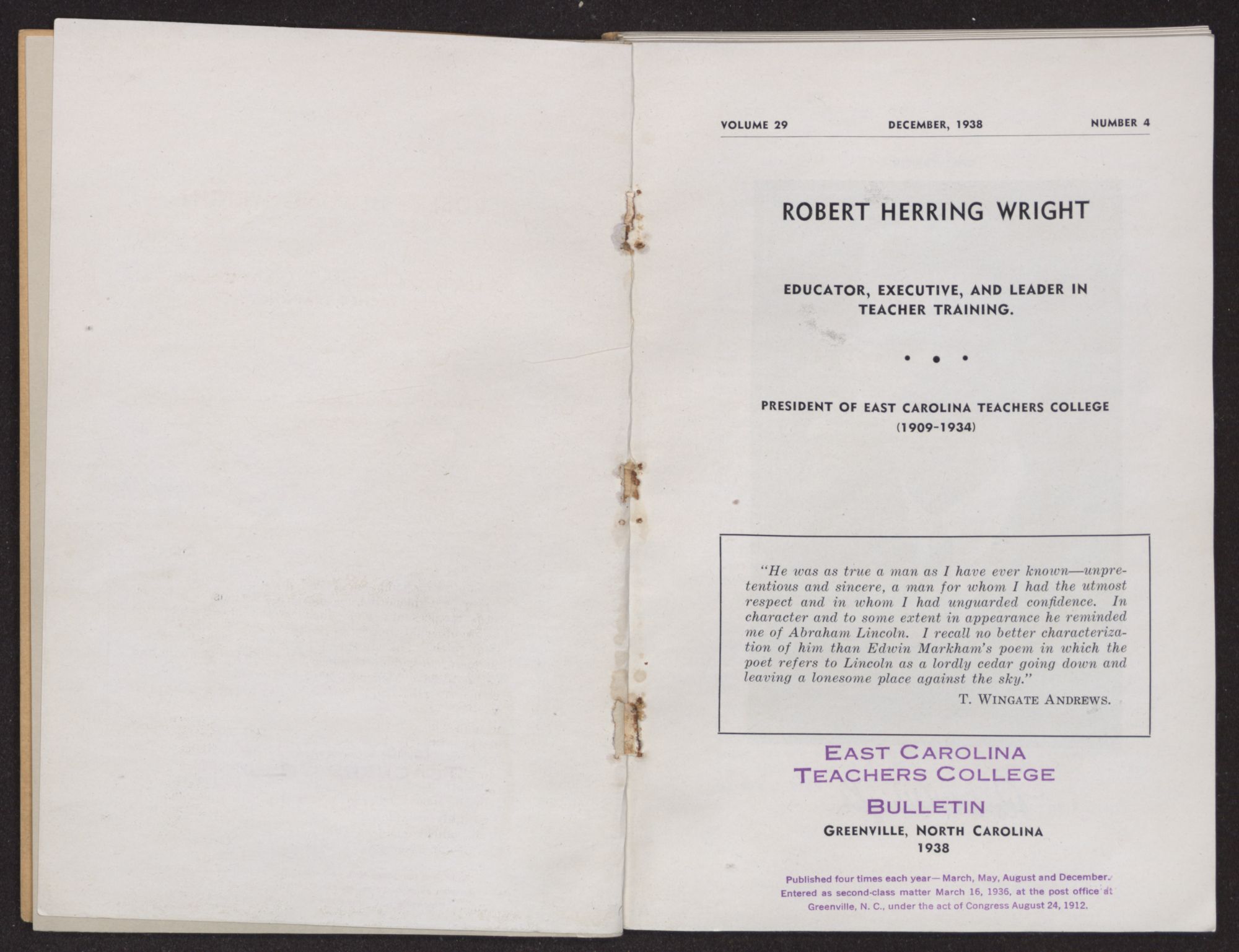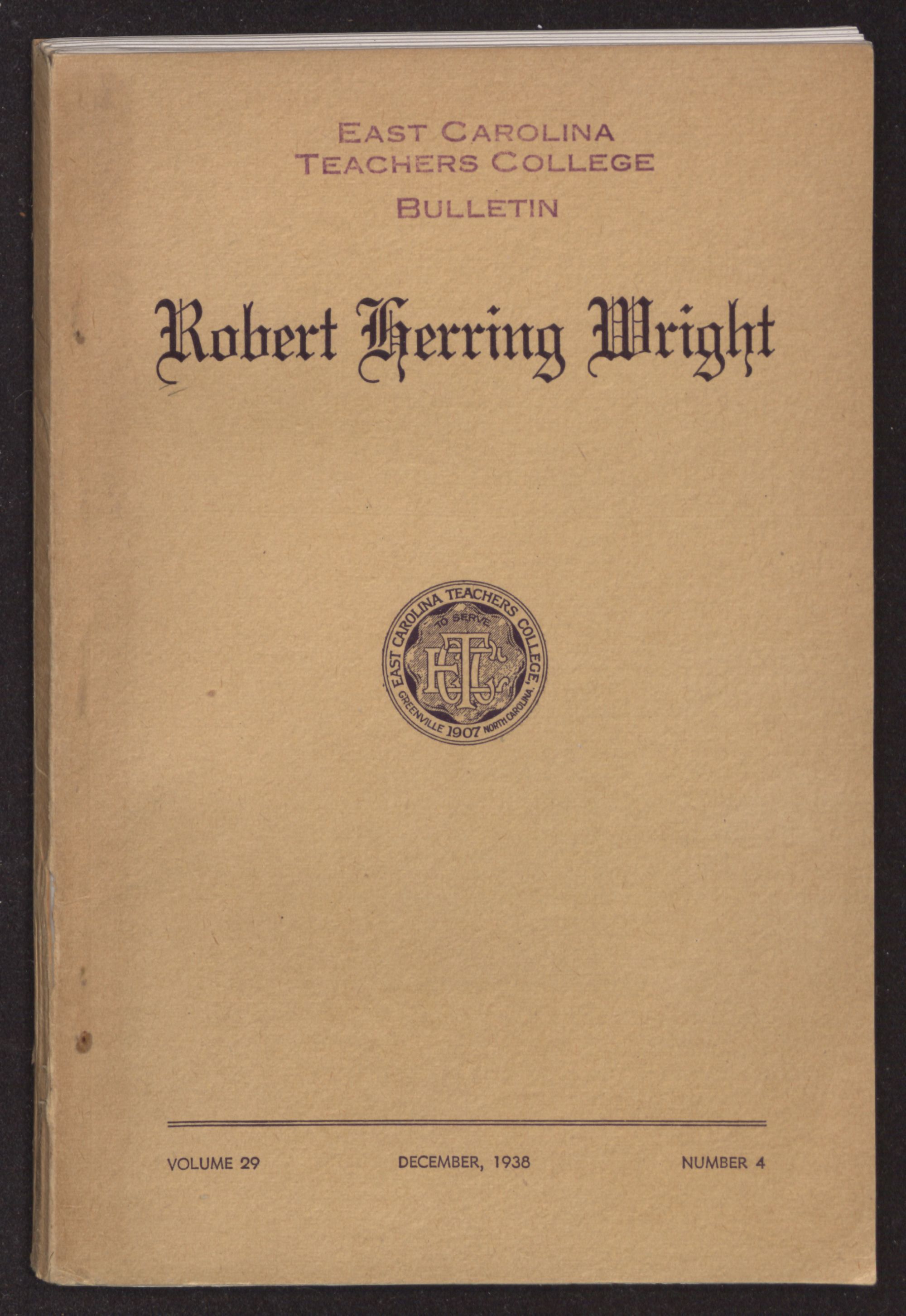 VOLUME 29 DECEMBER, 1938 NUMBER 4ROBERT HERRING WRIGHTEDUCATOR, EXECUTIVE, AND LEADER IN TEACHER TRAINING.PRESIDENT OF EAST CAROLINA TEACHERS COLLEGE (1909-1934)