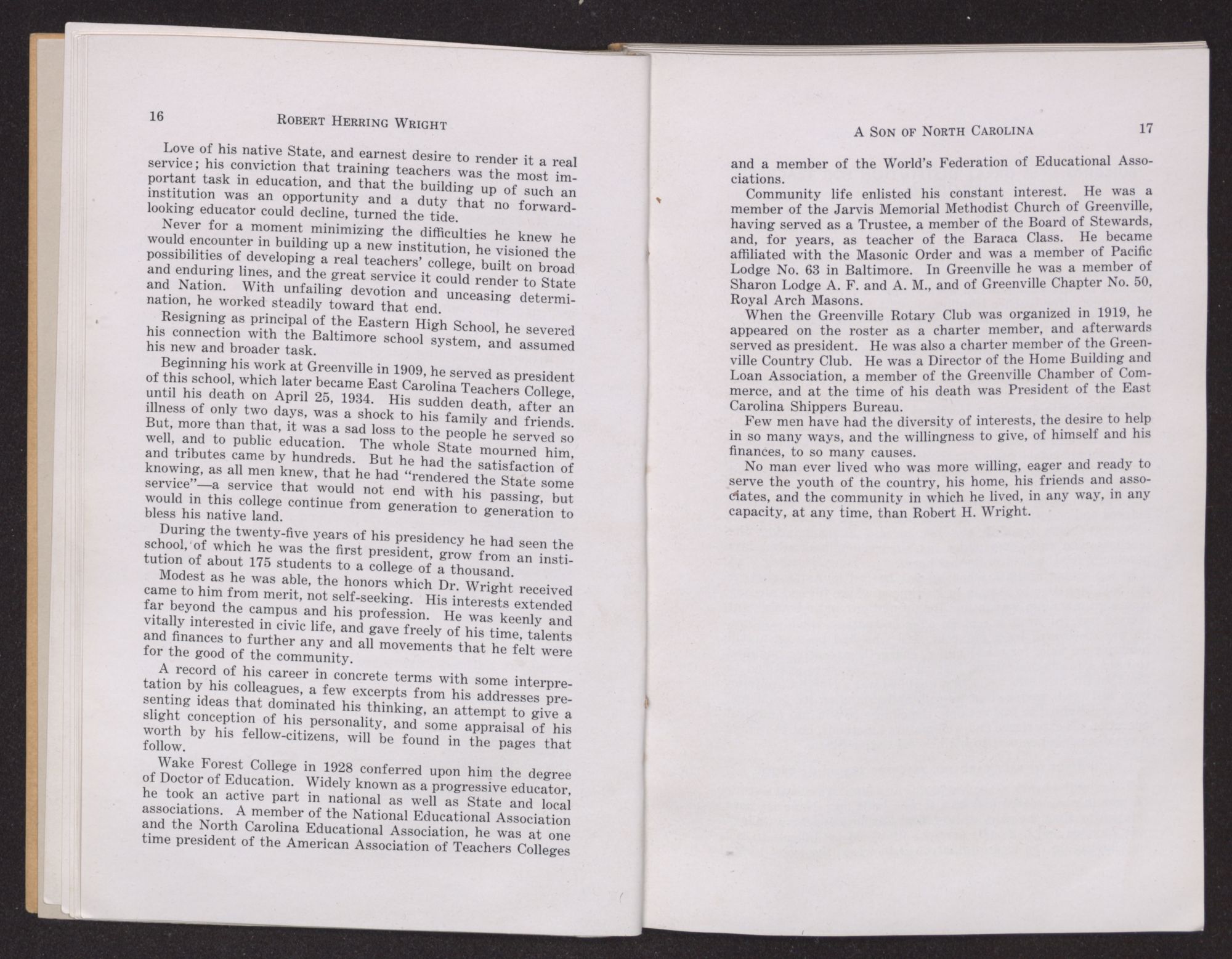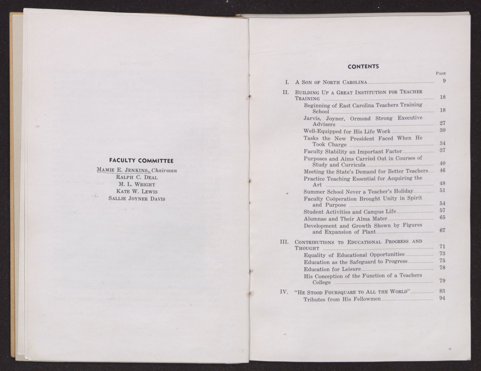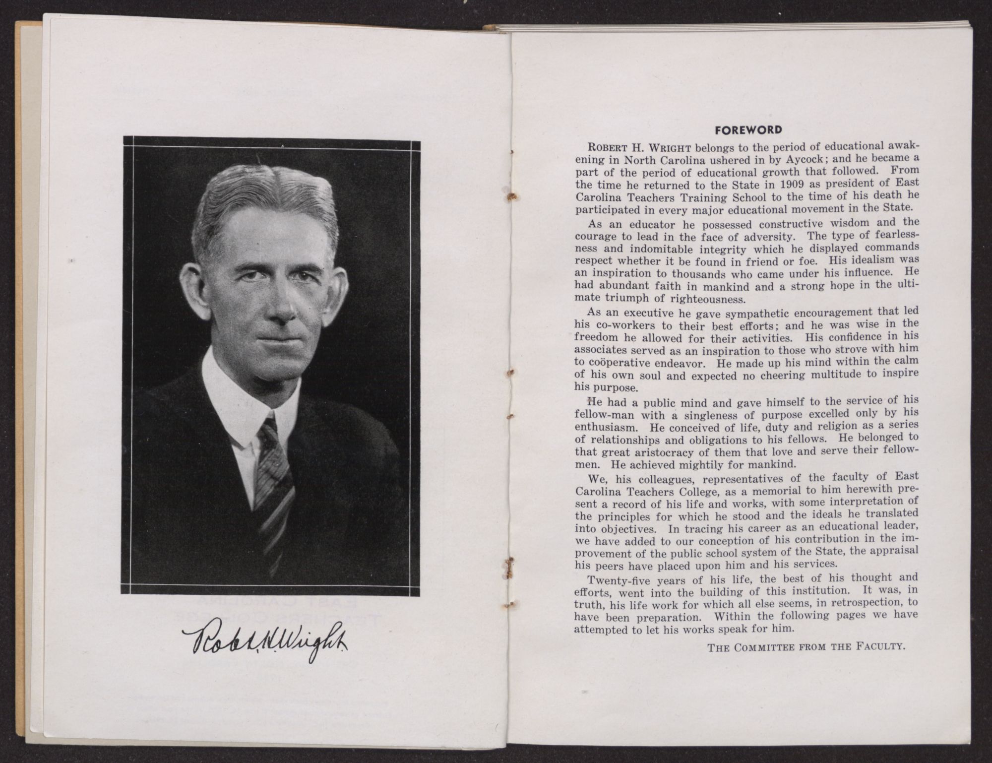We, his colleagues, representatives of the faculty of East Carolina Teachers College, as a memorial to him herewith present a record of his life and works, with some interpretation of the principles for which he stood and the ideals he translated into objectives. In tracing his career as an educational leader, we have added to our conception of his contribution in the improvement of the public school system of the State, the appraisal his peers have placed upon him and his services.