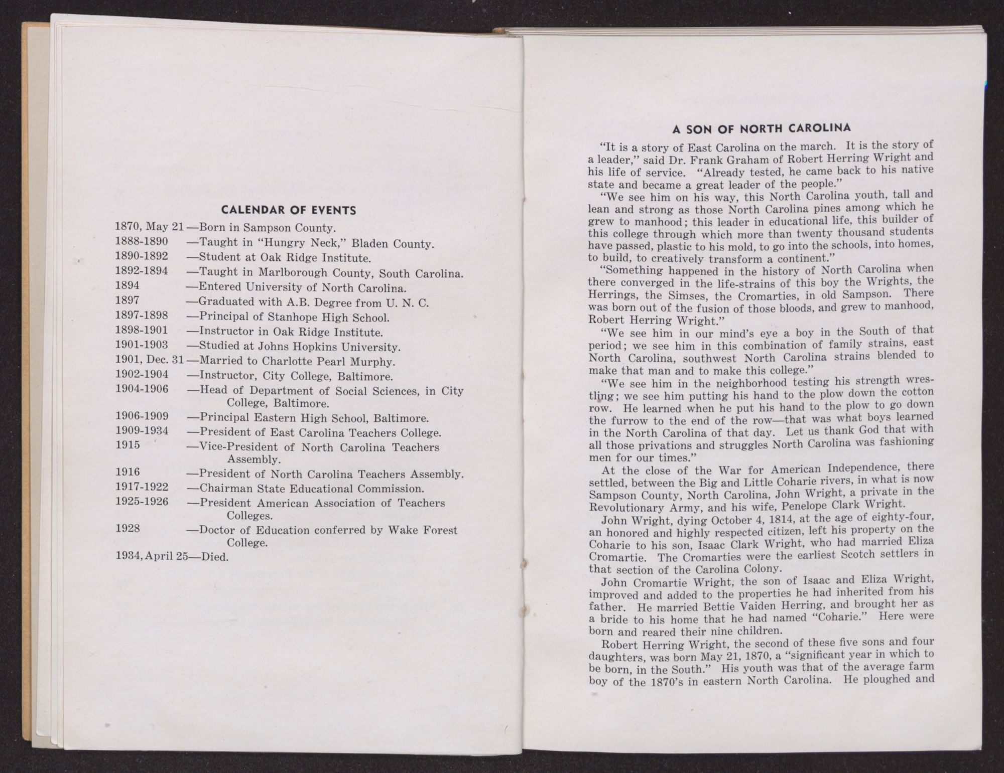 Robert Herring Wright, the second of these five sons and four daughters, was born May 21, 1870, a “significant year in which to be born, in the South.” His youth was that of the average farm boy of the 1870's in eastern North Carolina. He ploughed and