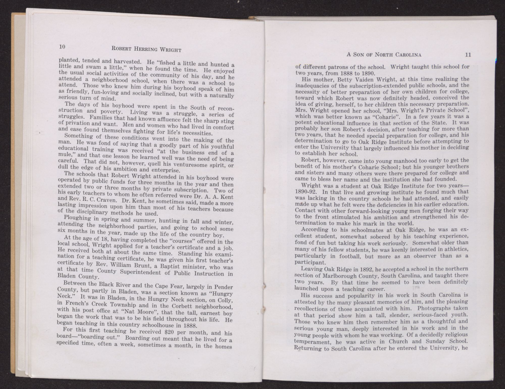 His mother, Betty Vaiden Wright, at this time realizing the inadequacies of the subscription-extended public schools, and the necessity of better preparation of her own children for college, toward which Robert was now definitely headed, conceived the idea of giving, herself, to her children this necessary preparation. Mrs. Wright opened her school, “Mrs. Wright's Private School”, which was better known as “Coharie”. In a few years it was a potent educational influence in that section of the State. It was probably her son Robert's decision, after teaching for more than two years, that he needed special preparation for college, and his determination to go to Oak Ridge Institute before attempting to enter the University that largely influenced his mother in deciding to establish her school.