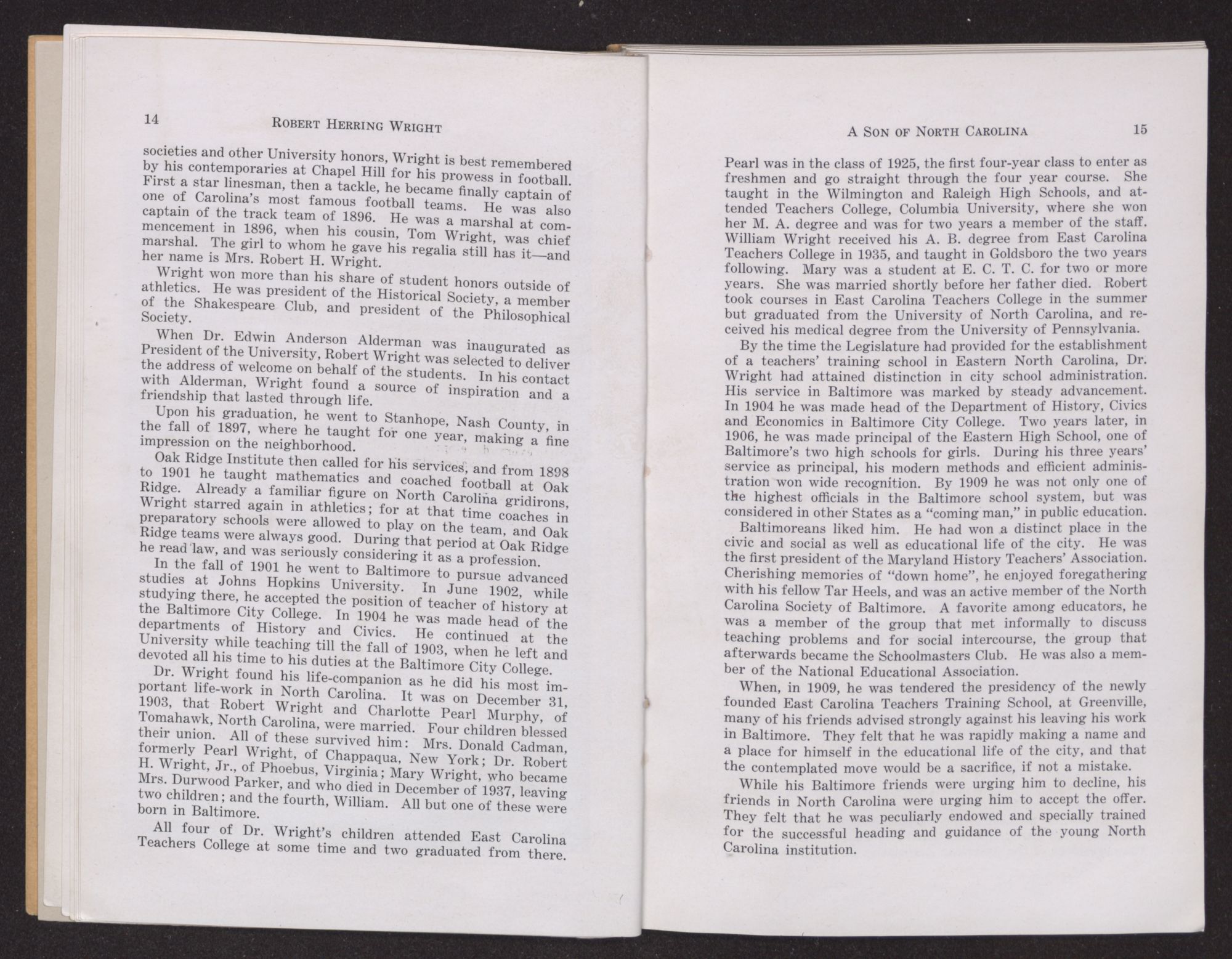 It was a time of ferment in North Carolina. The State's educational awakening was just beginning. Burning with zeal, educators were carrying on a crusade for better schools, better colleges, better teacher training, a revamping of the entire system of public education. Faculty and graduates were in the very forefront of this movement. Students caught the vision. Fired with enthusiasm, they pressed forward in the determination that the hopeless “old field” schools should be replaced by modern buildings, competent teachers and higher standards to provide our children with the educational opportunities which those of other States and sections enjoyed. Wright thus, in college, came in contact with this mighty movement in which he was to play so large a part in later years. Though his professional career in Maryland kept him out of North Carolina for quite a period, he never lost interest in its progress, kept in touch with every development, and, in a sense, shared in the State's educational advance almost from its beginning. Older than many of the students when he entered the University, realizing his educational needs and the necessity of thorough preparation for his profession. Wright was primarily interested in his studies, but found time for extra-curricular activities. Deeply interested in the Young Men's Christian Association, he became one of its officers, supporting it with his personal effort and limited finances. For years after his graduation he contributed to the Y.M.C.A. at Chapel Hill.