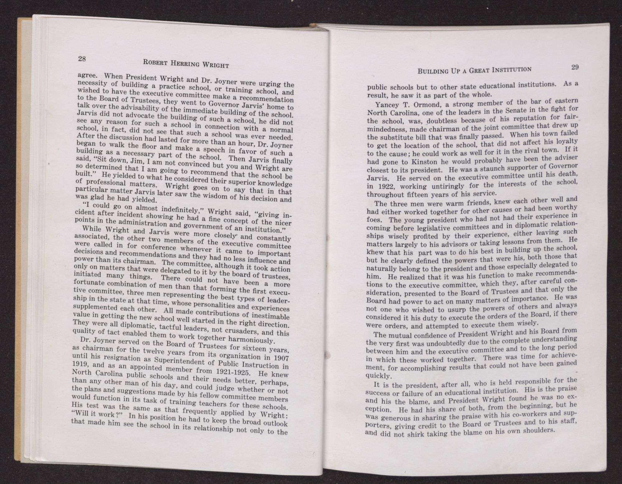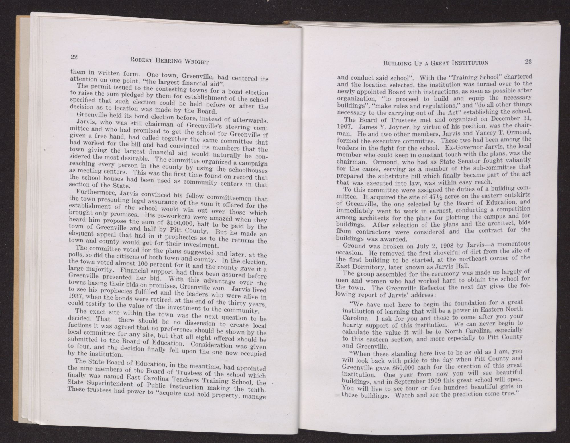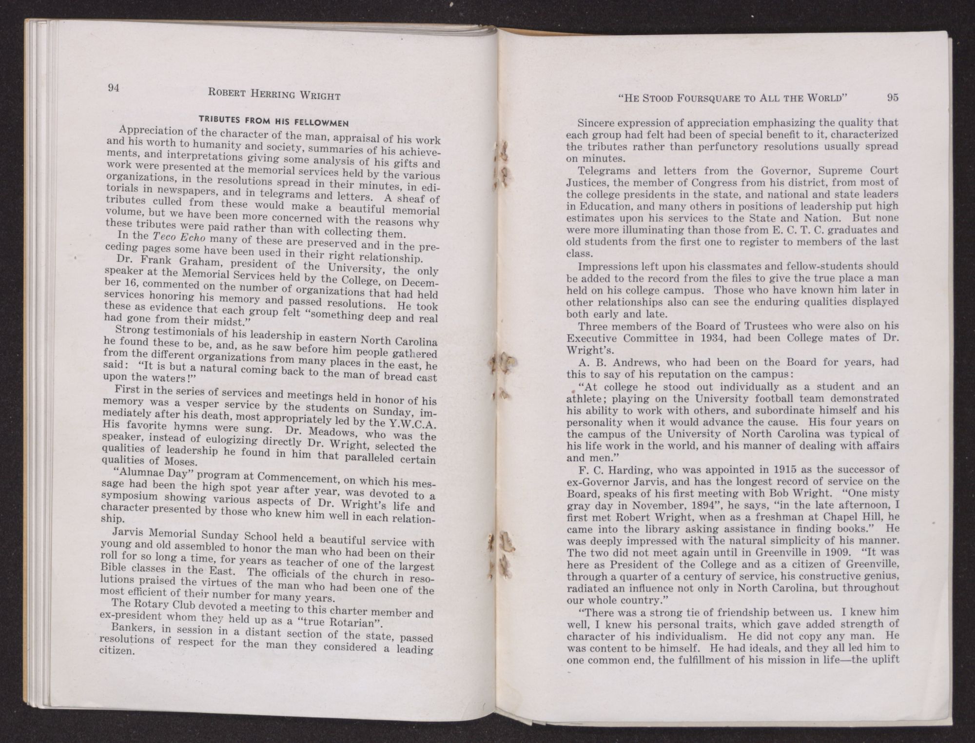 F. C. Harding, who was appointed in 1915 as the successor of ex-Governor Jarvis, and has the longest record of service on the Board, speaks of his first meeting with Bob Wright. “One misty gray day in November, 1894”, he says, “in the late afternoon, I first met Robert Wright, when as a freshman at Chapel Hill, he came into the library asking assistance in finding books.” He was deeply impressed with the natural simplicity of his manner. The two did not meet again until in Greenville in 1909. “It was here as President of the College and as a citizen of Greenville, through a quarter of a century of service, his constructive genius, radiated an influence not only in North Carolina, but throughout our whole country.”