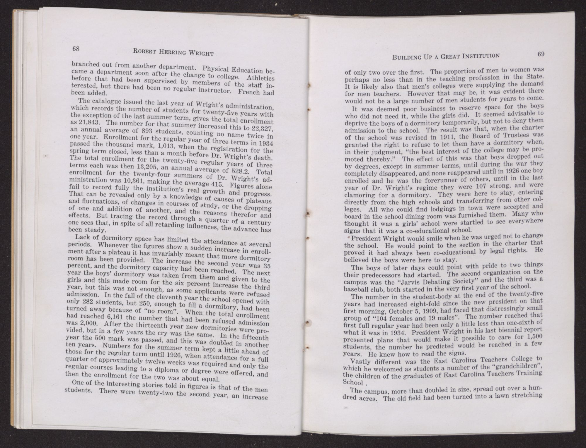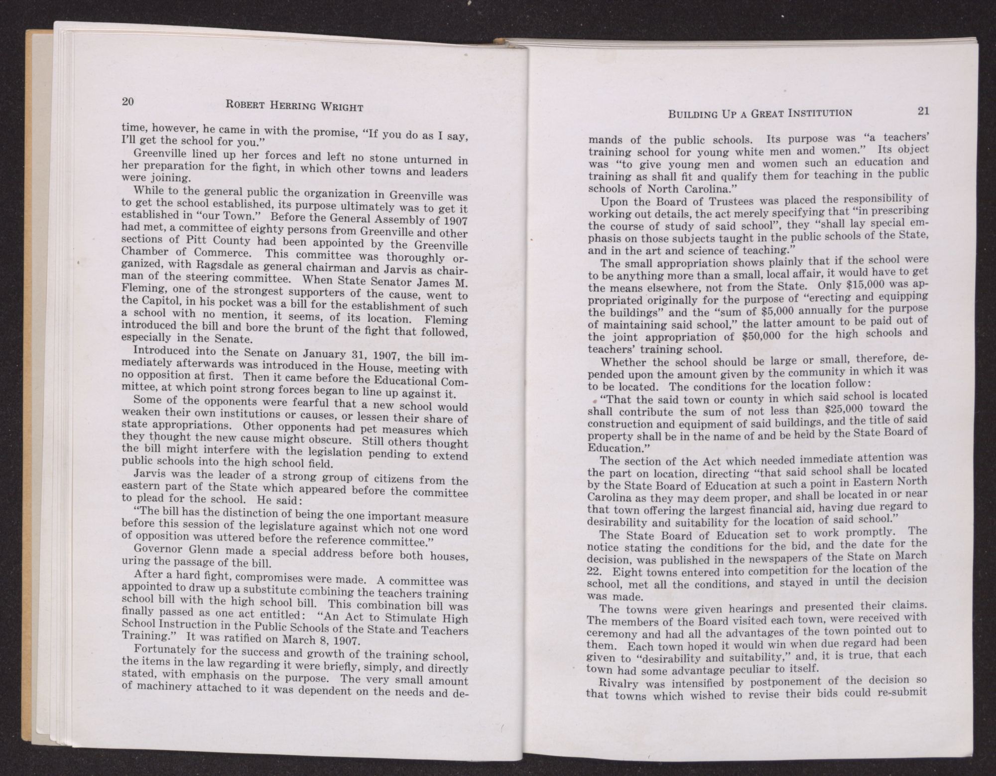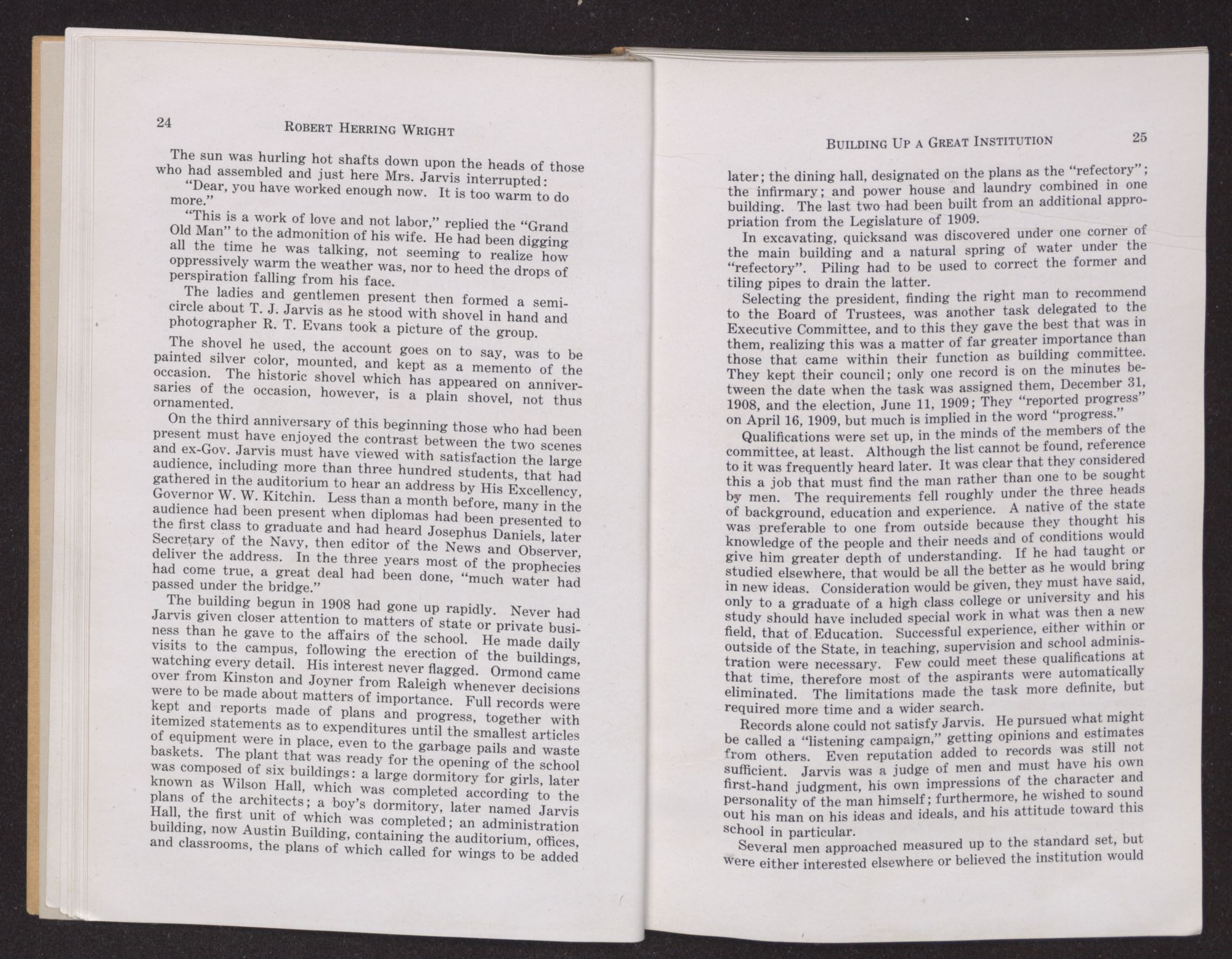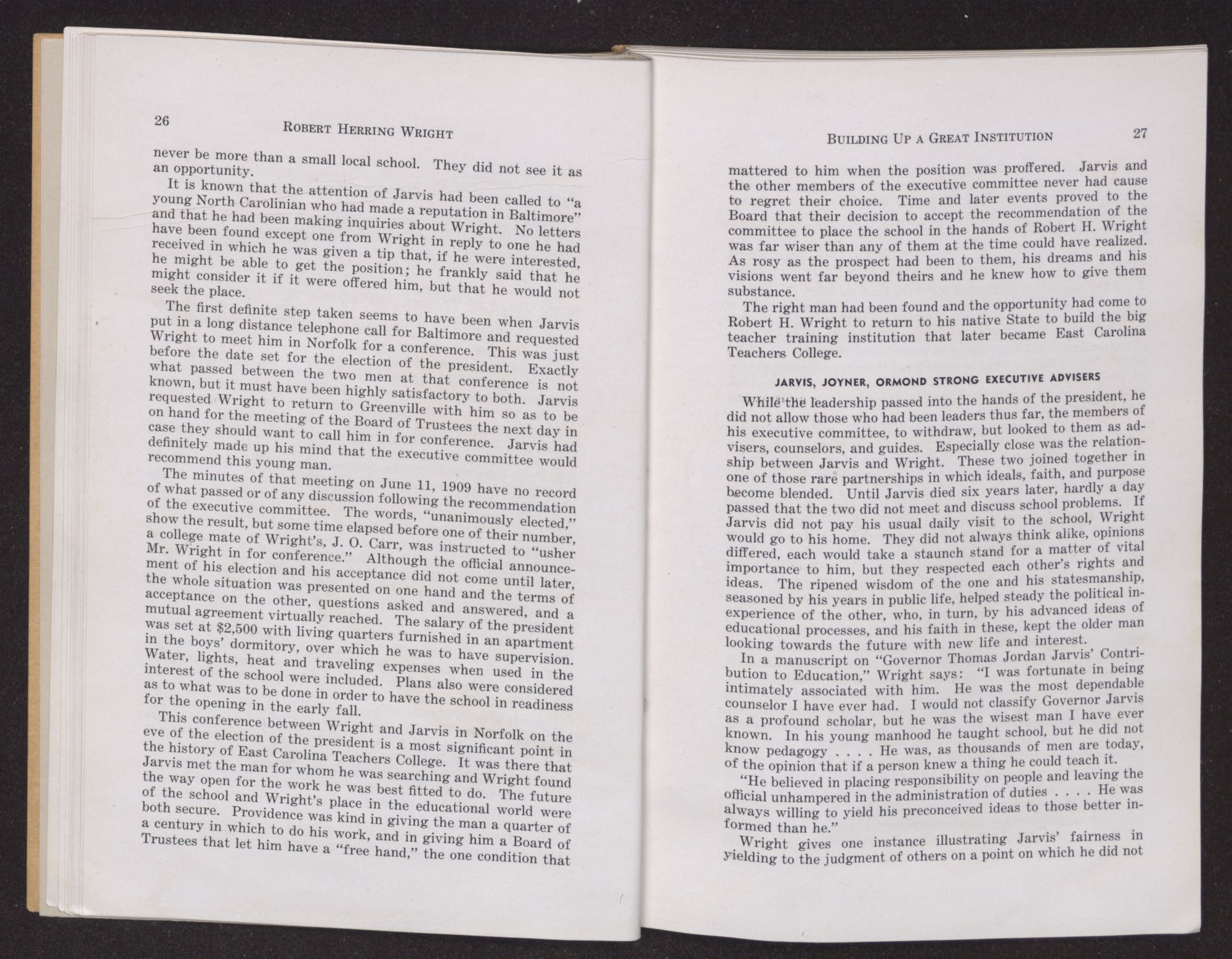 F. C. Harding, who was appointed in 1915 as the successor of ex-Governor Jarvis, and has the longest record of service on the Board, speaks of his first meeting with Bob Wright. “One misty gray day in November, 1894”, he says, “in the late afternoon, I first met Robert Wright, when as a freshman at Chapel Hill, he came into the library asking assistance in finding books.” He was deeply impressed with the natural simplicity of his manner. The two did not meet again until in Greenville in 1909. “It was here as President of the College and as a citizen of Greenville, through a quarter of a century of service, his constructive genius, radiated an influence not only in North Carolina, but throughout our whole country.”