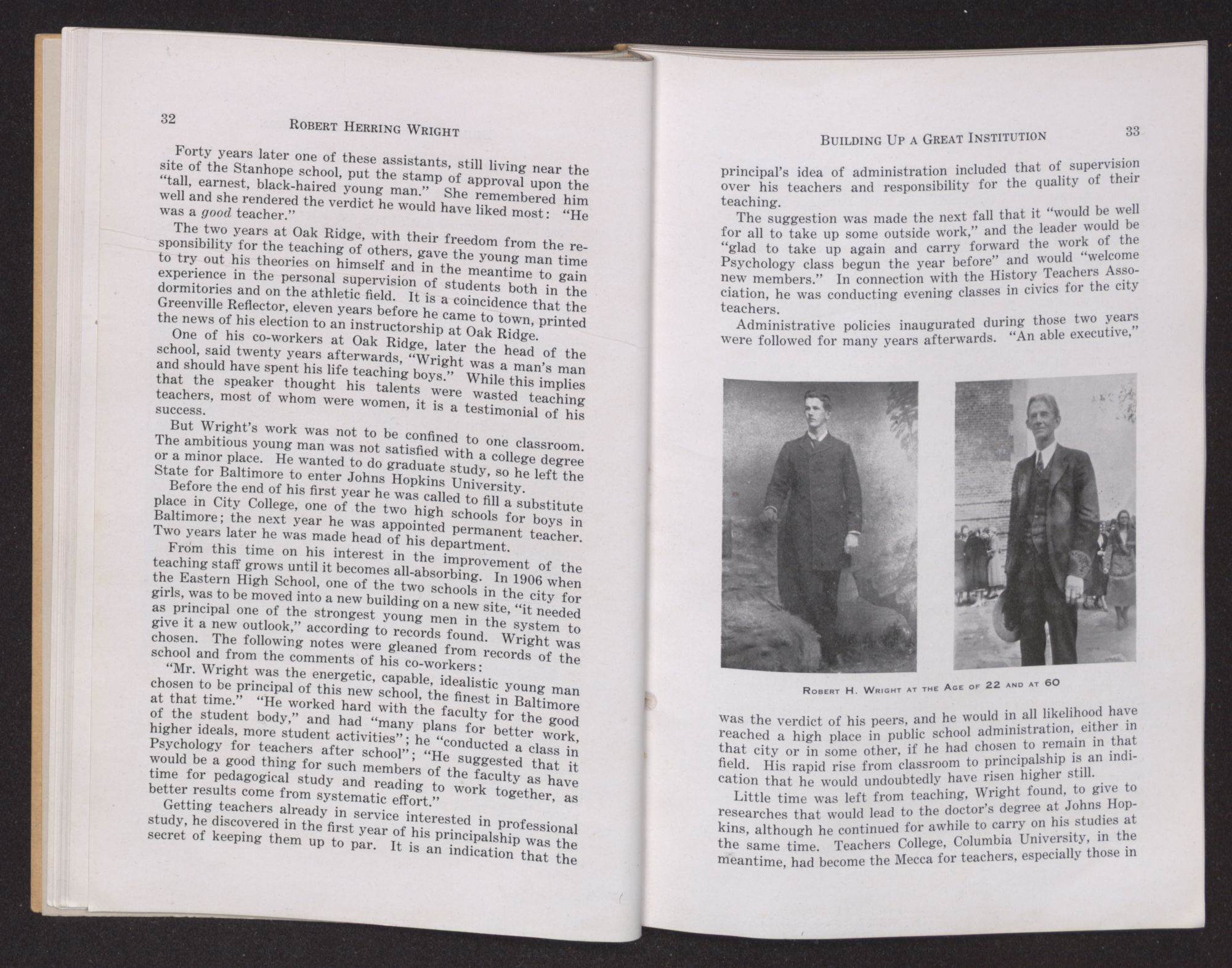 Except for his thick wavy black hair gradually graying and then whitening through the years, and his face gradually becoming etched with lines of character, there was remarkably little change in either the appearance or the manner of Robert H. Wright from the days of the boy teacher to the veteran leader in education.