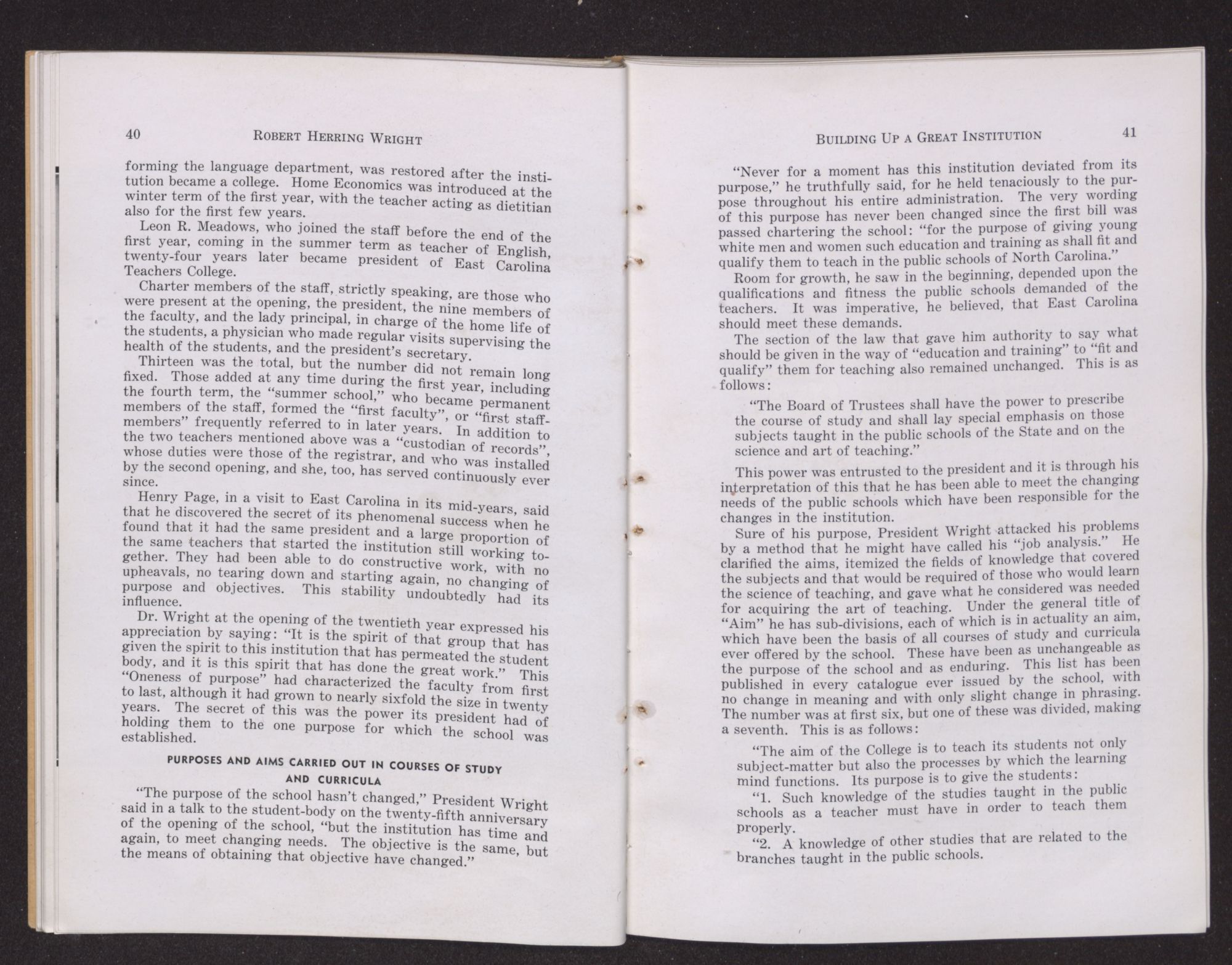purpose subsidiary to what is commonly considered a higher intellectual aristocracy. During his long tenure of office as President of East Carolina Teachers College, Wright fought off vigorously every attempt to swerve the college from its primary aim.
