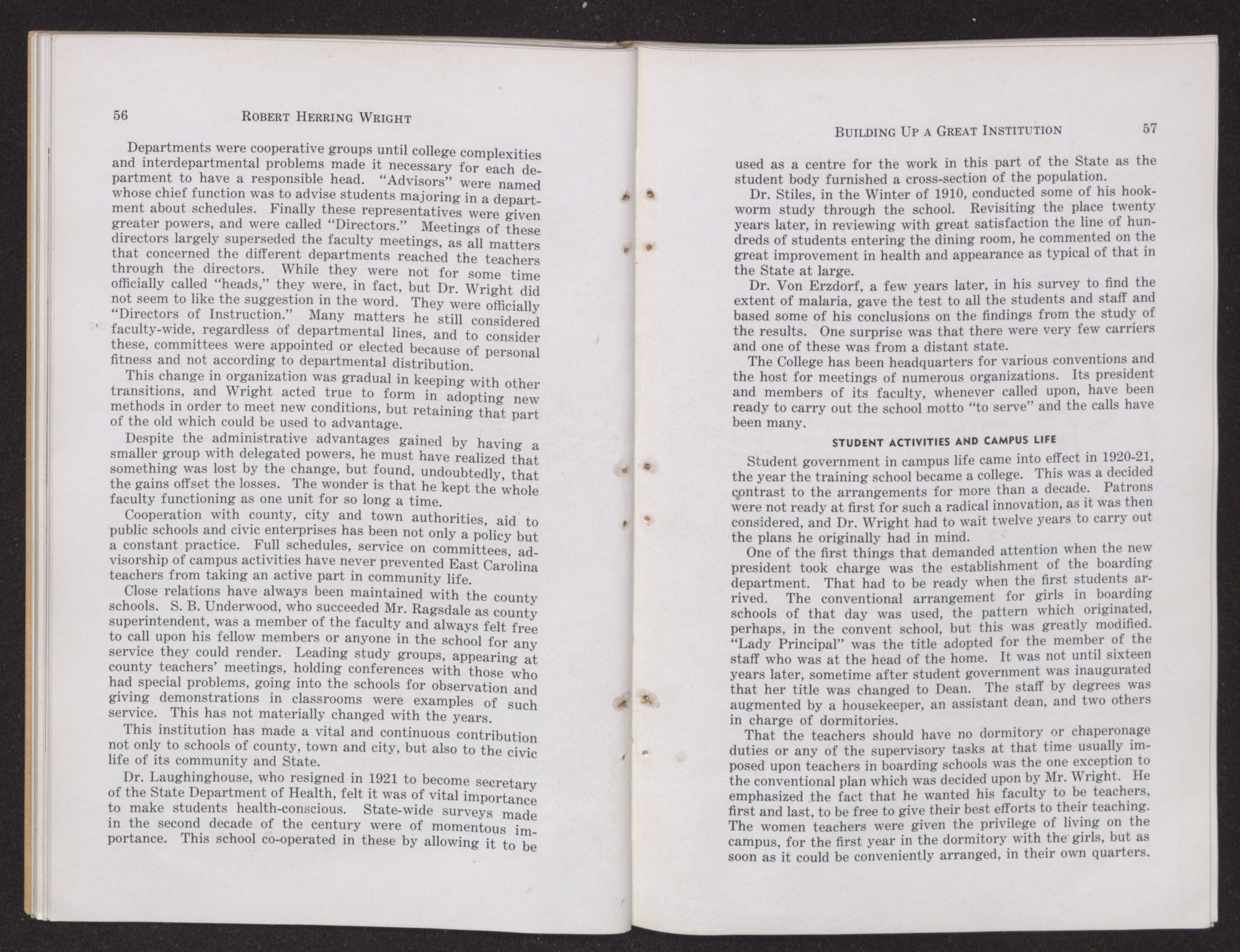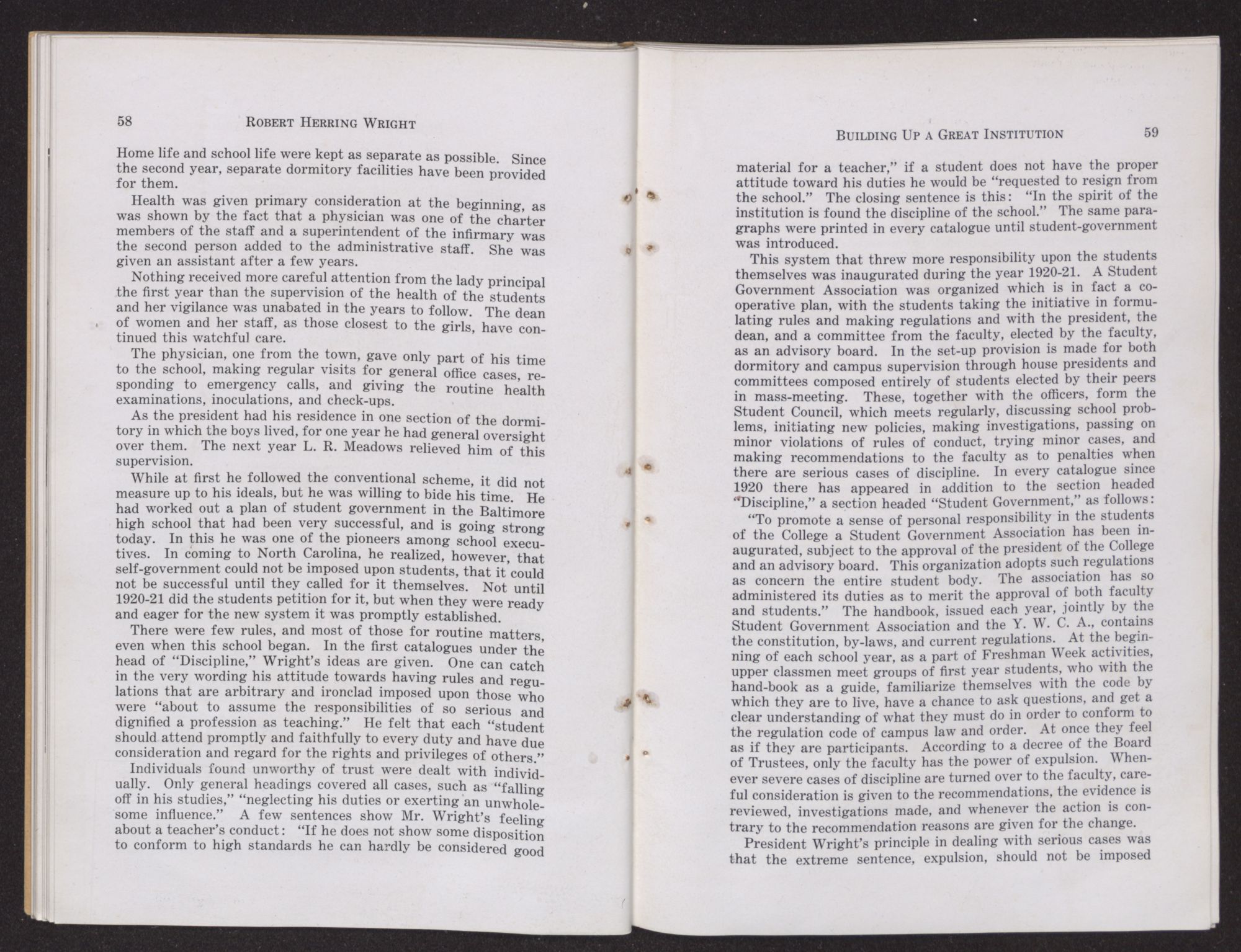 Another characteristic was his policy of suppressing no facts about the school which the public had a right to know. When there was a case of smallpox on the campus, for instance, he announced the fact calmly and thereby prevented a flood of wild rumors. The same course was taken when discipline became necessary. His statement was taken at its face value and there was no scandal.