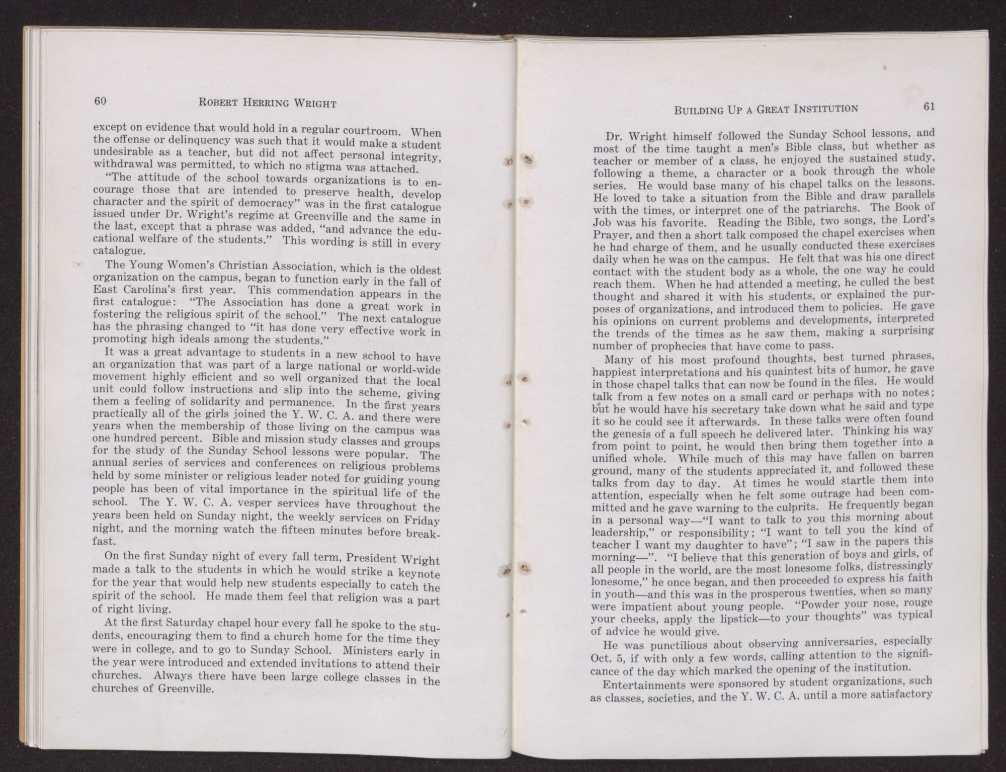 A law-abiding man who believed in following the law to the letter, Wright accepted the will of the majority without question. As long as a question was debatable, before it became a law, he took a firm stand and fought hard for his side, but the matter was settled with him after it had been decided. His course if he did not like a law was to take steps to get the law repealed or a better one substituted. To him regulations were laws governing conduct, made for the good of a majority or by a majority, and he believed they should be followed. Dead letter rules should be taken off the books. So long as they existed, it was his duty as a law-abiding citizen to obey them. A student was a citizen of the college community and it was a student's duty to abide by the regulations, or campus laws, regulating the conduct of students.