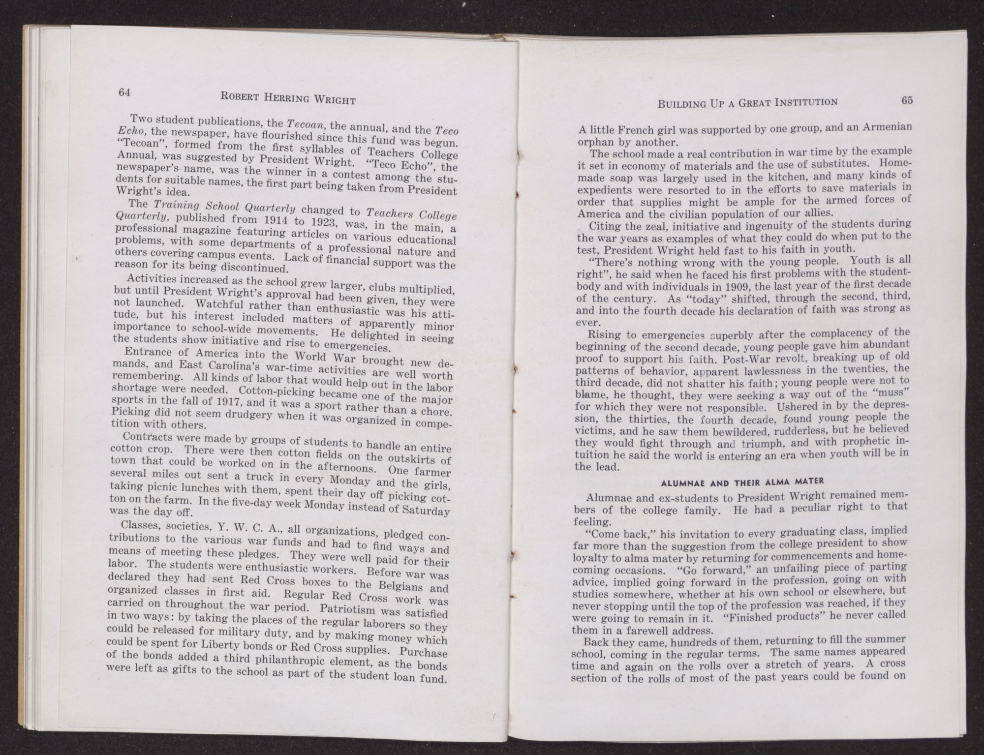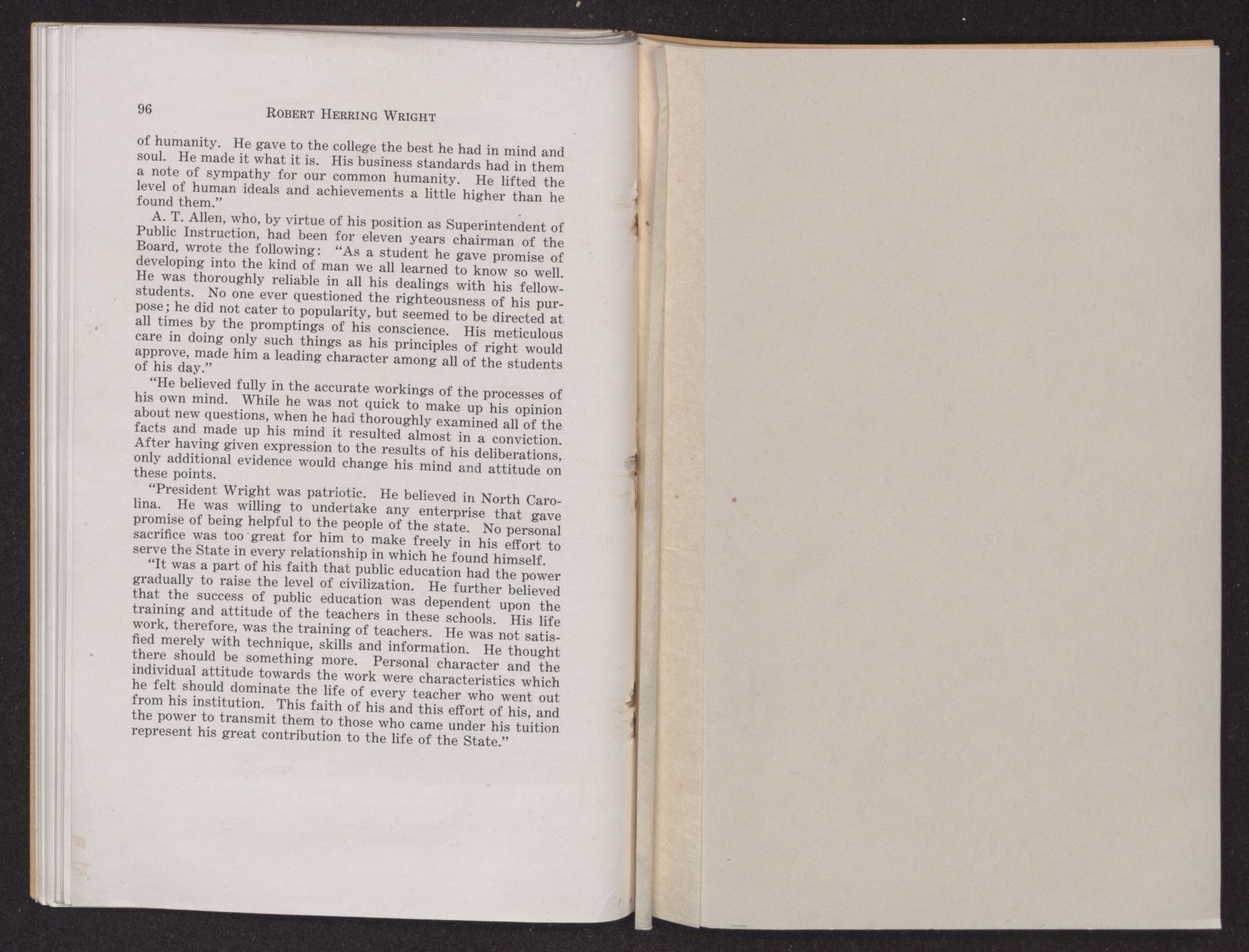 “President Wright was patriotic. He believed in North Carolina. He was willing to undertake any enterprise that gave promise of being helpful to the people of the state. No personal sacrifice was too great for him to make freely in his effort to serve the State in every relationship in which he found himself.