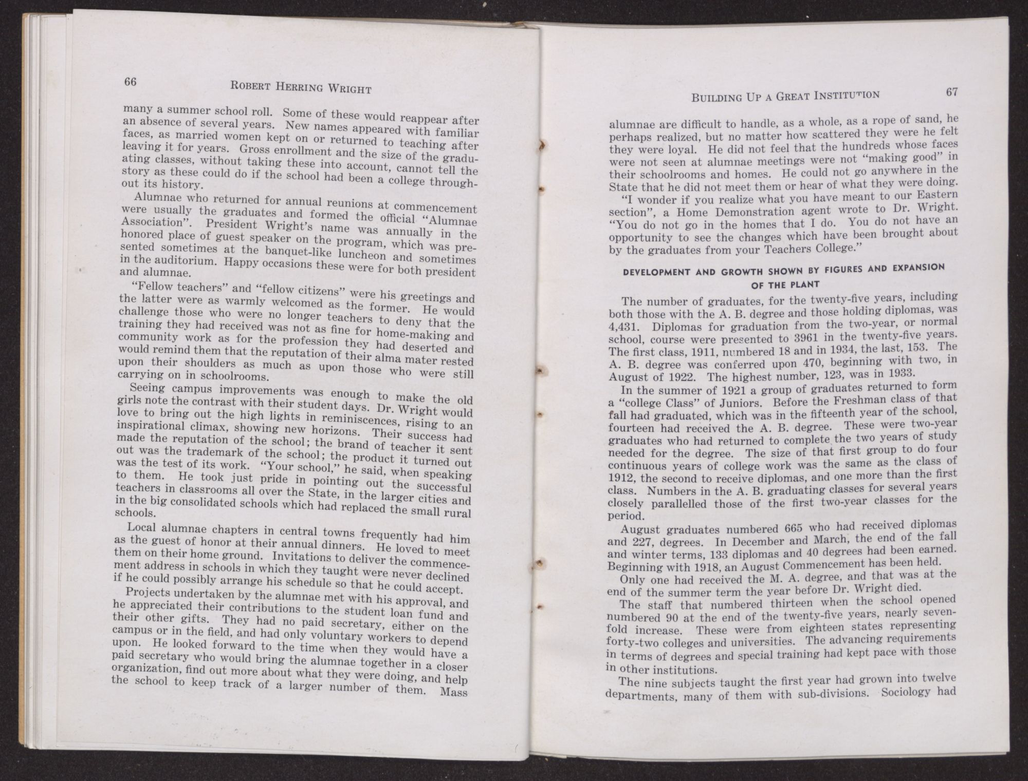Disclaiming the oft-repeated remark that he had made the college, he gave credit to the alumnae, to his administrative staff, his supporters, the Board of Trustees, friends of the institution in the community and throughout the State—to all who had helped in any way.