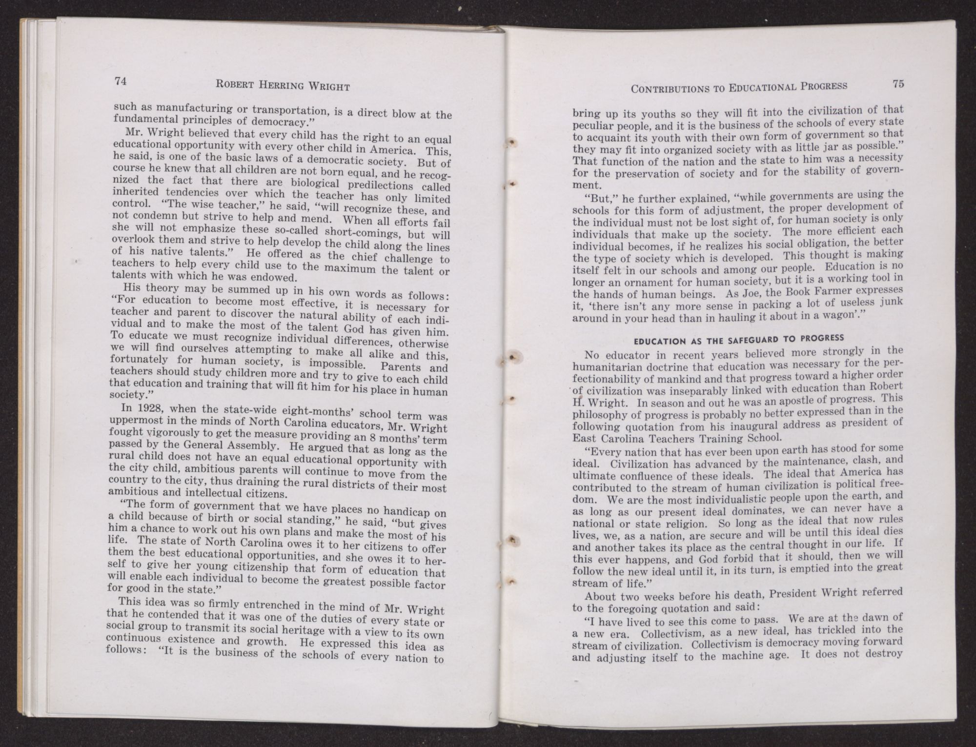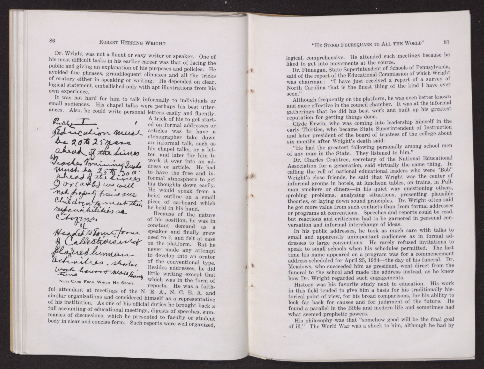 Dr. Finnegan, State Superintendent of Schools of Pennsylvania, said of the report of the Educational Commission of which Wright was chairman: “I have just received a report of a survey of North Carolina that is the finest thing of the kind I have ever seen.”