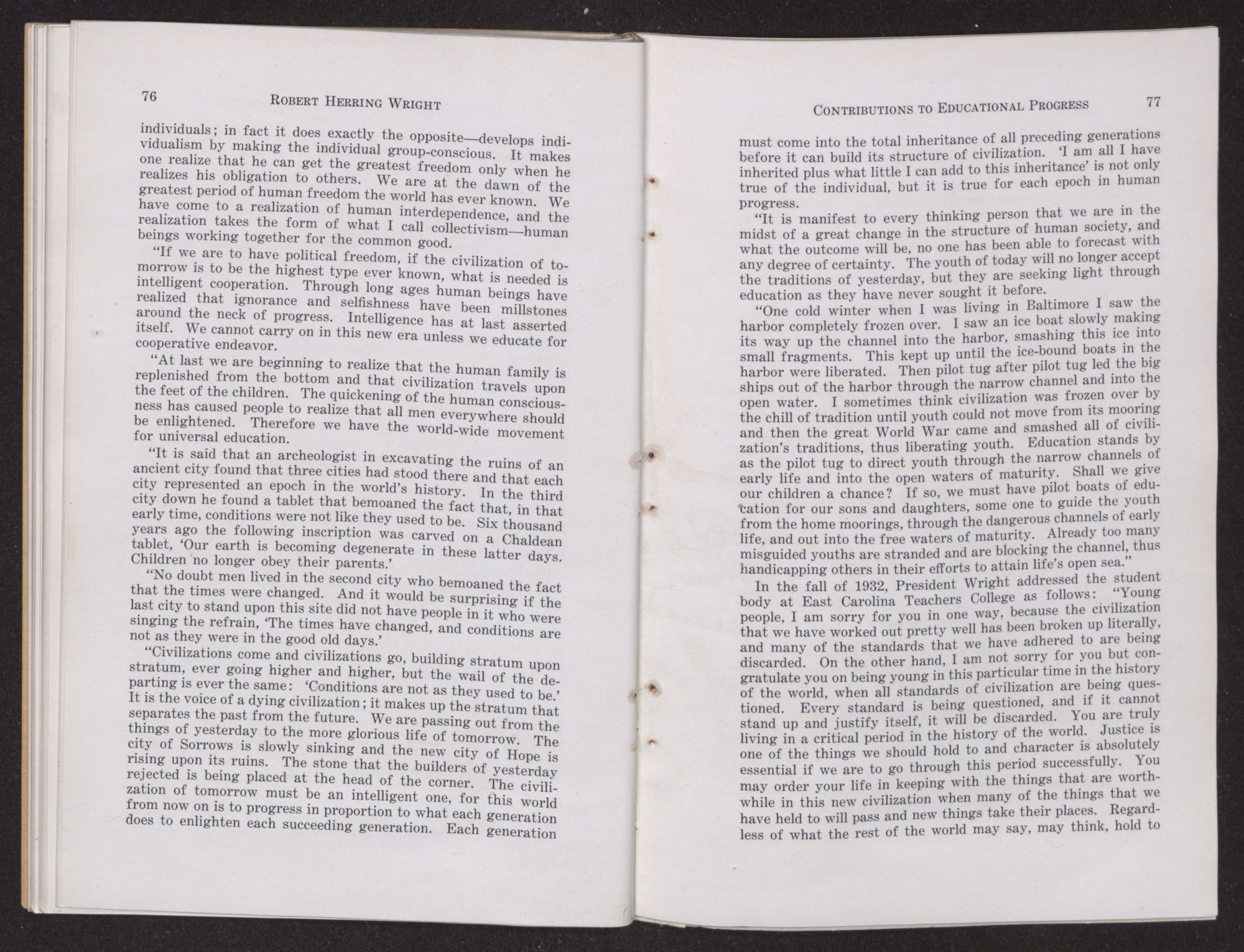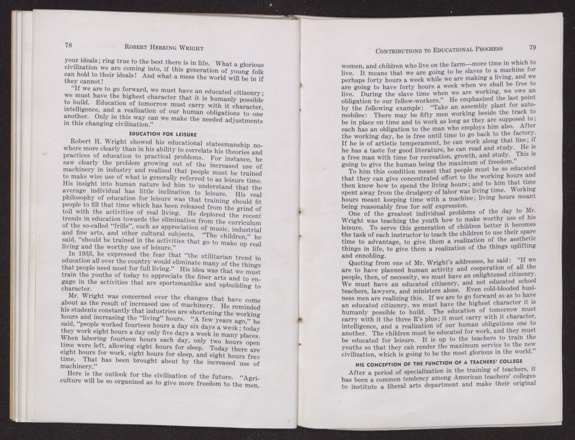 Quoting from one of Mr. Wright's addresses, he said: “If we are to have planned human activity and cooperation of all the people, then, of necessity, we must have an enlightened citizenry. We must have an educated citizenry, and not educated school teachers, lawyers, and ministers alone. Even cold-blooded business men are realizing this. If we are to go forward so as to have an educated citizenry, we must have the highest character it is humanly possible to build. The education of tomorrow must carry with it the three R's plus; it must carry with it character, intelligence, and a realization of our human obligations one to another. The children must be educated for work, and they must be educated for leisure. It is up to the teachers to train the youths so that they can render the maximum service to the new civilization, which is going to be the most glorious in the world.”