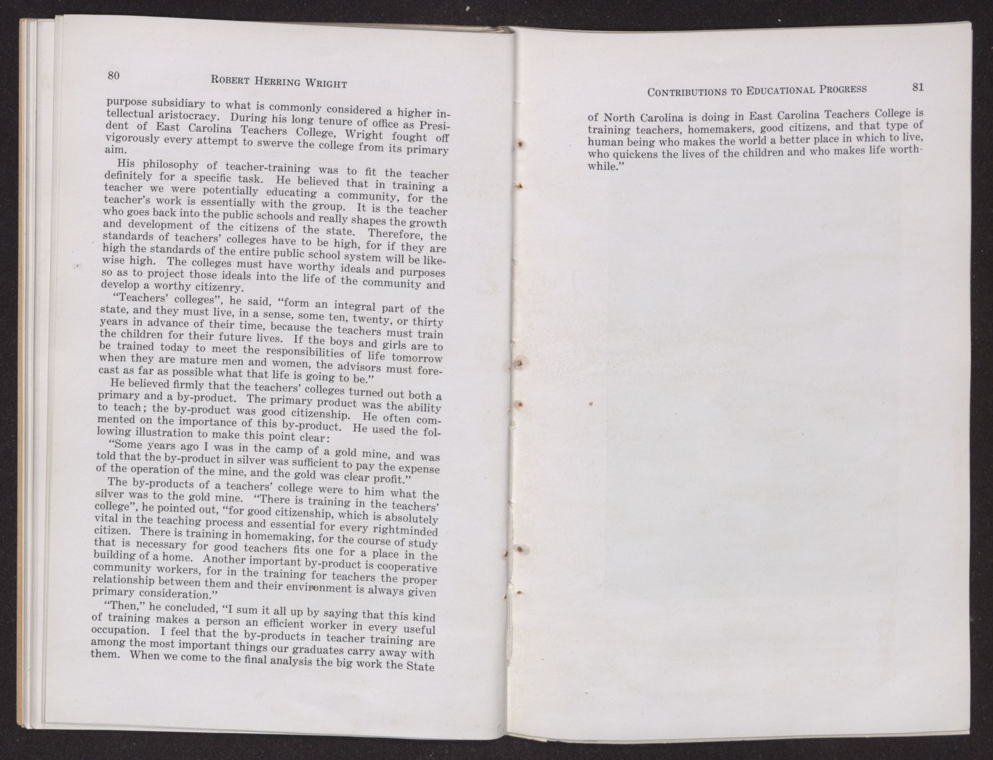 of North Carolina is doing in East Carolina Teachers College is training teachers, homemakers, good citizens, and that type of human being who makes the world a better place in which to live, who quickens the lives of the children and who makes life worthwhile.”