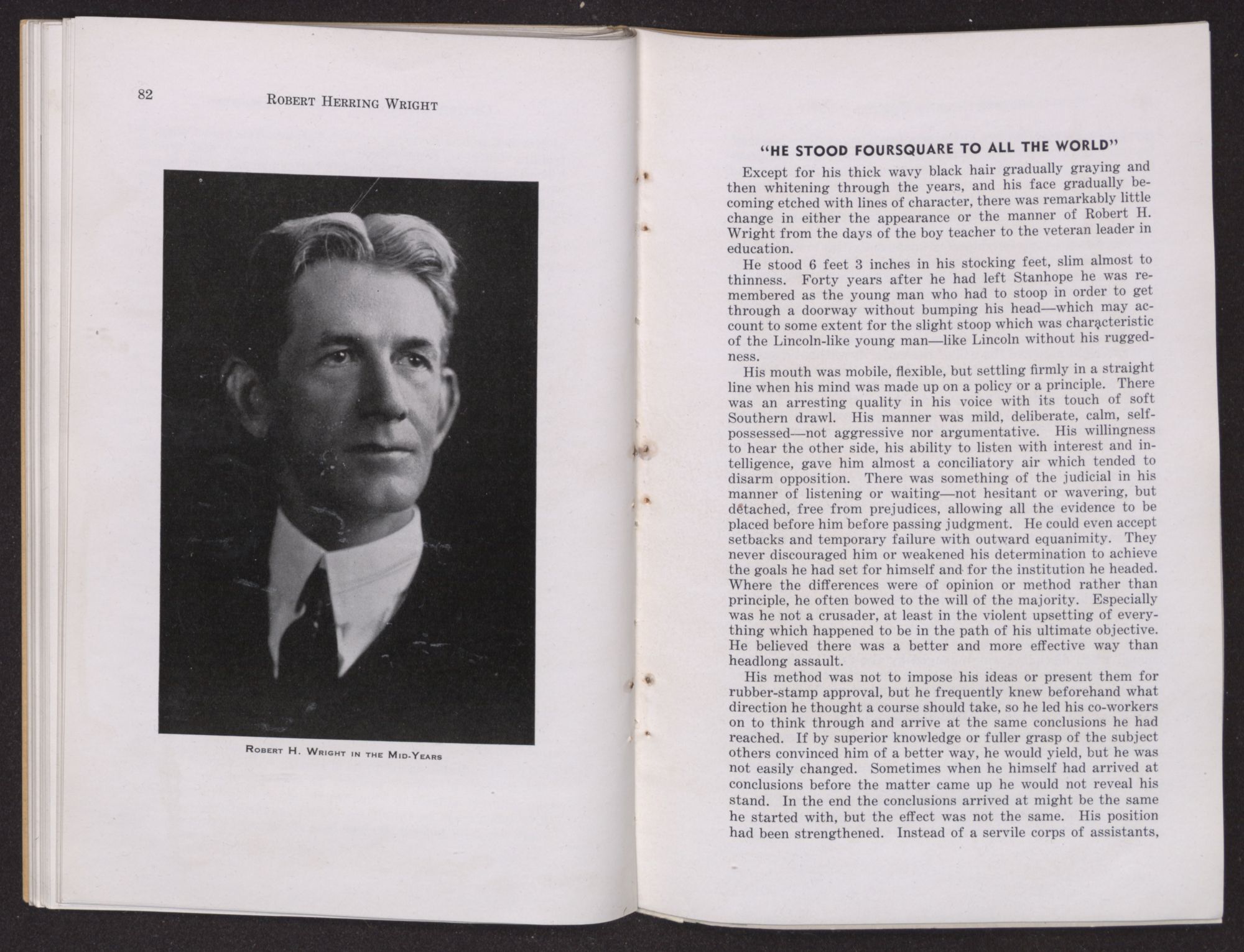 His mouth was mobile, flexible, but settling firmly in a straight line when his mind was made up on a policy or a principle. There was an arresting quality in his voice with its touch of soft Southern drawl. His manner was mild, deliberate, calm, self-possessed—not aggressive nor argumentative. His willingness to hear the other side, his ability to listen with interest and intelligence, gave him almost a conciliatory air which tended to disarm opposition. There was something of the judicial in his manner of listening or waiting—not hesitant or wavering, but detached, free from prejudices, allowing all the evidence to be placed before him before passing judgment. He could even accept setbacks and temporary failure with outward equanimity. They never discouraged him or weakened his determination to achieve the goals he had set for himself and for the institution he headed. Where the differences were of opinion or method rather than principle, he often bowed to the will of the majority. Especially was he not a crusader, at least in the violent upsetting of everything which happened to be in the path of his ultimate objective. He believed there was a better and more effective way than headlong assault.