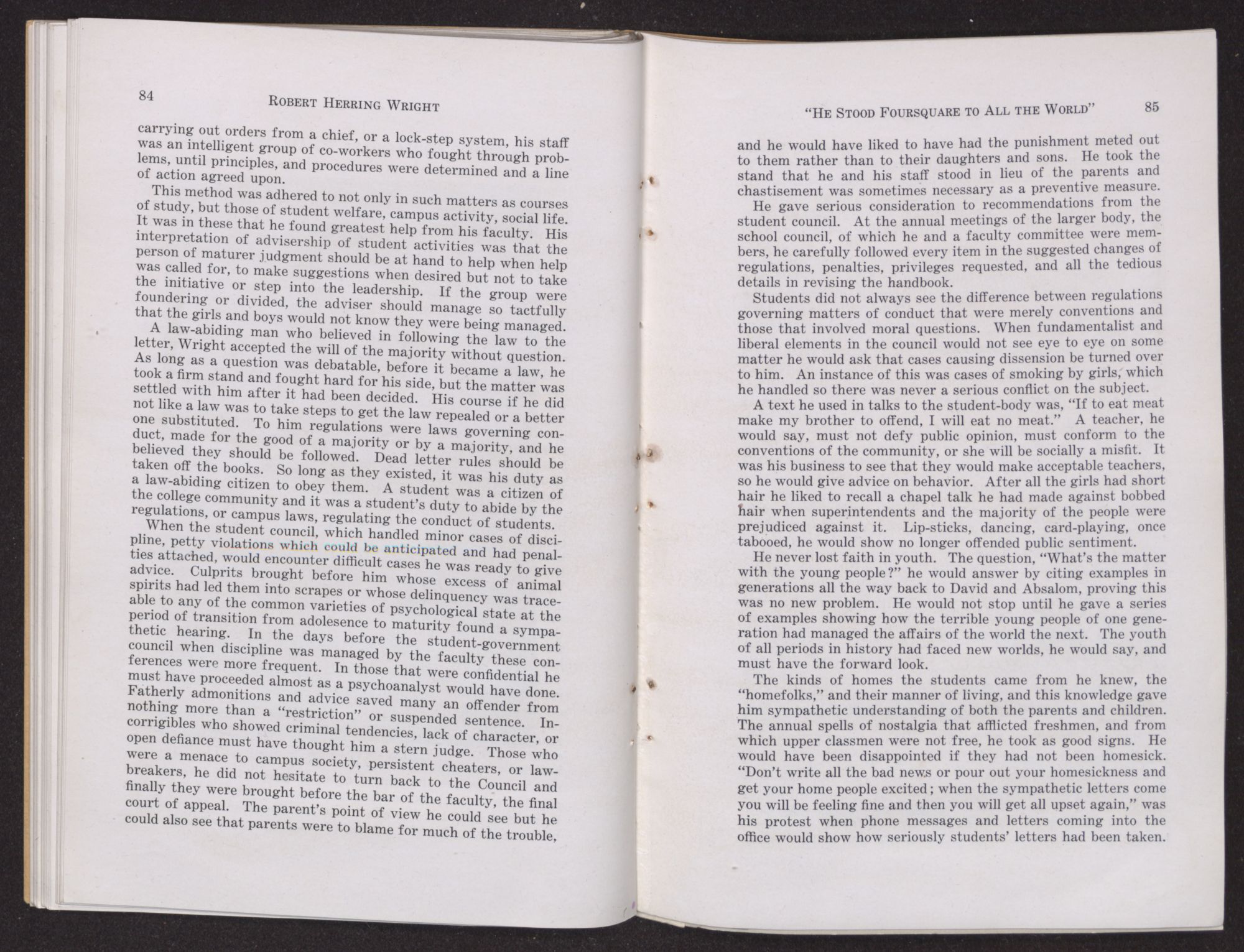 When the student council, which handled minor cases of discipline, petty violations which could be anticipated and had penalties attached, would encounter difficult cases he was ready to give advice. Culprits brought before him whose excess of animal spirits had led them into scrapes or whose delinquency was traceable to any of the common varieties of psychological state at the period of transition from adolesence to maturity found a sympathetic hearing. In the days before the student-government council when discipline was managed by the faculty these conferences were more frequent. In those that were confidential he must have proceeded almost as a psychoanalyst would have done. Fatherly admonitions and advice saved many an offender from nothing more than a “restriction” or suspended sentence. Incorrigibles who showed criminal tendencies, lack of character, or open defiance must have thought him a stern judge. Those who were a menace to campus society, persistent cheaters, or law-breakers, he did not hesitate to turn back to the Council and finally they were brought before the bar of the faculty, the final court of appeal. The parent's point of view he could see but he could also see that parents were to blame for much of the trouble,