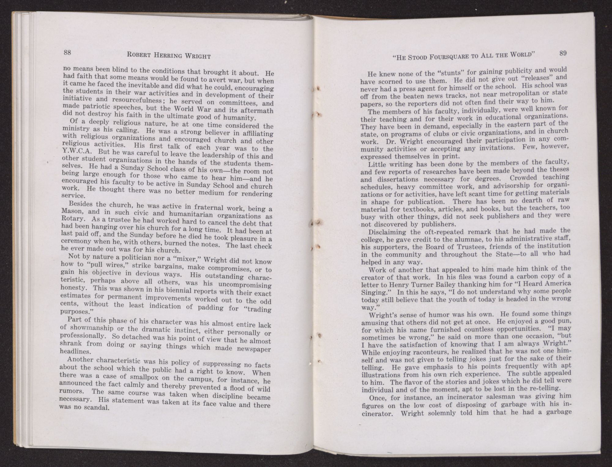 Wright's sense of humor was his own. He found some things amusing that others did not get at once. He enjoyed a good pun, for which his name furnished countless opportunities. “I may sometimes be wrong,” he said on more than one occasion, “but I have the satisfaction of knowing that I am always Wright.” While enjoying raconteurs, he realized that he was not one himself and was not given to telling jokes just for the sake of their telling. He gave emphasis to his points frequently with apt illustrations from his own rich experience. The subtle appealed to him. The flavor of the stories and jokes which he did tell were individual and of the moment, apt to be lost in the re-telling.