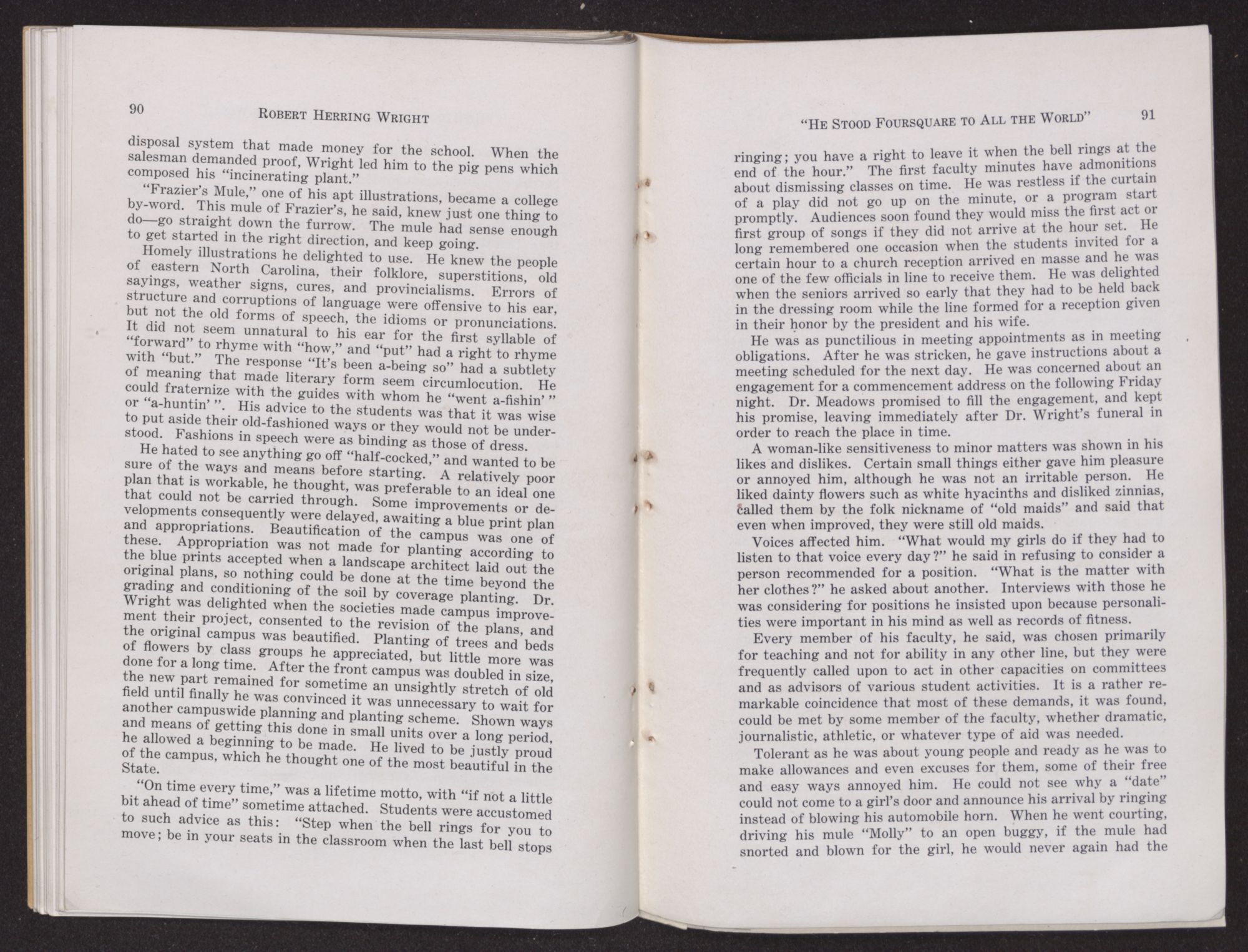He was as punctilious in meeting appointments as in meeting obligations. After he was stricken, he gave instructions about a meeting scheduled for the next day. He was concerned about an engagement for a commencement address on the following Friday night. Dr. Meadows promised to fill the engagement, and kept his promise, leaving immediately after Dr. Wright's funeral in order to reach the place in time.