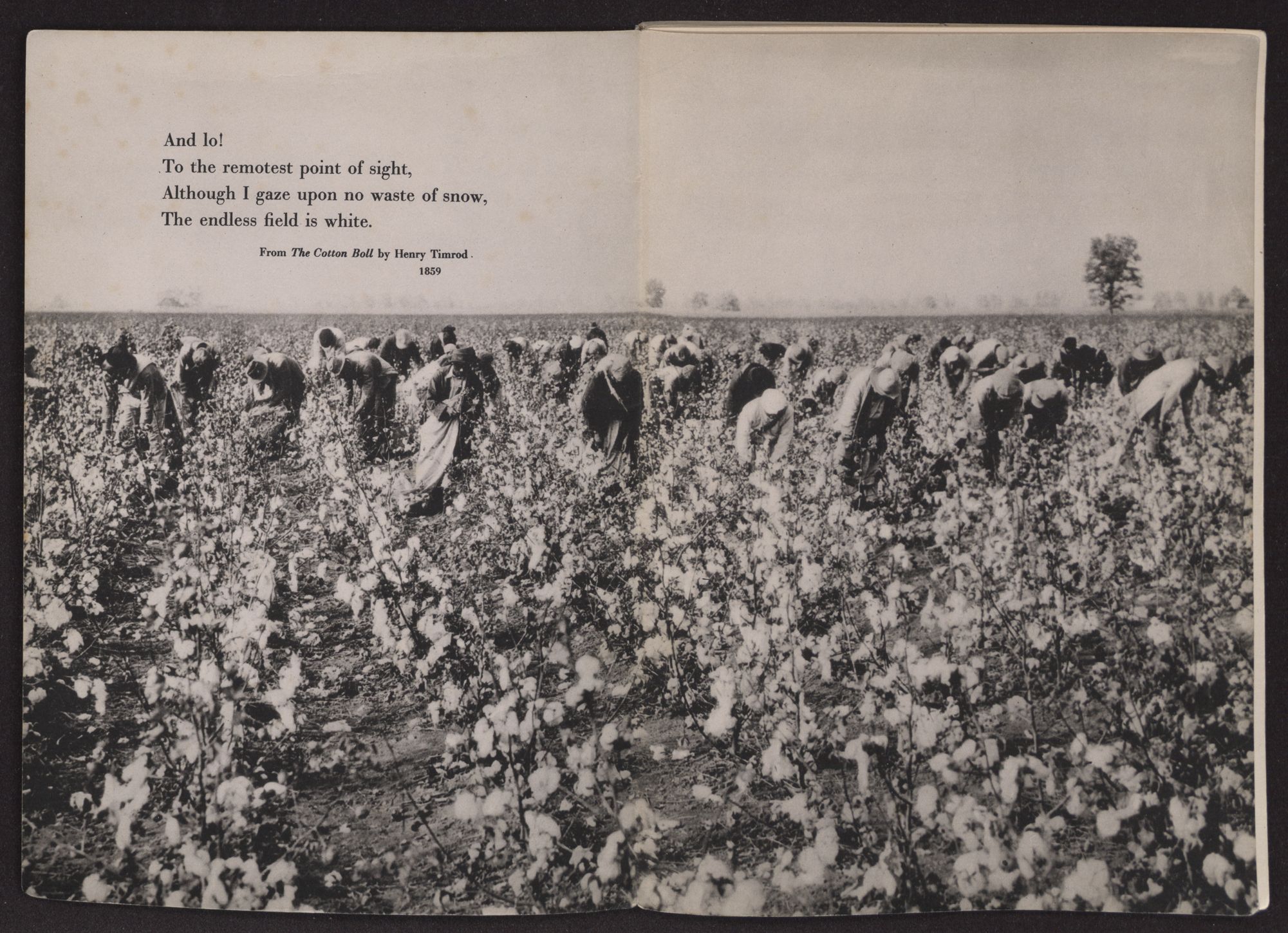 And lo!To the remotest point of sight,Although I gaze upon no waste of snow,The endless field is white.From The Cotton Boll by Henry Timrod1859