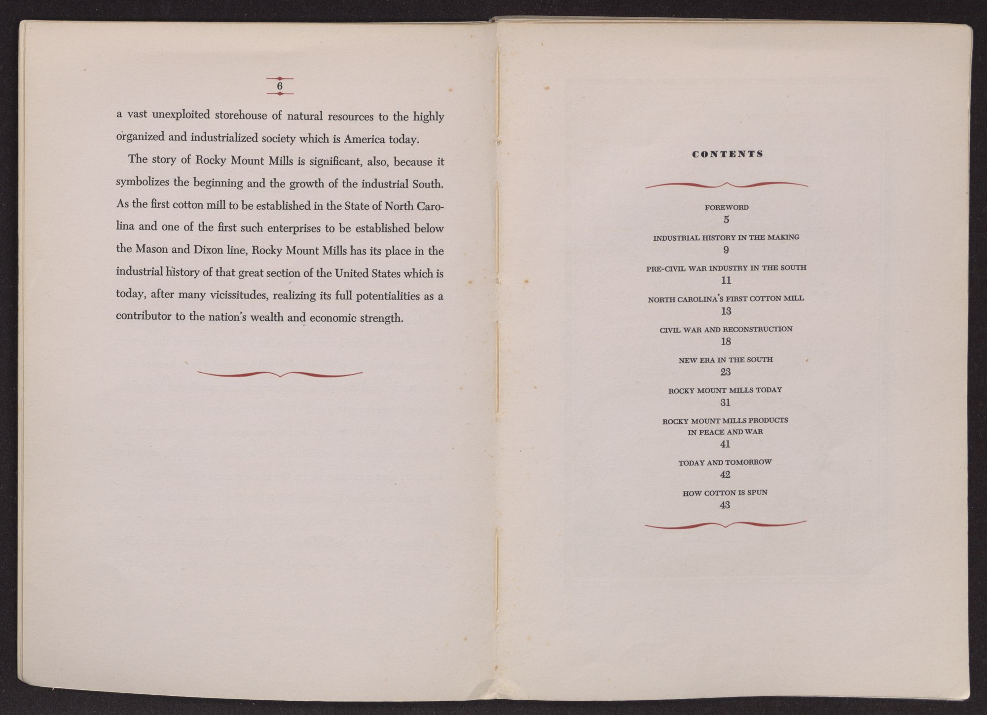 FOREWORDThis is the story of Rocky Mount Mills — a story which covers a span of one hundred and twenty-five years and traces the growth of one of America's pioneer industrial companies from its inception as a purely local enterprise to its present-day position as one of the most efficient operating units in the cotton spinning industry.